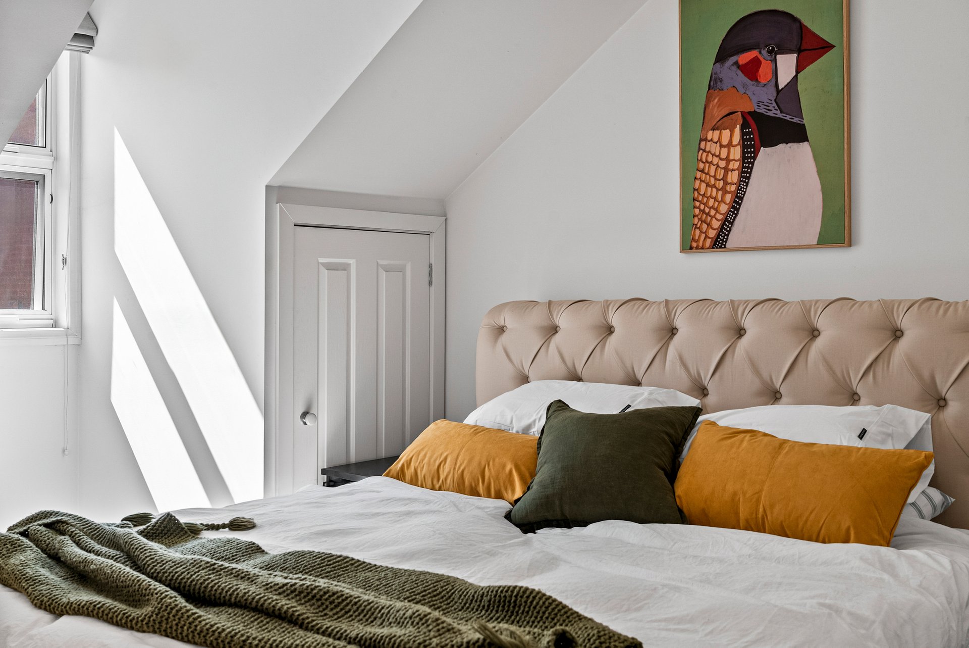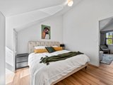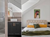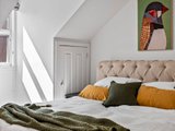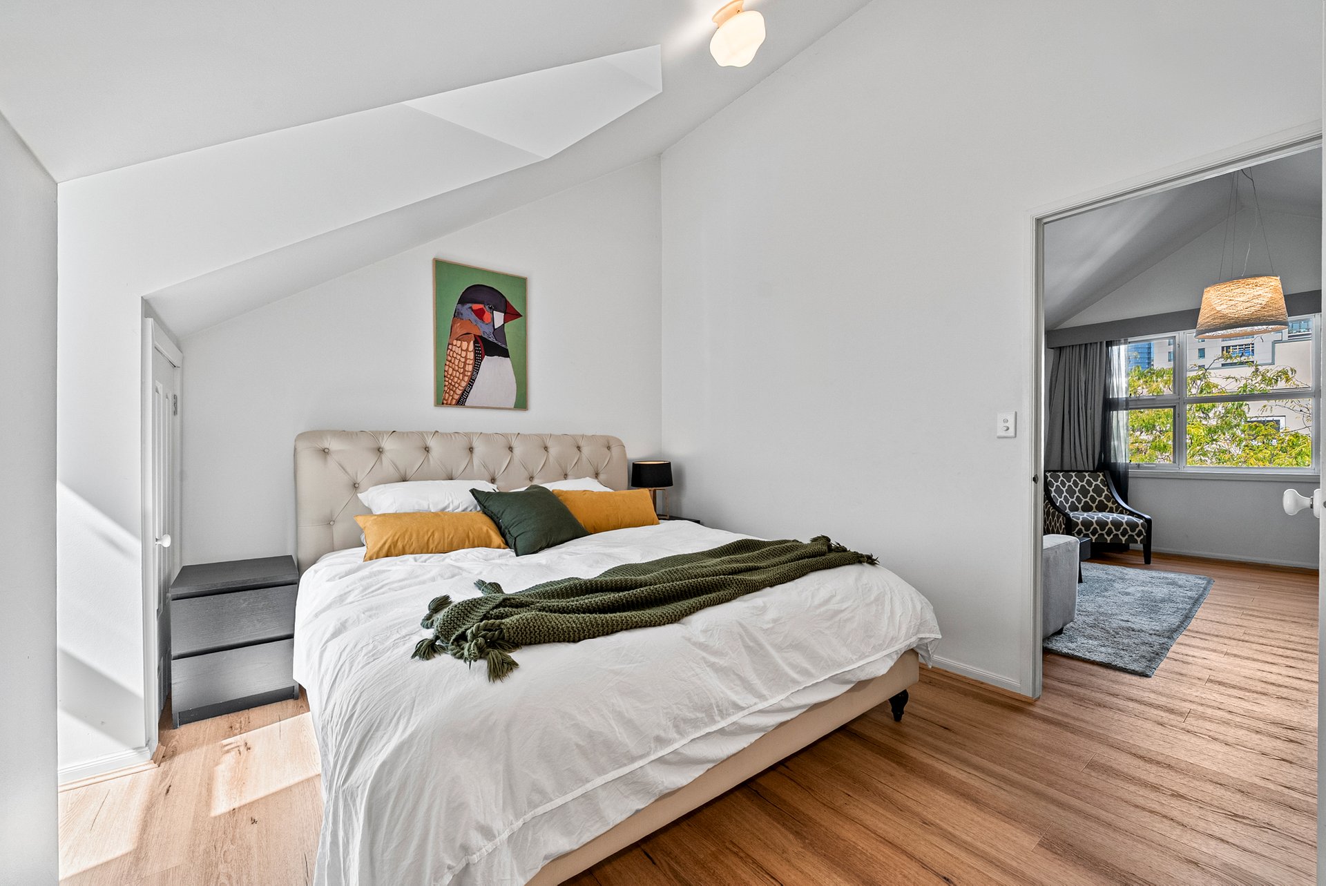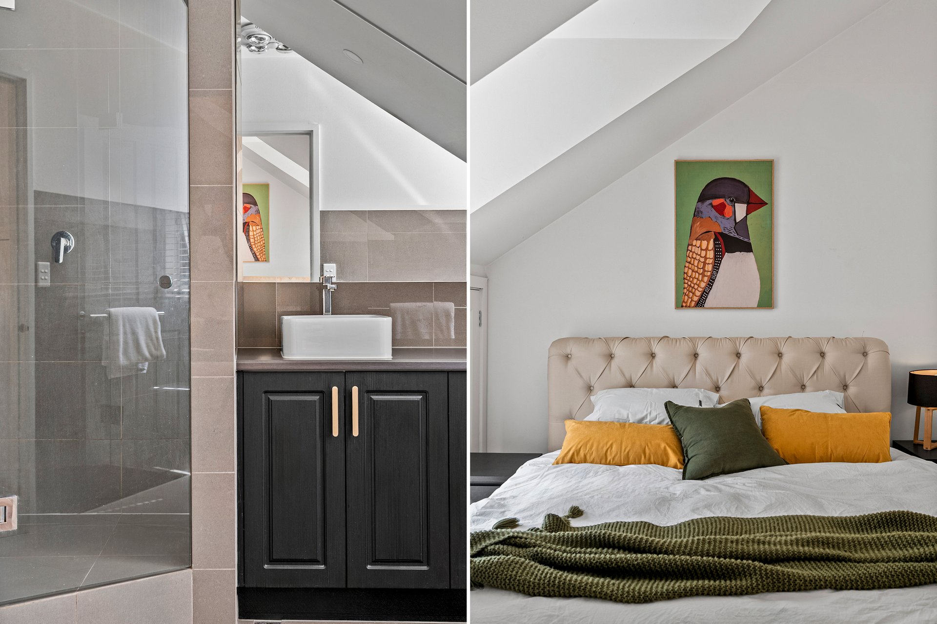 The bedroom is well-sized and features timber flooring, a built-in robe, two large storage cupboards and a vaulted ceiling, further enhancing the sense of space and light.