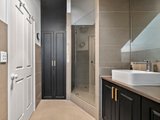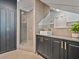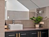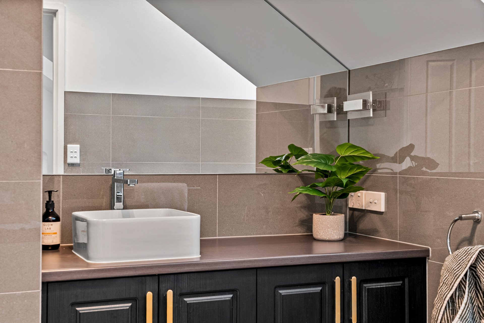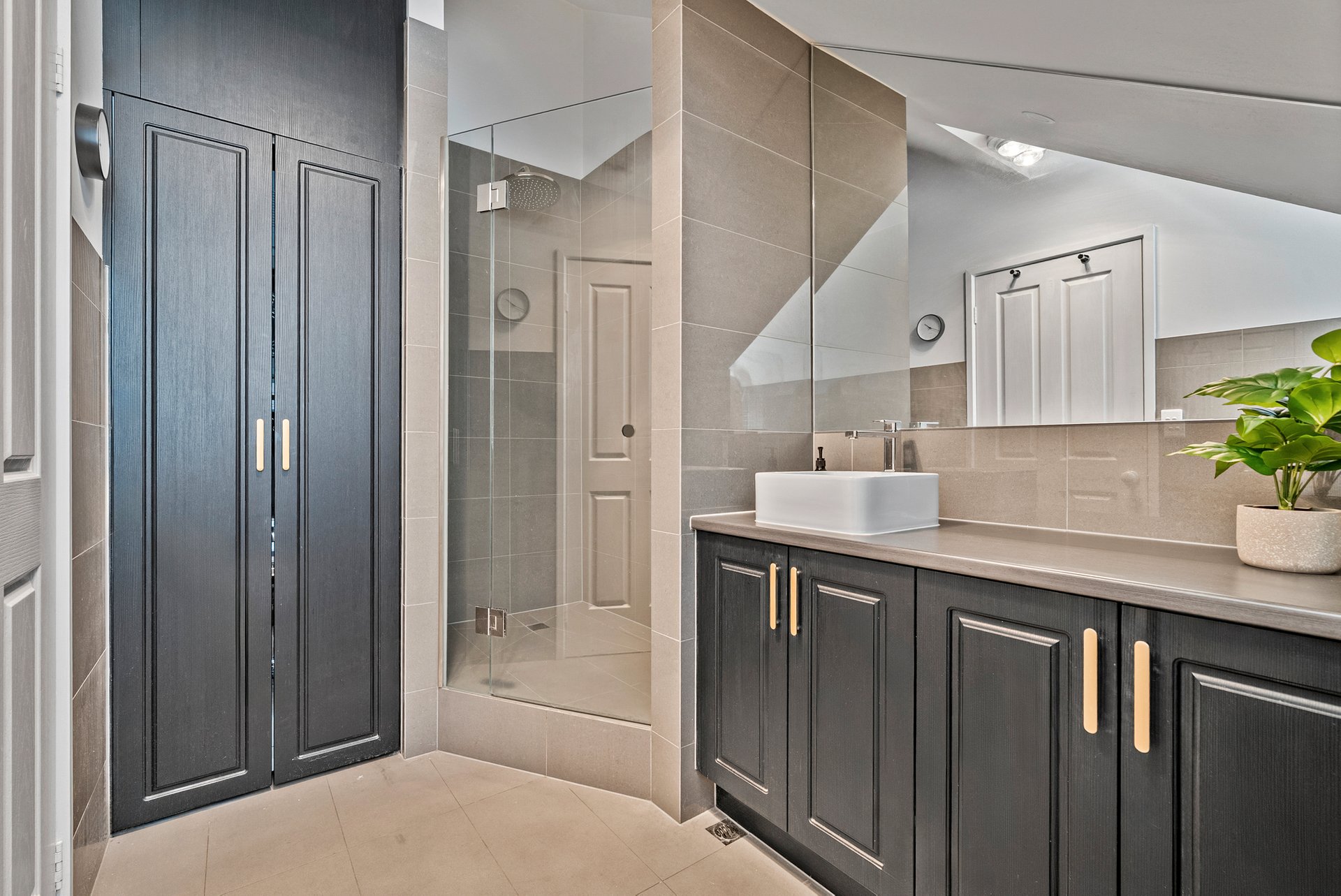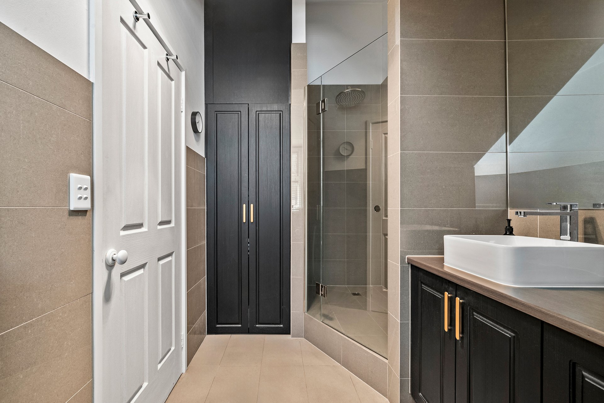 The bathroom continues the modern aesthetic, with cabinetry matching the kitchen for a consistent finish. It includes tiled flooring, a glass shower with rainfall showerhead, and integrated laundry space, maximising functionality.