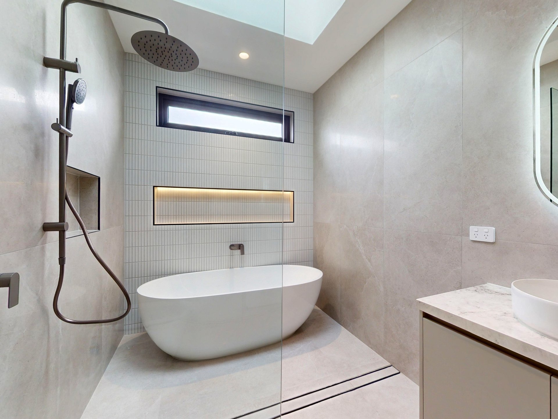- Wet room style central bathroom with a large stand alone bath and skylight