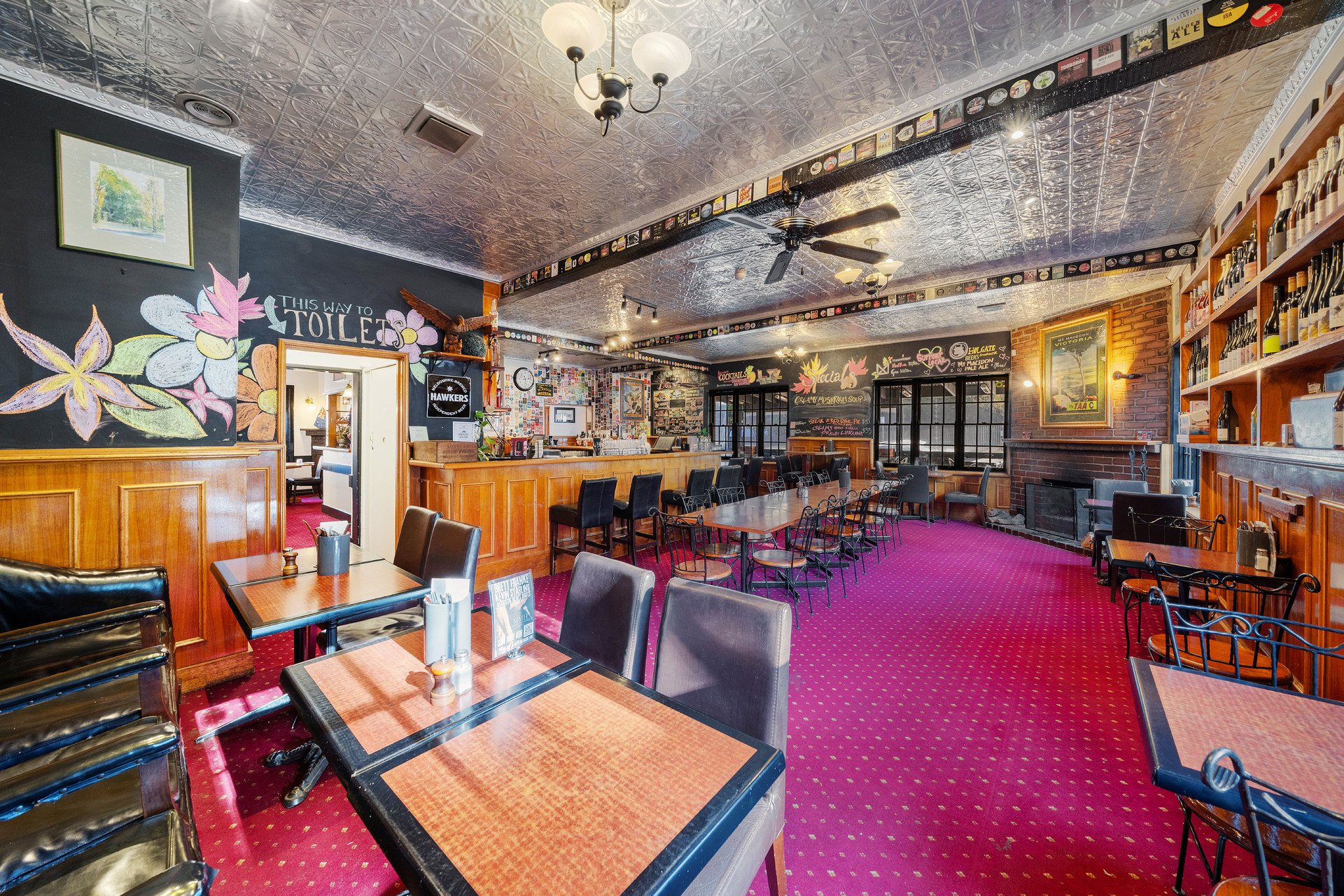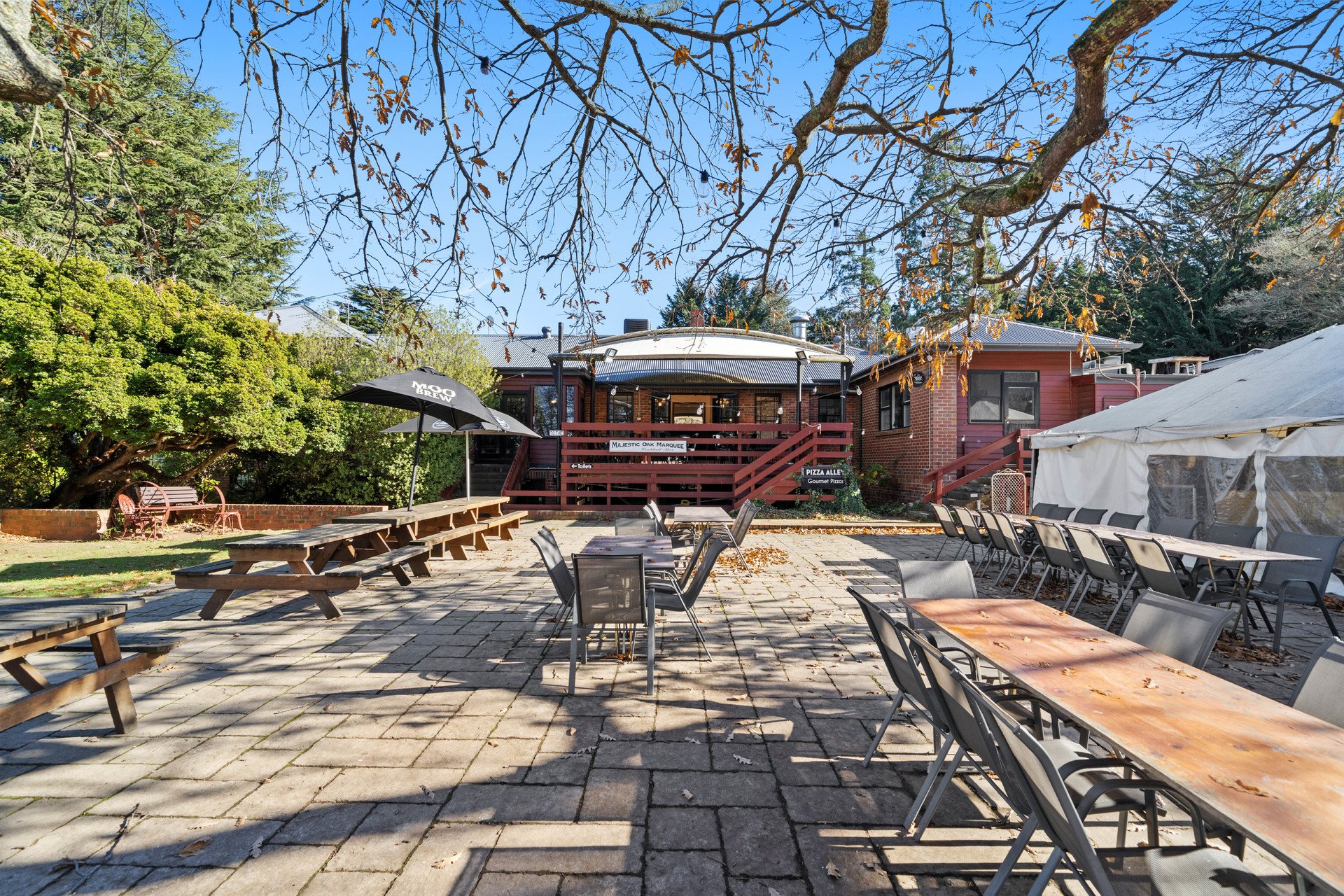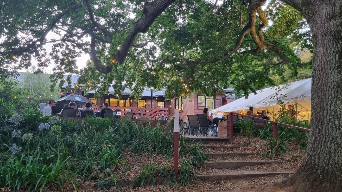 Showcasing magnificent views anchored by Mount Macedon, the hotel is introduced by a west-facing outdoor dining & drinks courtyard and a covered heated outdoor snug. Entry is to the large, yet cosy, Bar with its welcoming open fireplace, through to the Restaurant with 2 large Dining Rooms, which can be closed from each other to host separate private events. From the Restaurant, outdoor dining flows to a covered rear deck and on to a large Beer Garden with Marquee, presided over by a magnificent and majestic Oak Tree. The Marquee has its own Bar & the area hosts both private functions and popular weekend music sessions. The picturesque gardens & a flat former grass tennis court area provide ample room for children to play and for other private events such as weddings and wakes.