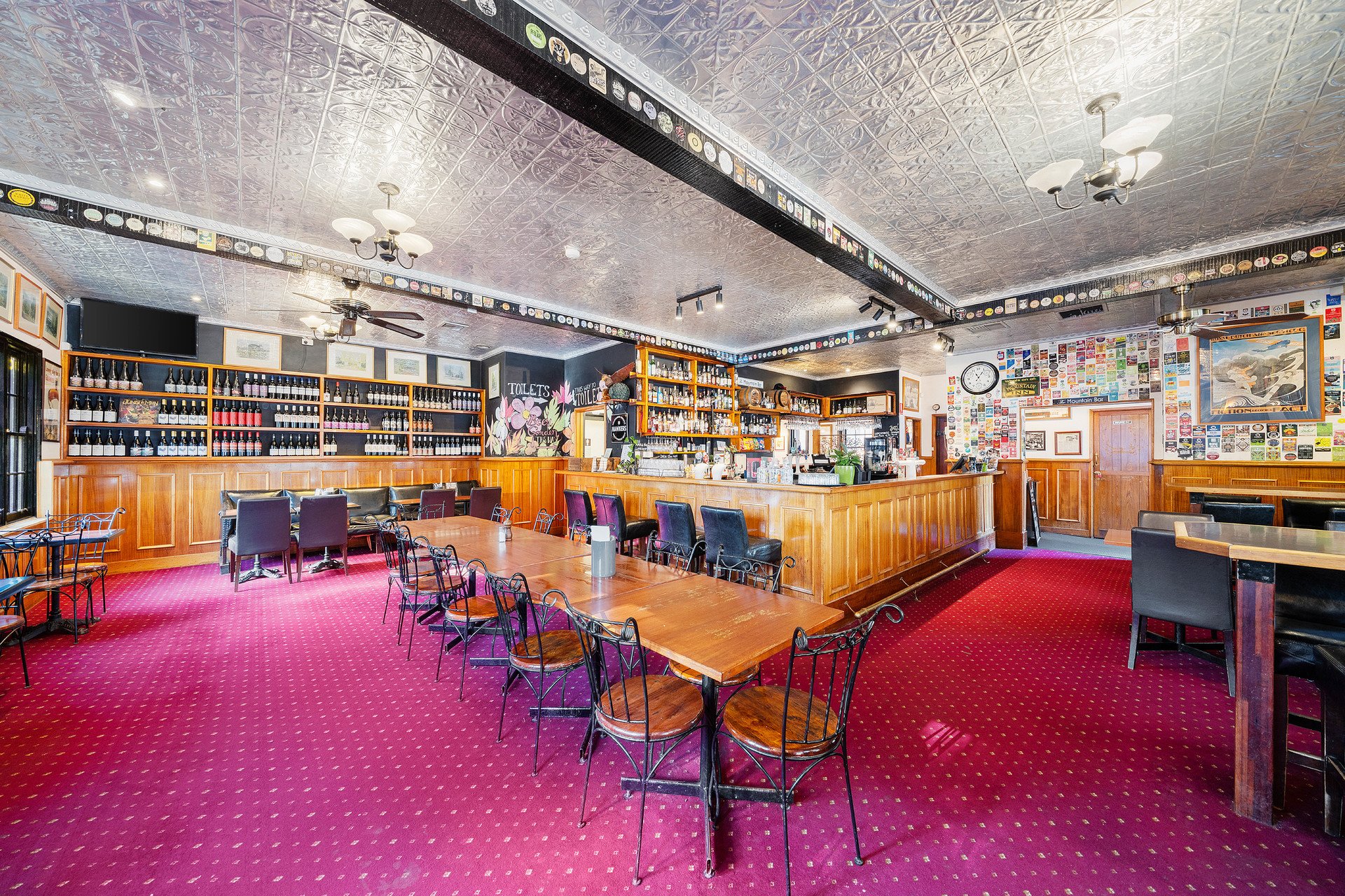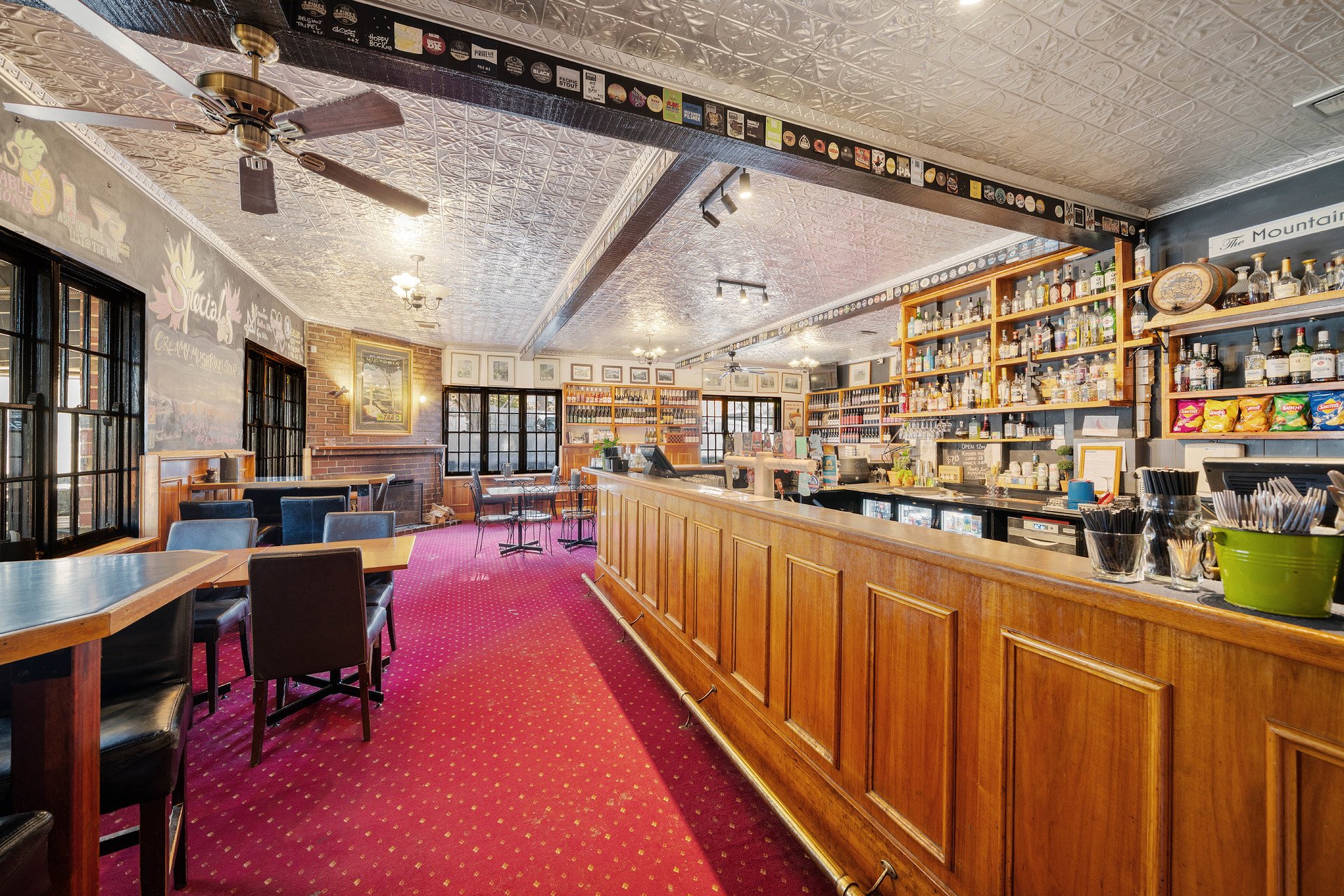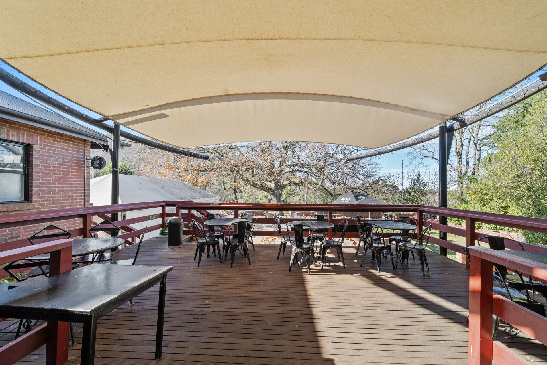 Showcasing magnificent views anchored by Mount Macedon, the hotel is introduced by a west-facing outdoor dining & drinks courtyard and a covered heated outdoor snug. Entry is to the large, yet cosy, Bar with its welcoming open fireplace, through to the Restaurant with 2 large Dining Rooms, which can be closed from each other to host separate private events. From the Restaurant, outdoor dining flows to a covered rear deck and on to a large Beer Garden with Marquee, presided over by a magnificent and majestic Oak Tree. The Marquee has its own Bar & the area hosts both private functions and popular weekend music sessions. The picturesque gardens & a flat former grass tennis court area provide ample room for children to play and for other private events such as weddings and wakes.