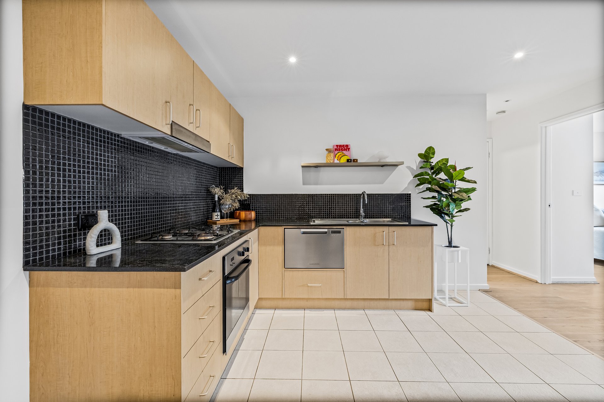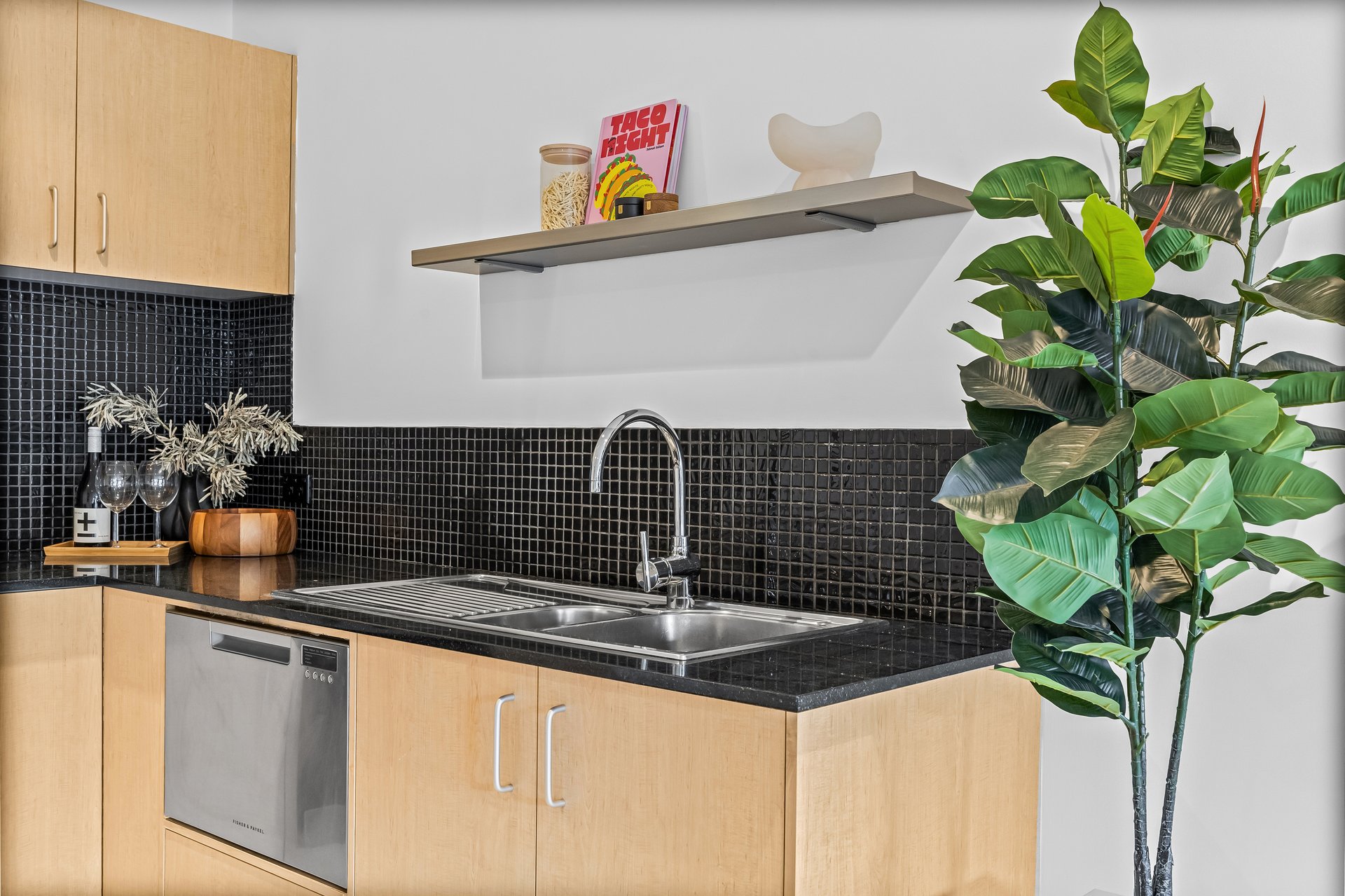 The open-plan kitchen, dining, and living area provides a seamless hub, equipped with air conditioning in the living room for year-round comfort. The kitchen combines style and practicality with tiled flooring, Fisher & Paykel cooktop, oven, and compact dishwasher, complemented by under and overhead storage.