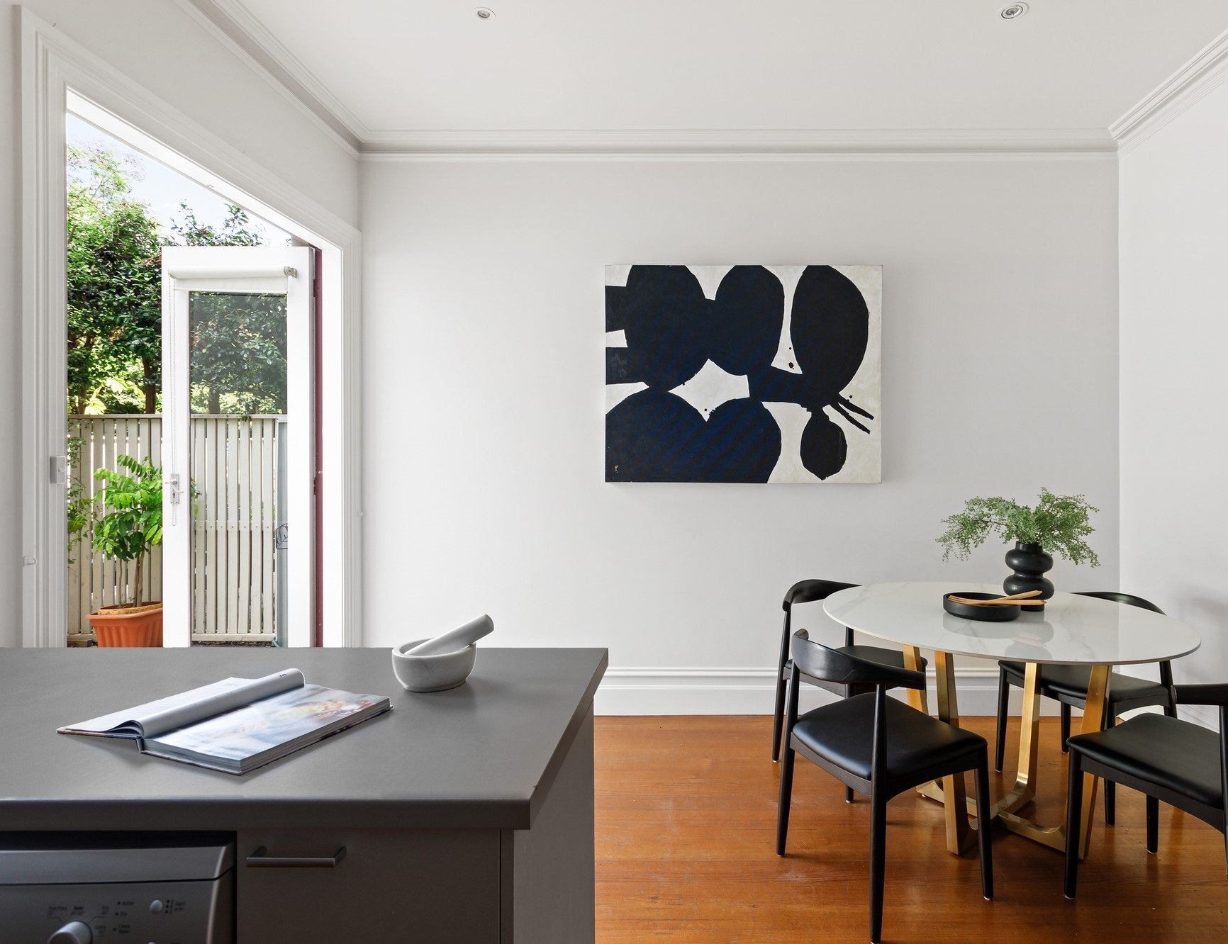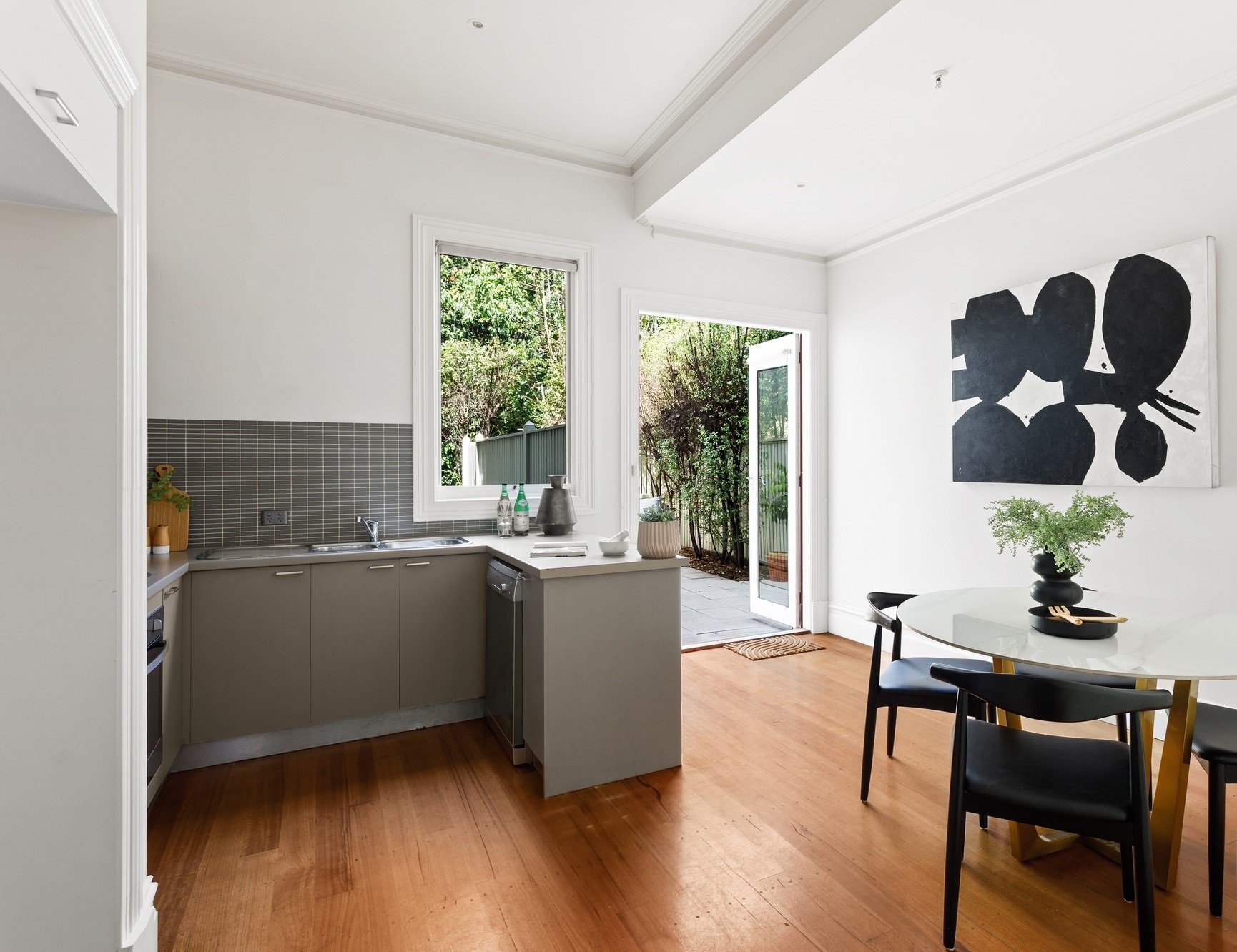 Beyond its charming façade, the home reveals a spacious living room highlighted by lofty ceilings and a beautiful ornamental fireplace, creating a grand yet welcoming ambience. The well-appointed kitchen, complete with quality appliances and excellent storage, flows seamlessly into the adjoining dining area. French doors open out to a private, sun-drenched courtyard—an ideal setting for alfresco dining, entertaining guests or simply unwinding in your own peaceful retreat.