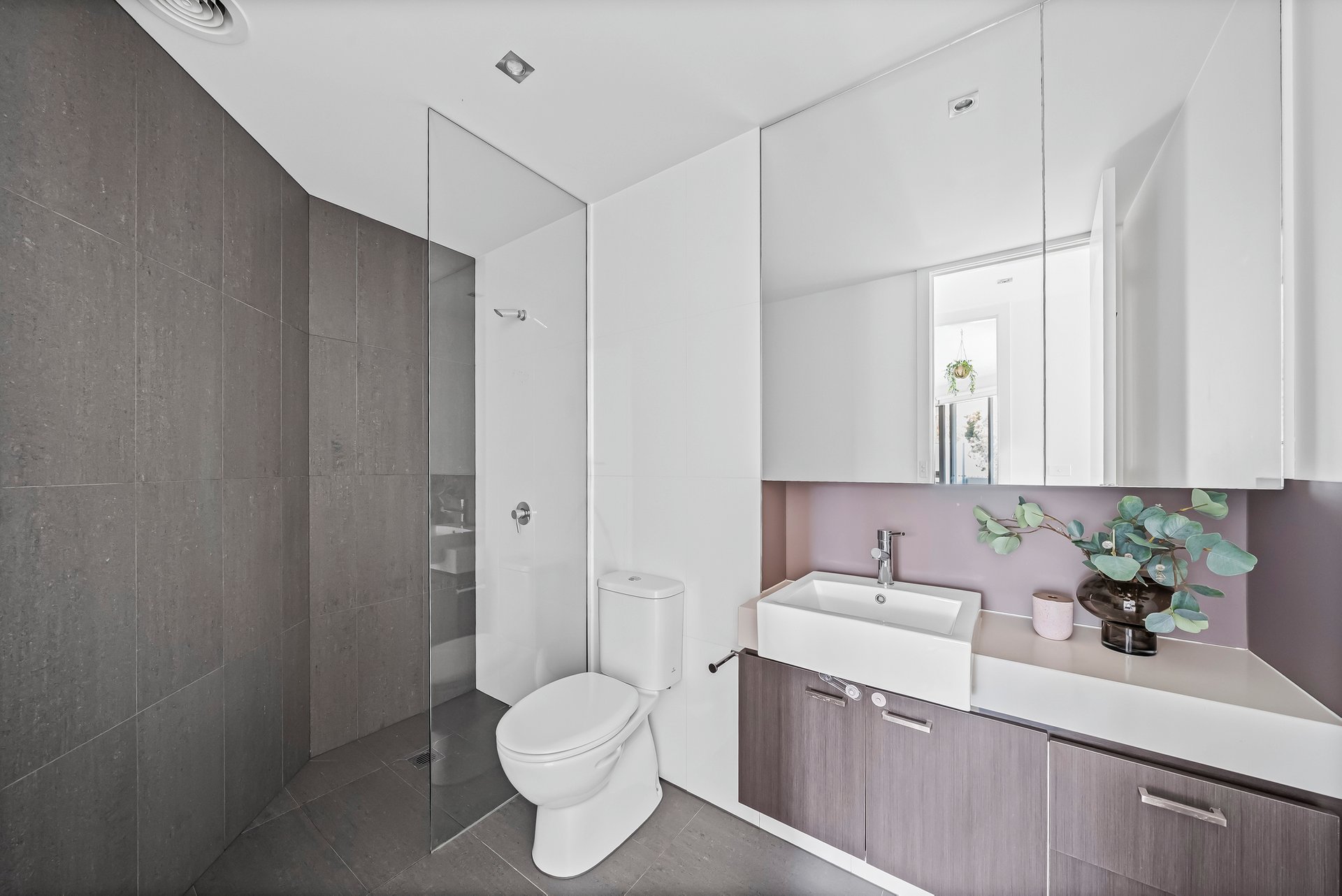 Both bathrooms include tiled floors and walls, glass shower screens, and contemporary vanities with mirror cabinets. Downlights throughout the apartment provide a modern touch, while a split system ensures heating and cooling for year-round comfort.