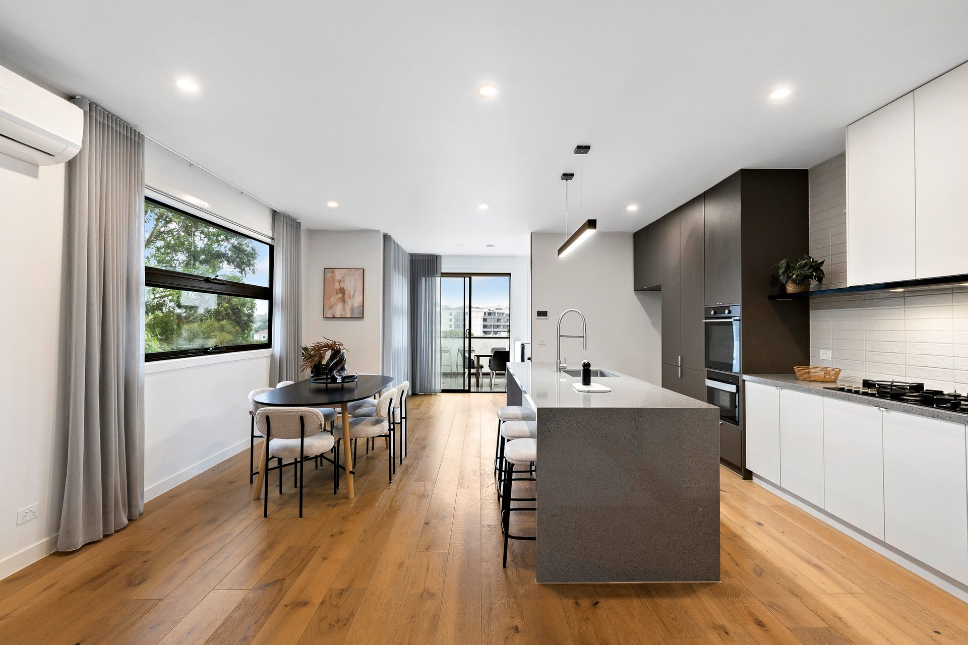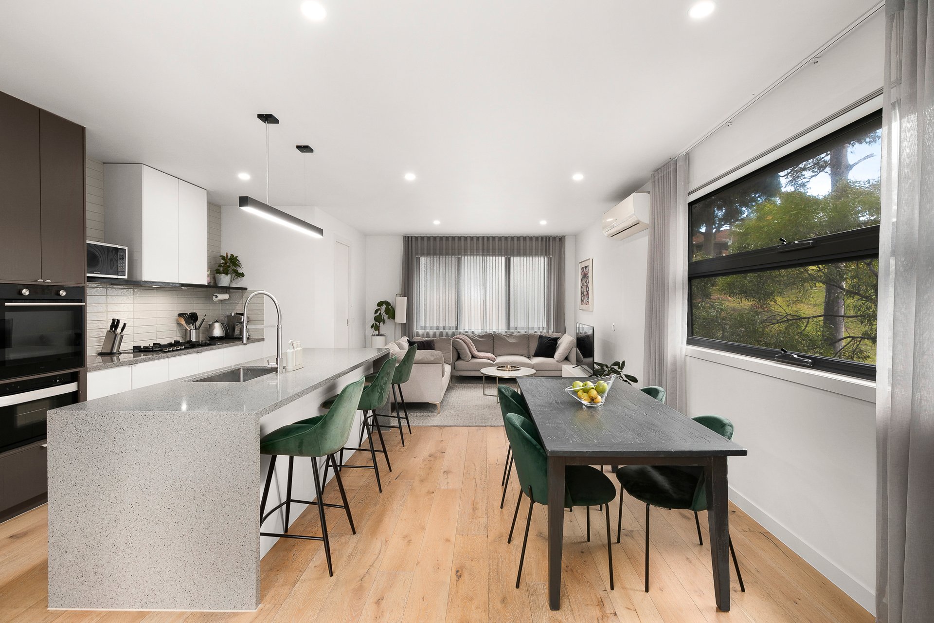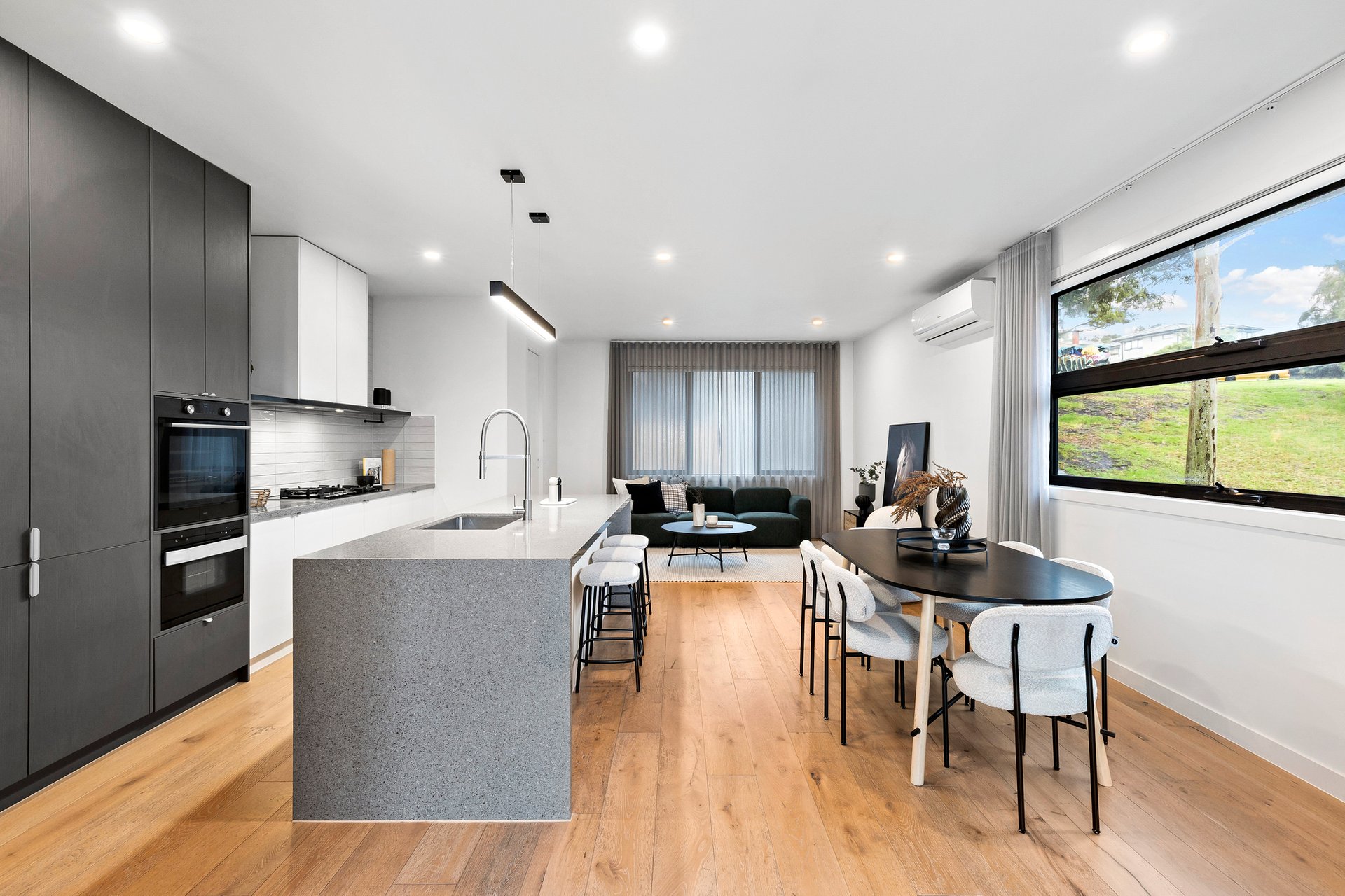 Tucked privately at the rear of a boutique group of seven, this beautifully designed townhouse delivers on contemporary style, quality finishes, and effortless living beside Austin Crescent Reserve. Cleverly designed with a split-level reverse floor plan, the top level showcases open-plan living and dining, complemented by a gourmet kitchen with large stone island bench, Asko gas cooktop, wall oven, grill, and Norj dishwasher, flowing to a sunlit corner balcony with sweeping park views.
