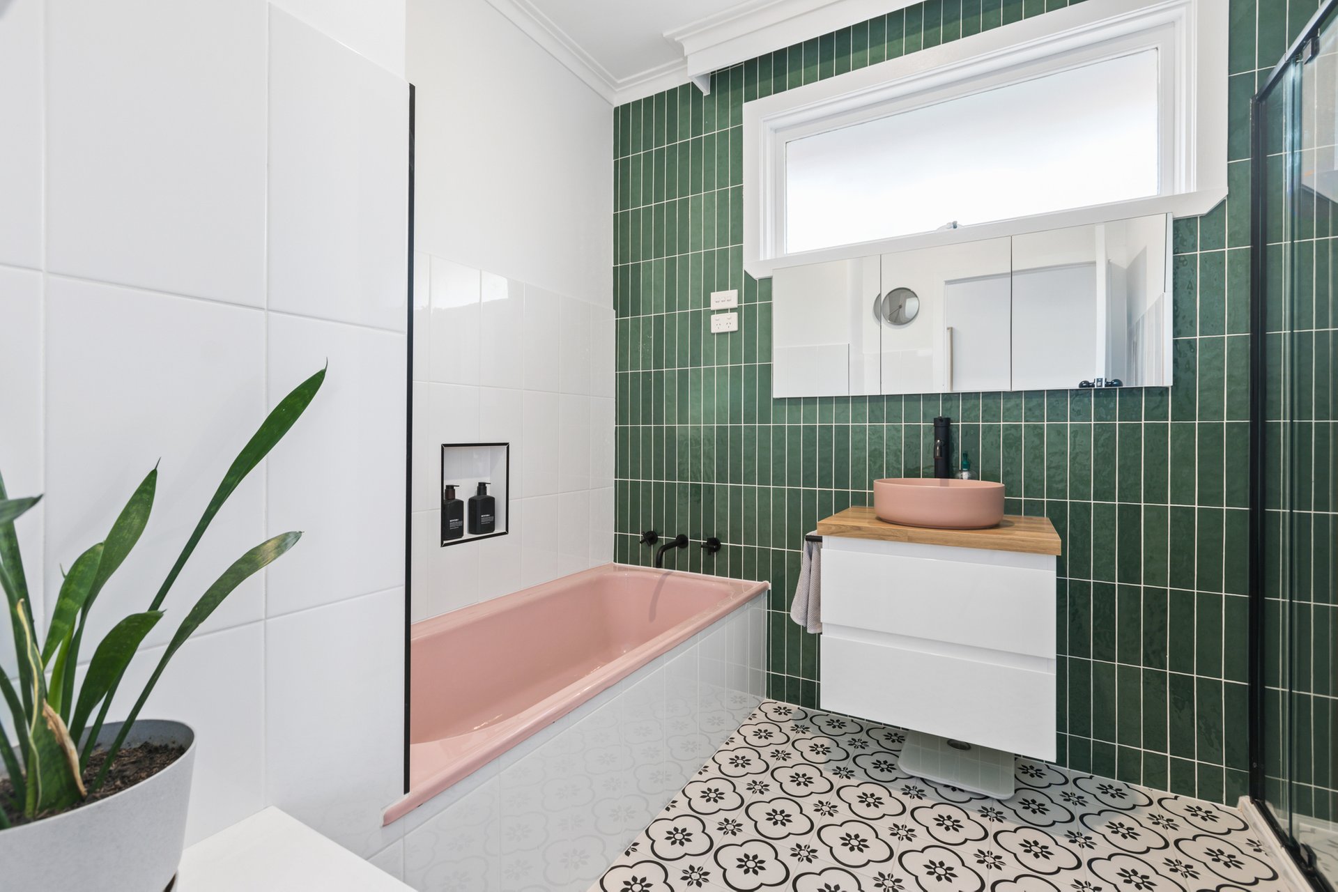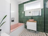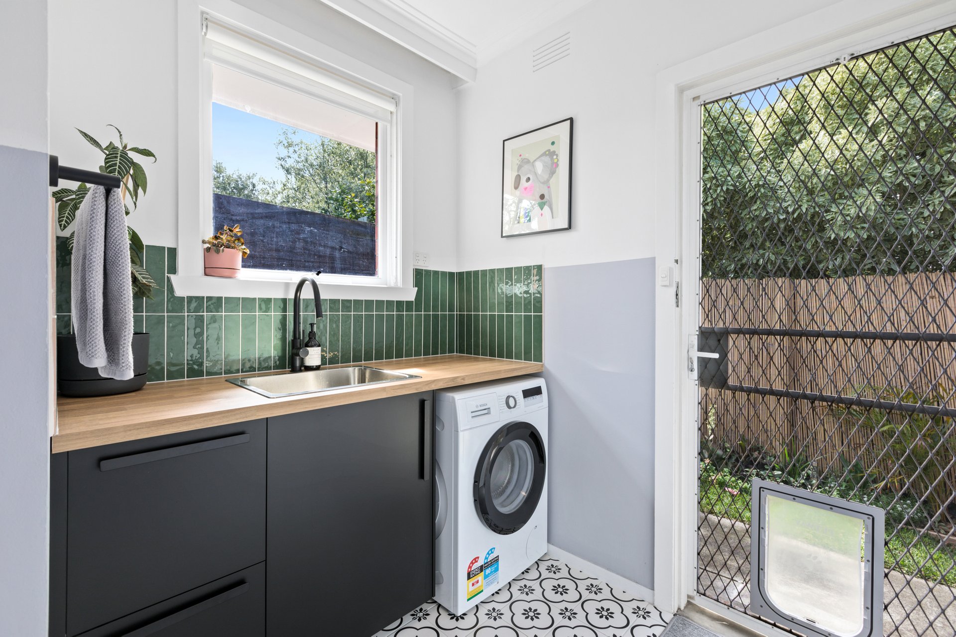 Both bedrooms boast built-in storage – they share a stunning bathroom, which showcases the same colours and finishes as both the kitchen and laundry.