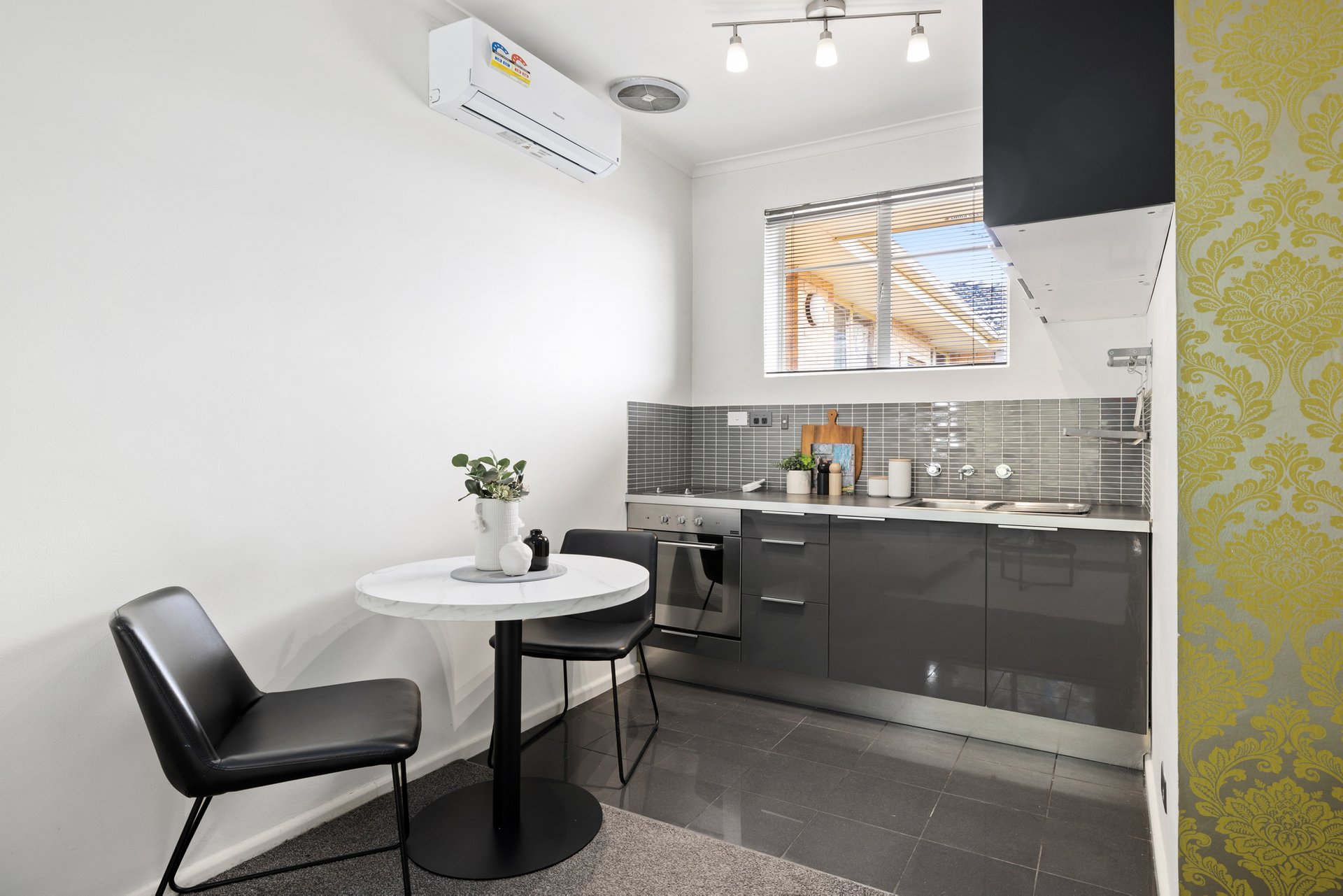 A welcoming open-plan living and dining zone flows to a practical galley kitchen with stainless steel oven, while the generous bedroom features built-in robes and direct access to an updated bathroom with laundry facilities. Split-system heating and cooling ensure year-round comfort.