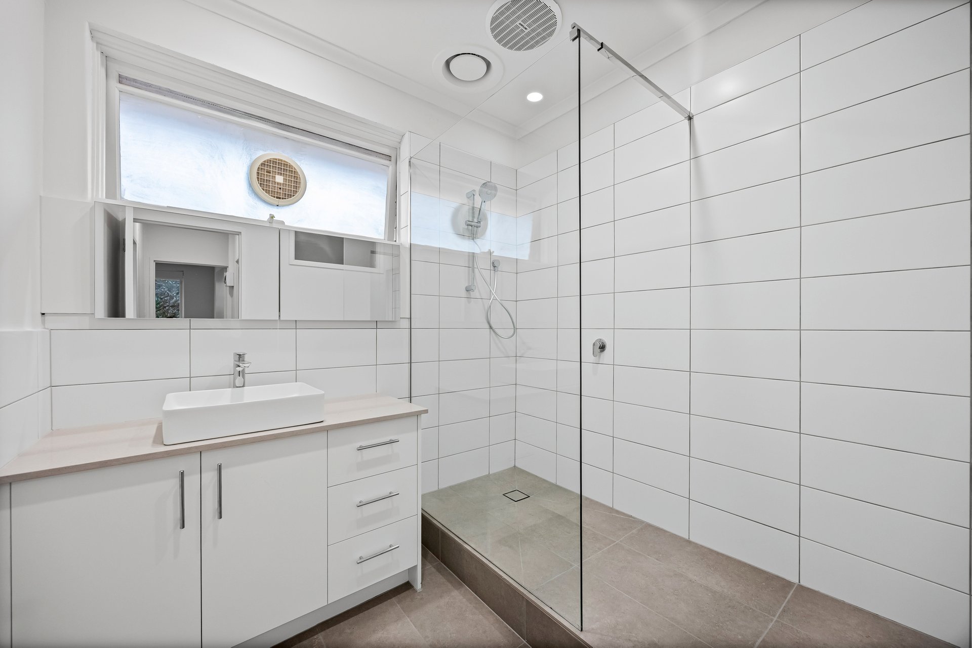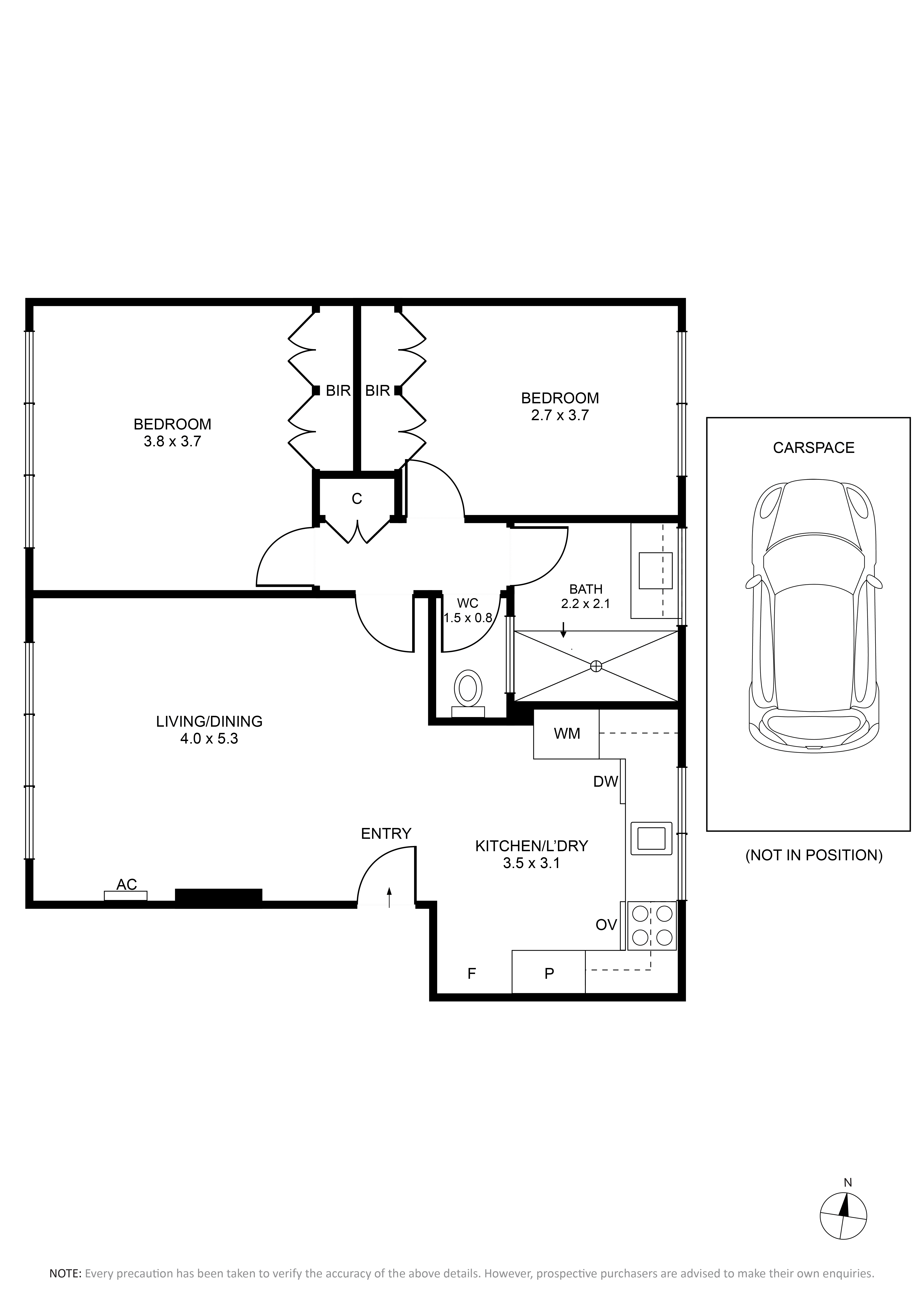 Both bedrooms are generously sized with carpeted flooring and built-in robes, ensuring plenty of storage space and natural light. The bathroom is sleek, featuring a frameless shower, chrome tapware, a stone vanity top, and a shaving cabinet for additional storage. A separate WC provides extra convenience. The unit includes an undercover car space.