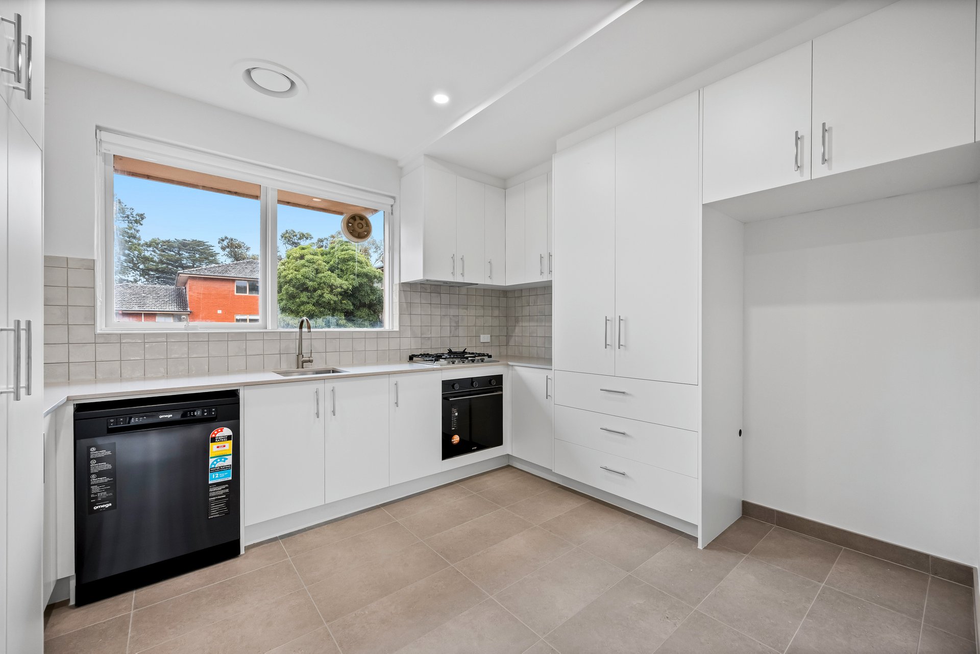 The kitchen is a standout, boasting Omega appliances, a gas stove, an electric oven, and a stone benchtop. Tiled flooring and a tiled splashback complement the ample storage space, including a built-in pantry and a tucked away European laundry.