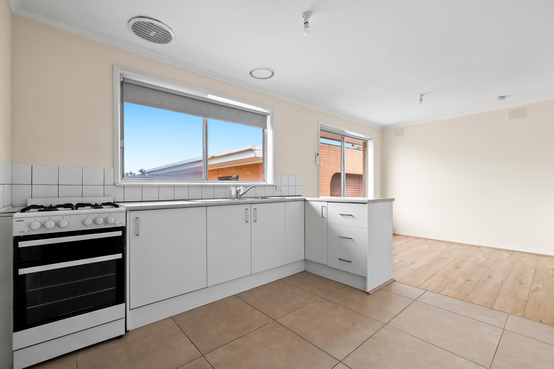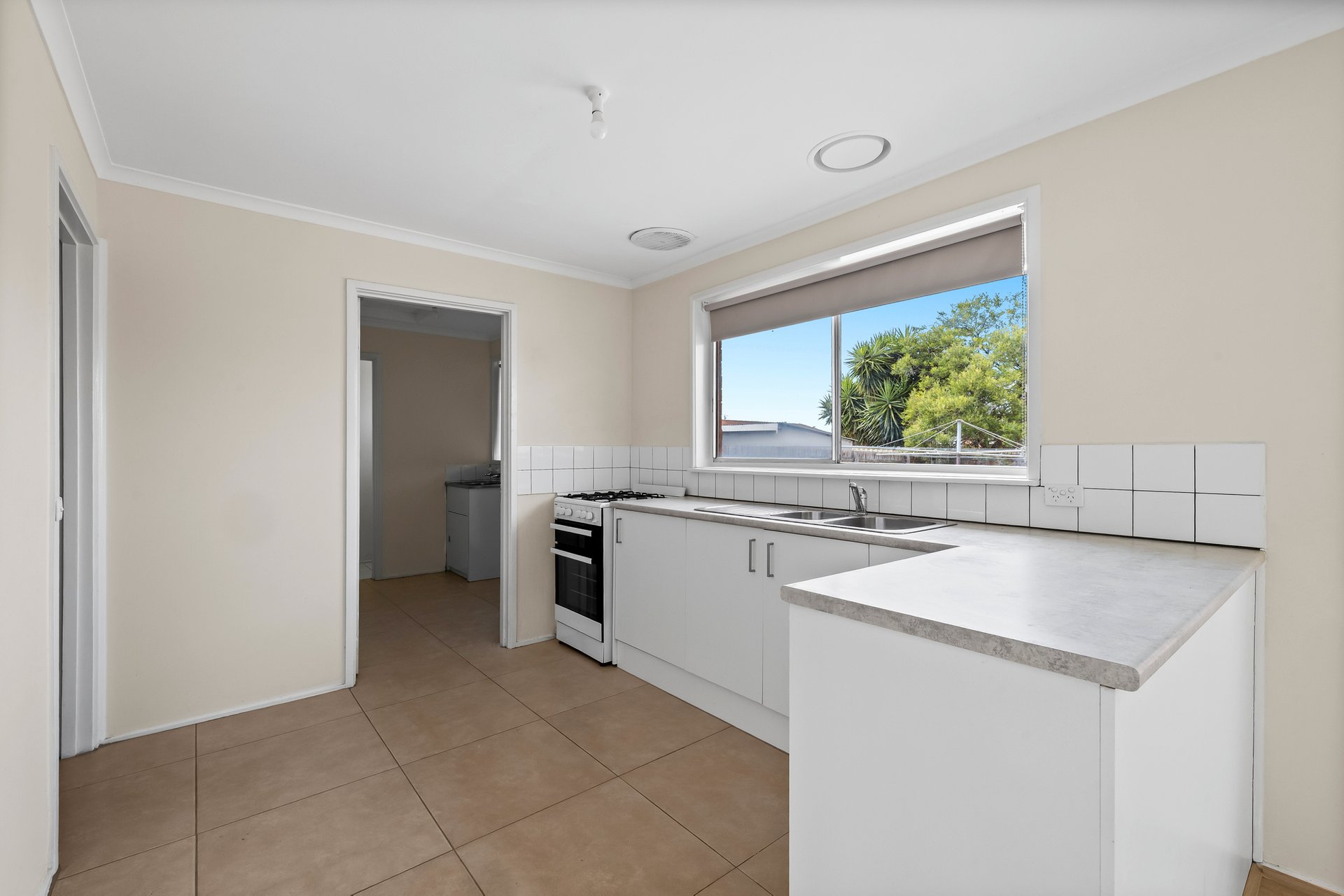 The kitchen overlooks the meals area and includes a gas oven and cooktop with an all in one cooking setup. Tiled flooring and a functional layout make this a practical space for family use, with scope to update or personalise over time.