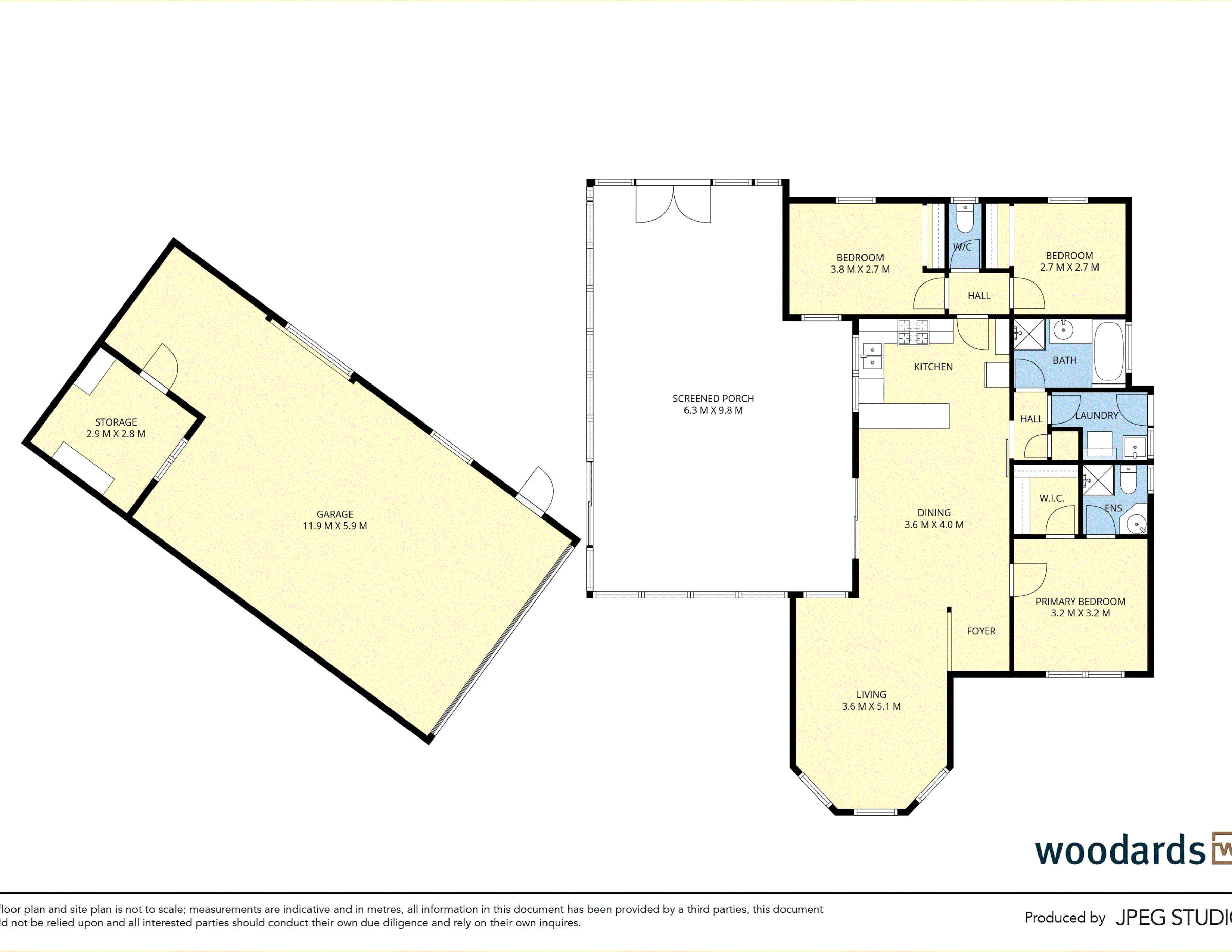 Accommodation comprises three bedrooms and two bathrooms. The main bedroom features a walk-in robe and an ensuite, while the remaining bedrooms are served by a central bathroom appointed with a shower, bath, and a separate WC. Includes a secure garage with storage room, a carport, solar panels, a garden shed, a water tank, and efficient heating/cooling.