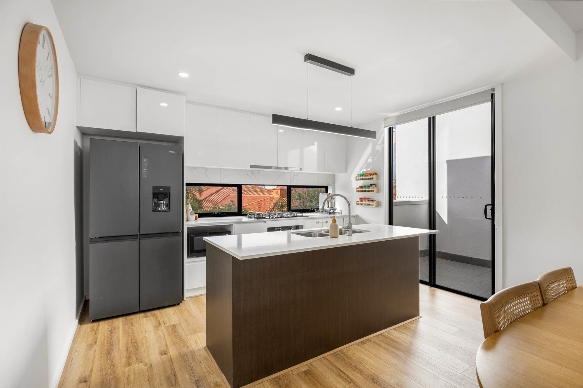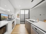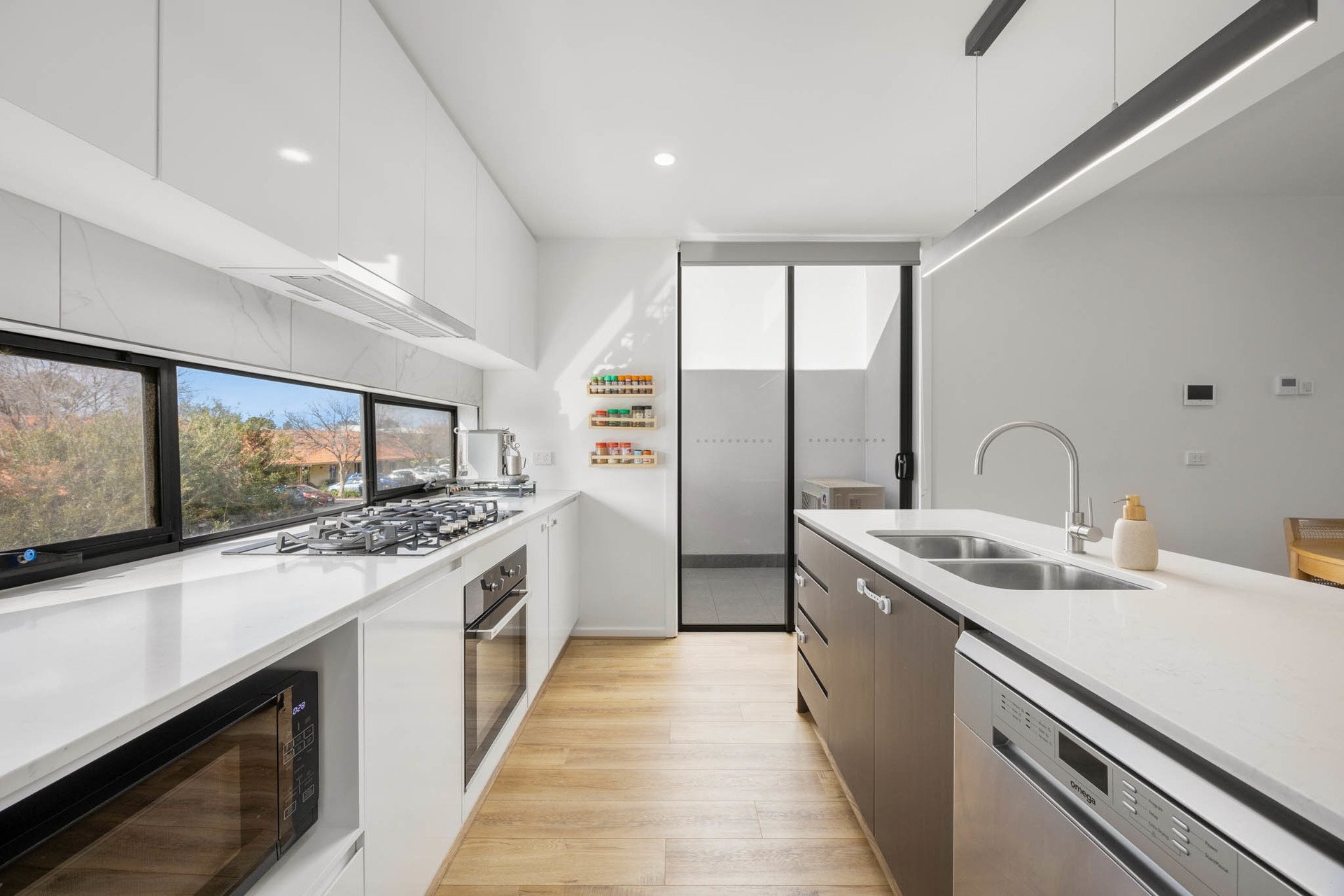 The first floor is a light-filled entertainer's haven, where engineered wood-styled floors flow through the expansive open-plan living and dining zone. Glass doors open to a wide, private balcony with room for alfresco dining. A sleek galley kitchen with stone benchtops, dual sink, soft-close cabinetry and Omega appliances (5-hob cooktop, oven, and dishwasher) extends to a cosy breakfast balcony facing east. A powder room adds everyday convenience.