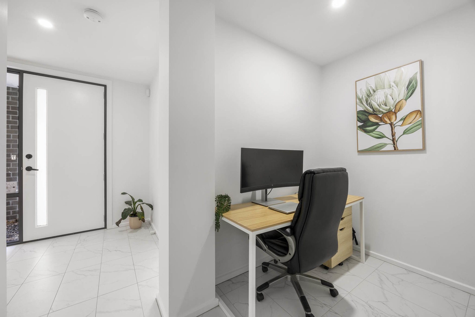 Step inside to a tiled entry portico leading to the ground-floor main suite. The spacious bedroom boasts a galley-style walk-in robe and a private ensuite with bold black-and-white styling, a double shower with waterfall head, vanity, and toilet. This level also includes a versatile study or retreat, a tiled laundry with storage, and direct access to a double remote-control garage with understairs storage.