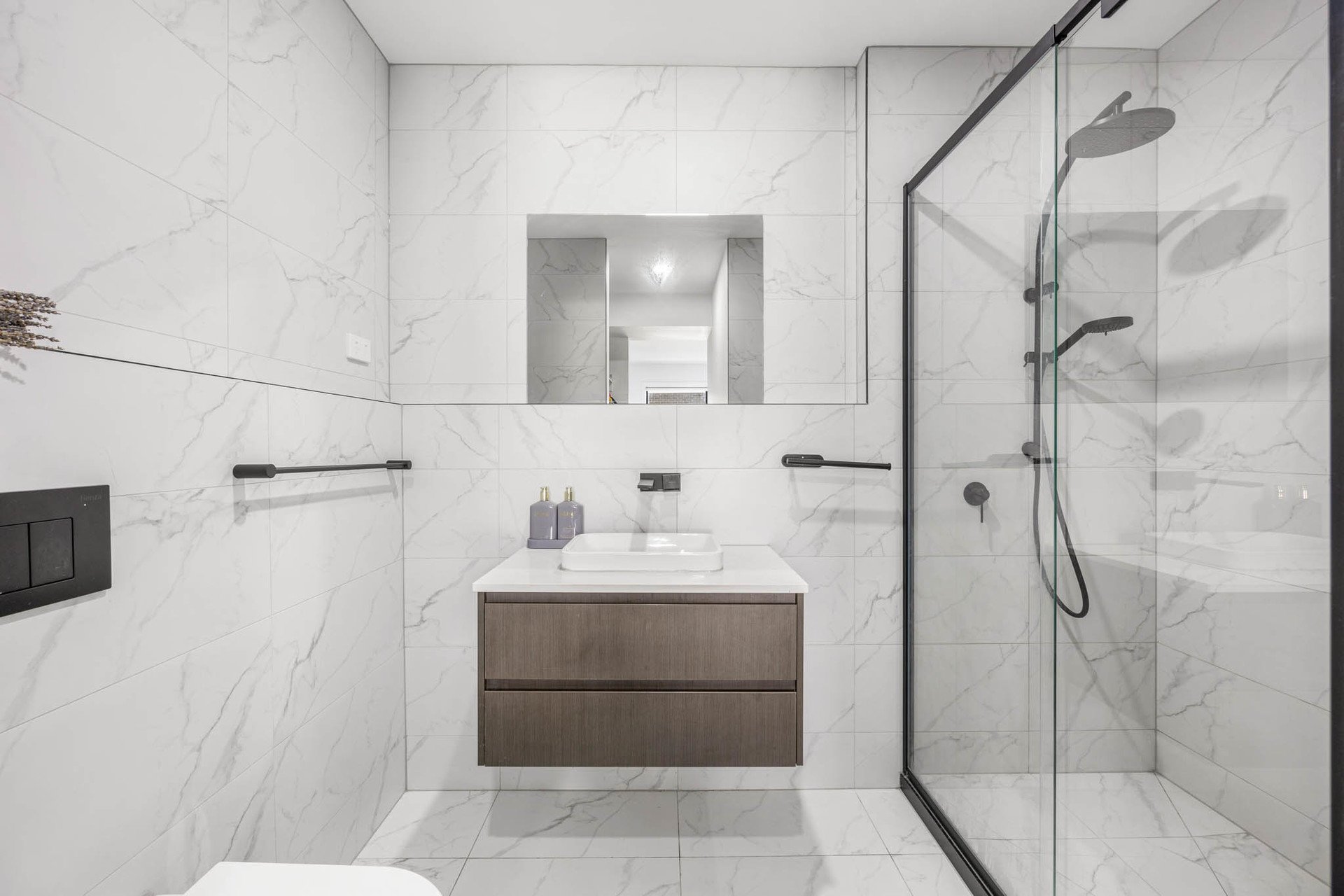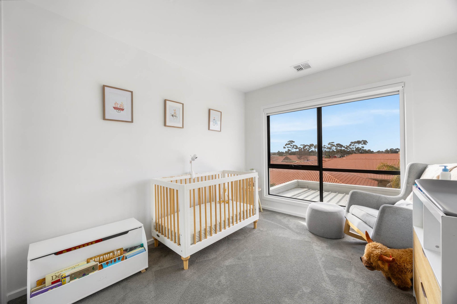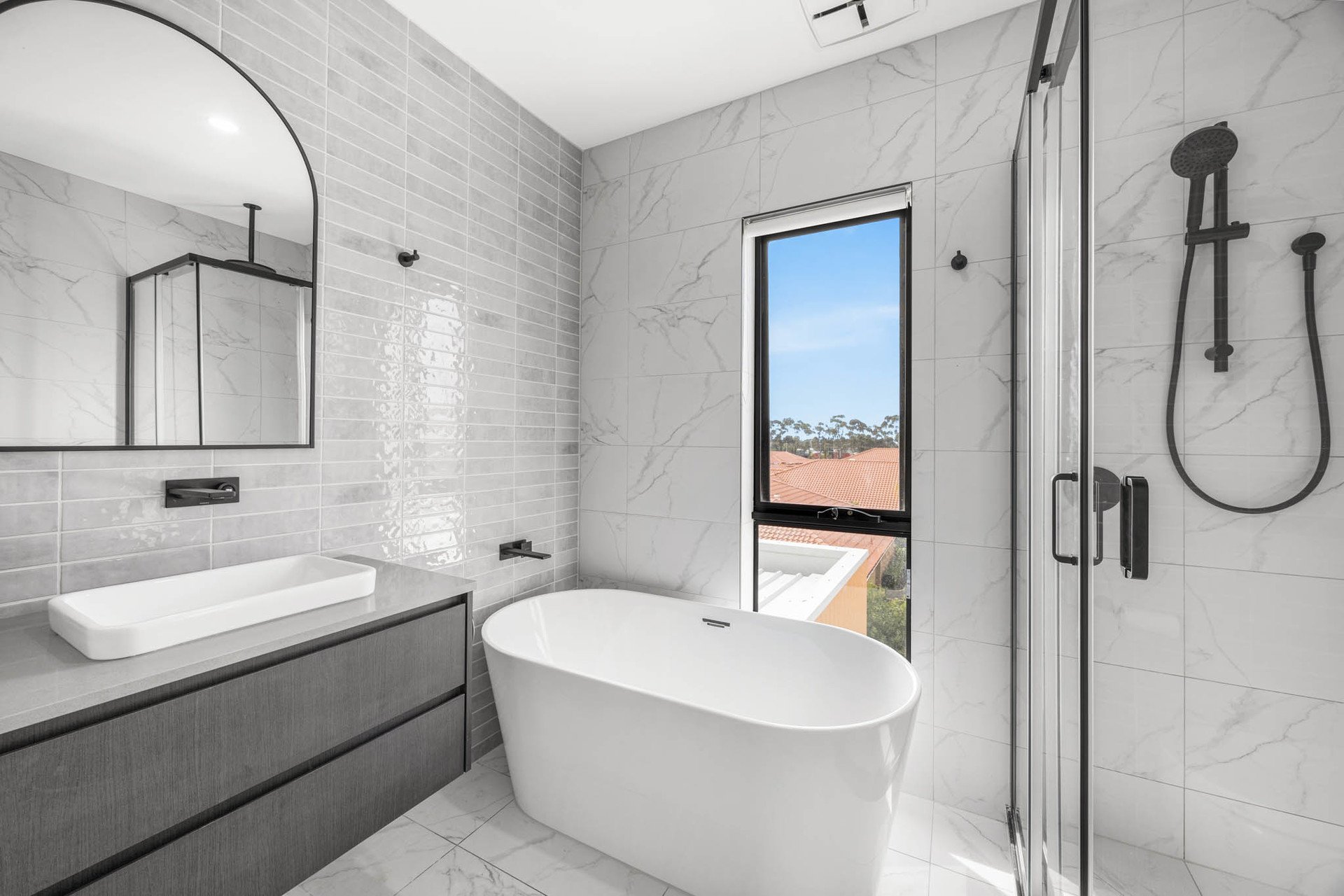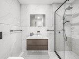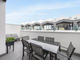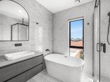 The top floor hosts two additional bedrooms: one with a built-in robe, and another with a huge walk-in robe. They are serviced by a beautifully appointed bathroom featuring marble-inspired tiling, freestanding bath, separate shower with waterfall head, vanity, and toilet. Comfort is assured with electric black out blinds, heating and cooling, NBN connectivity, and a full alarm system.