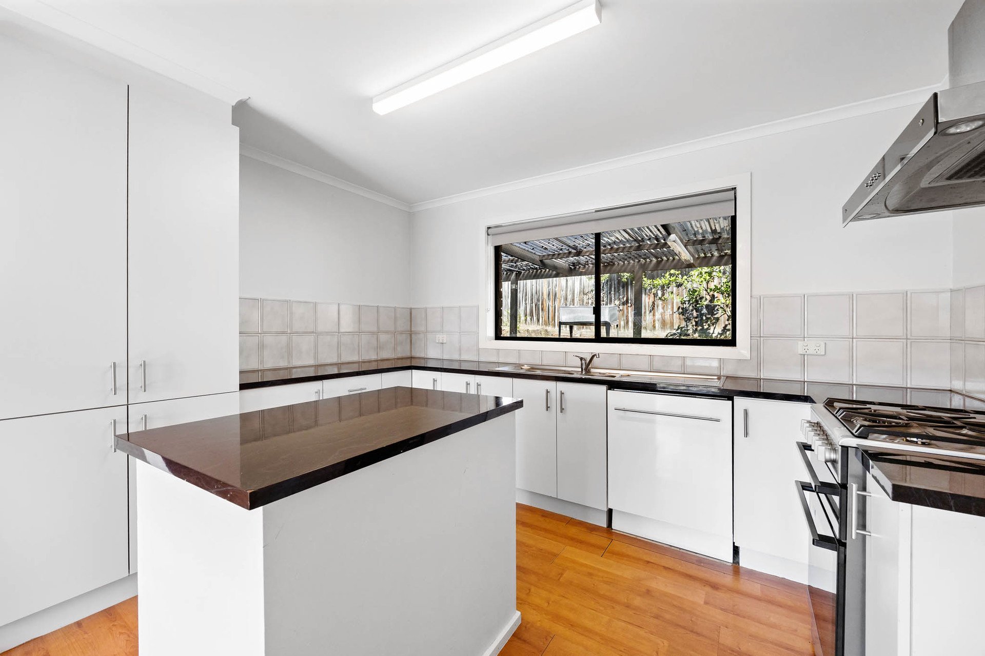 Interiors introduce a welcoming lounge, flowing through to a spacious kitchen designed for everyday ease. Generous bench space and abundant storage are complemented by a Westinghouse upright oven and integrated Technika dishwasher, while the adjoining meals area supports relaxed family living. Accommodation comprises three bedrooms, each fitted with built-in robes and served by a central bathroom with shower and bath.