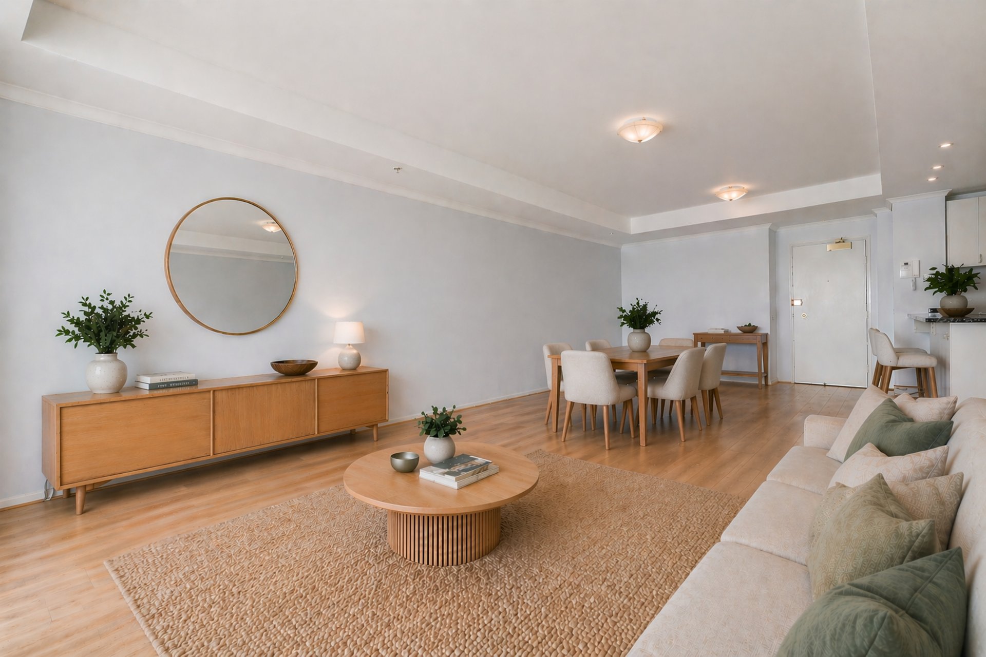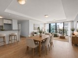 A light-filled open-plan living and dining domain extends seamlessly to a substantial private balcony, offering an inviting setting for both everyday relaxation and entertaining. The well-designed kitchen is appointed with quality finishes and generous storage, complementing the home’s refined yet functional aesthetic.