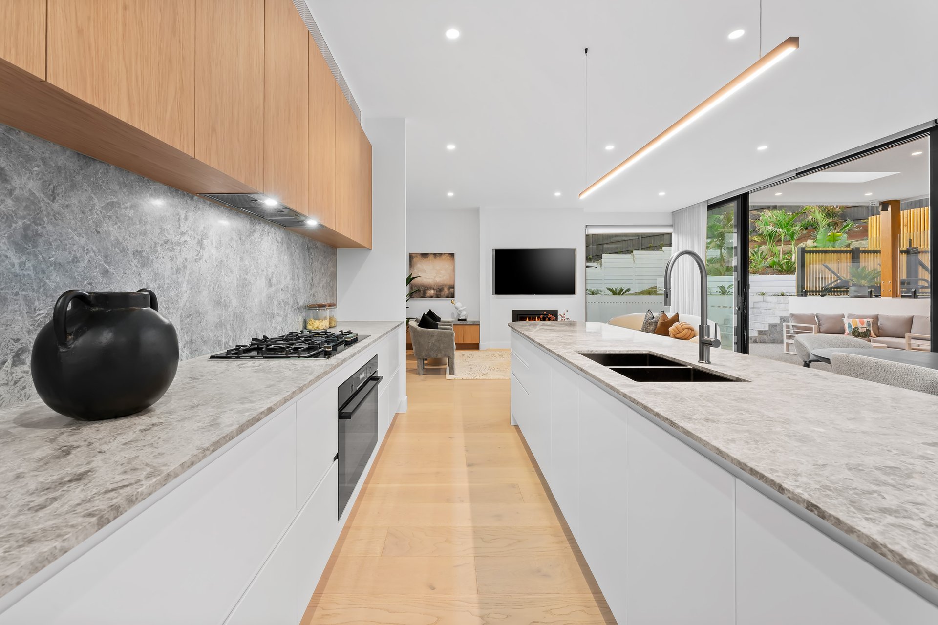 Beyond the bespoke Silvertop Ash pivot door, intricate detailing impresses, from the floors graced with solid engineered European timber, wool carpets and designer tiles, to walls adorned with VJ-groove panelling, and bench surfaces made of natural Tundra limestone and engineered concrete.