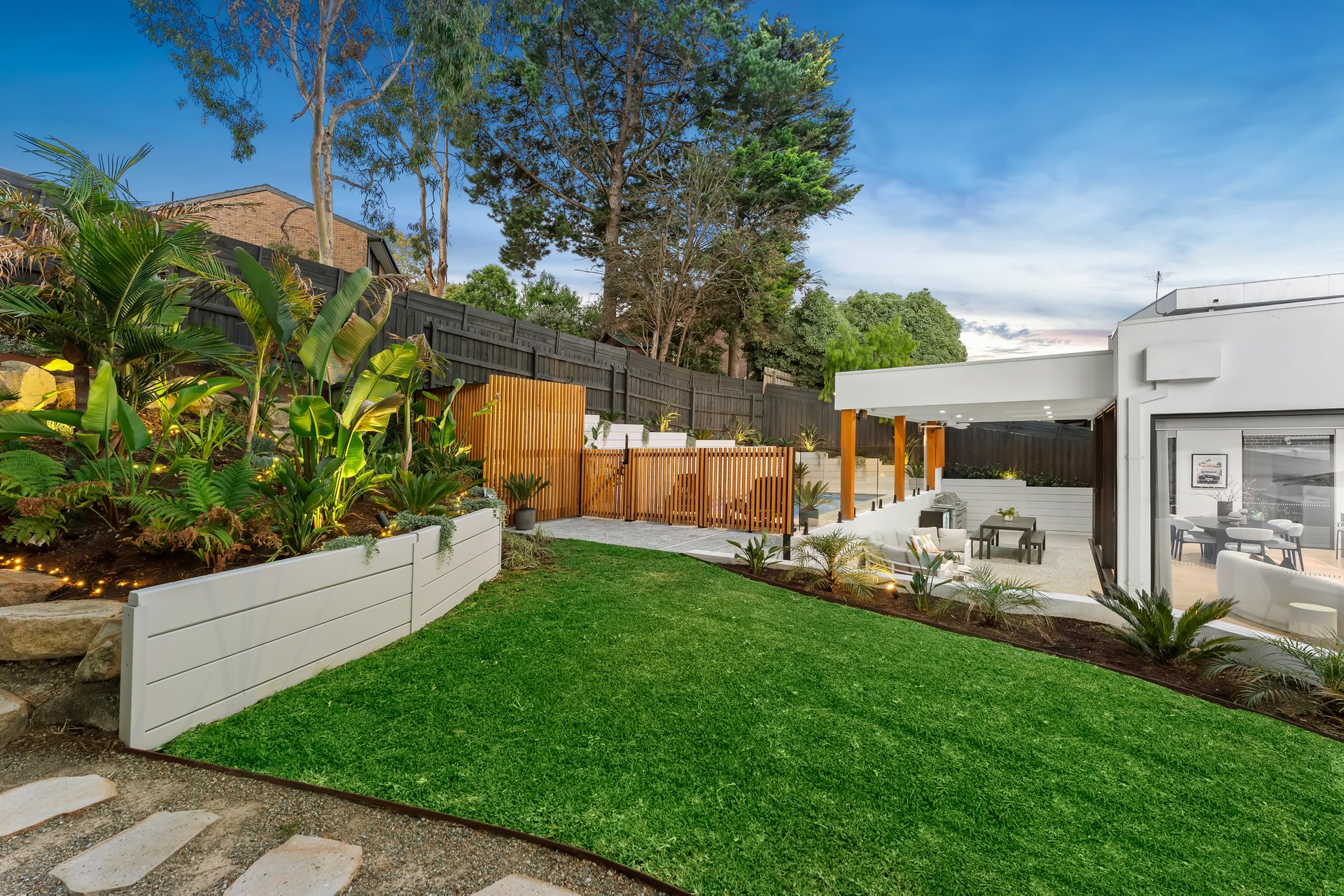 Professionally landscaped gardens with a feature pond set the tone from the outset, framed by an exposed aggregate driveway and perimeter pathways that create a striking arrival to the Tundra stone-paved entrance.