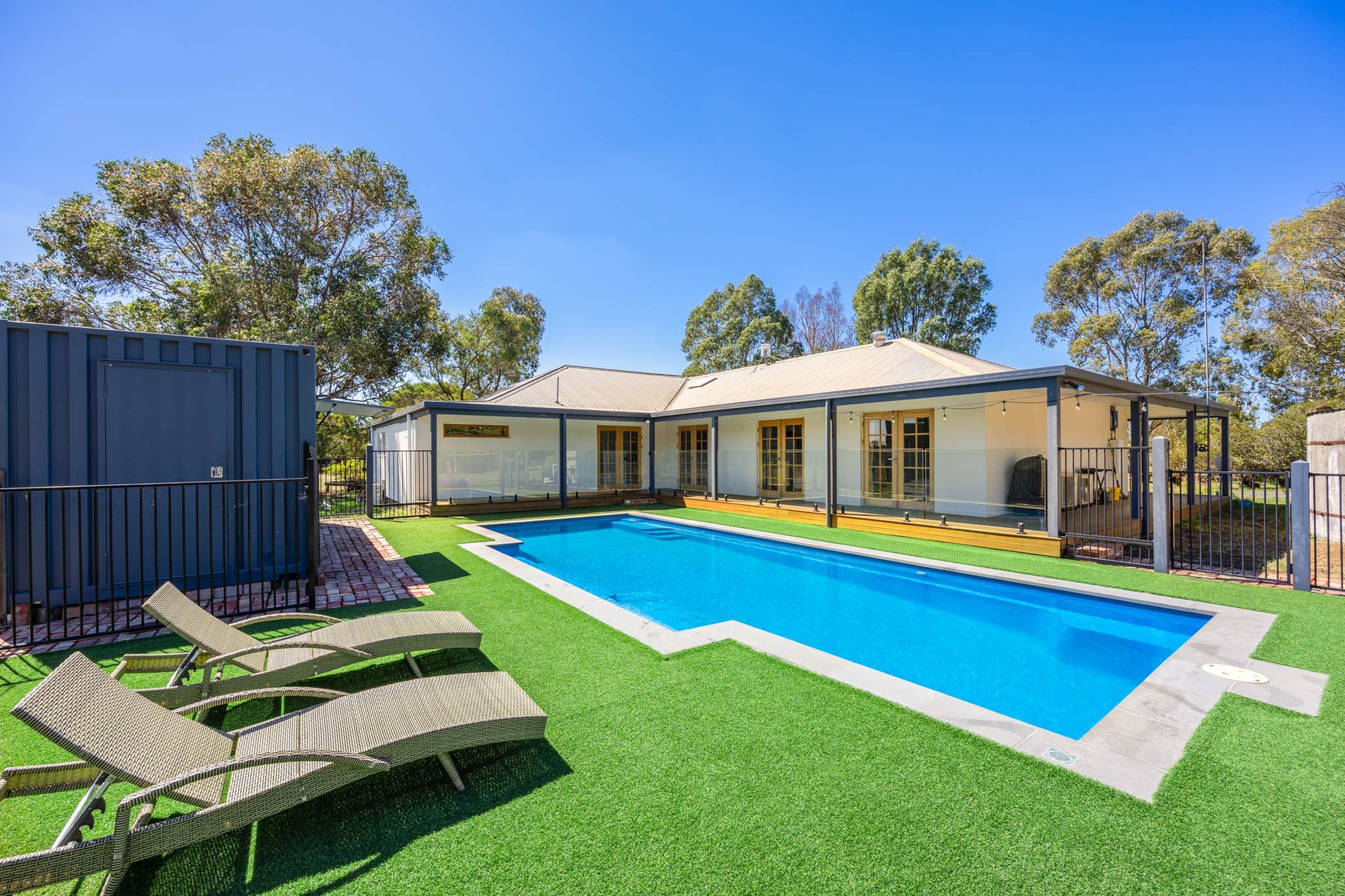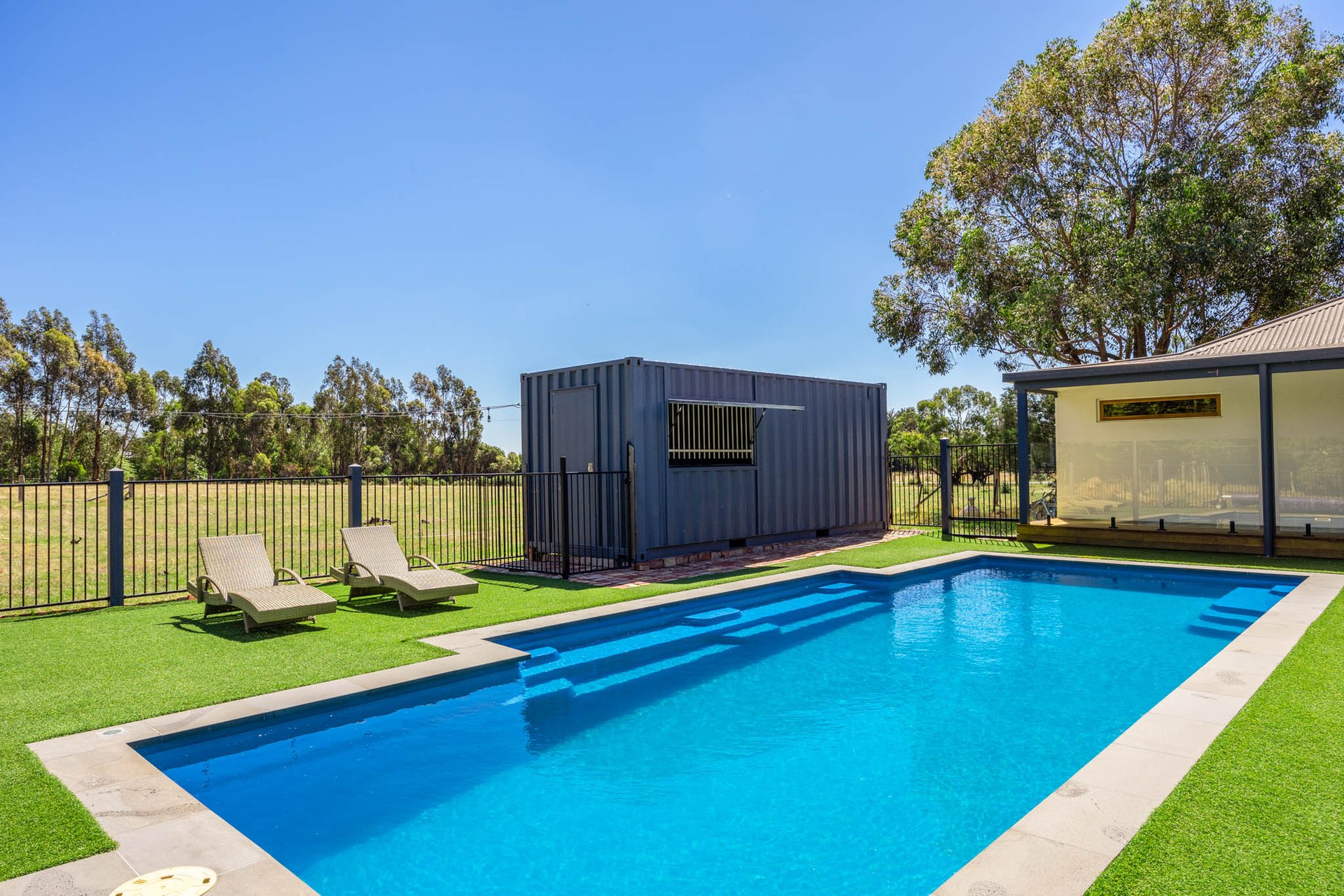 Outside, resort-inspired entertaining enhances the lifestyle appeal, centred around a swimming pool accompanied by a distinctive shipping-container pool house, creating a striking and practical outdoor retreat.