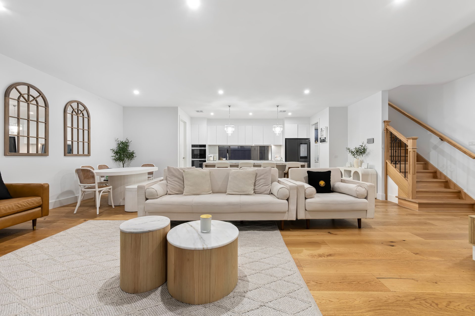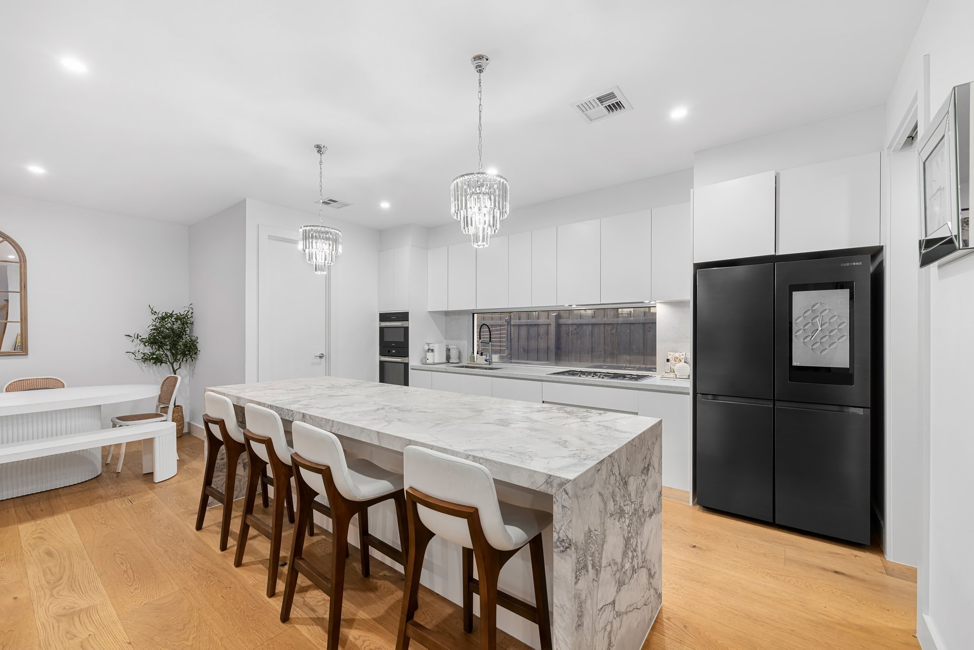 From the moment you enter, you’ll be captivated by the exquisite detailing, ornate wrought iron accents, and premium inclusions that define the home’s exceptional quality. The welcoming entry flows seamlessly into an expansive open-plan living and dining domain, complemented by a superbly appointed kitchen featuring striking glass and porcelain finishes, a stylish butler’s pantry, Miele appliances, Franke sinks, soft-close cabinetry, and elegant pendant lighting.