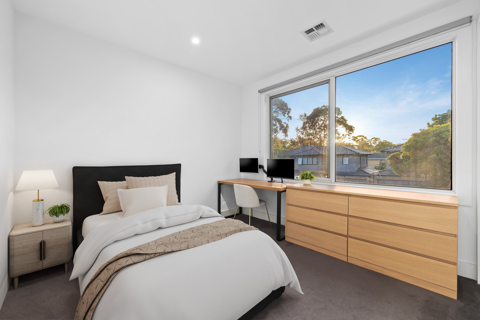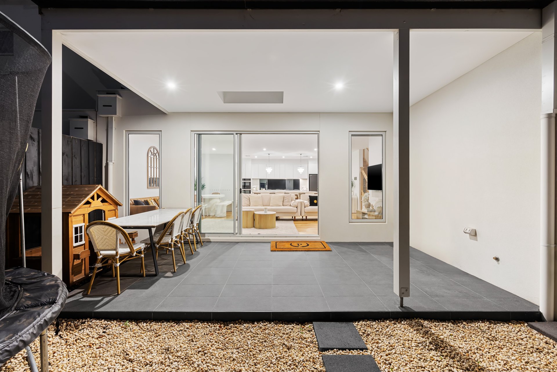The living and dining area extends outdoors to a private covered alfresco deck, overlooking a beautifully landscaped garden and courtyard — perfect for relaxed entertaining year-round. The ground floor is completed by a robed guest bedroom with ensuite, a well-appointed laundry, and a convenient powder room.