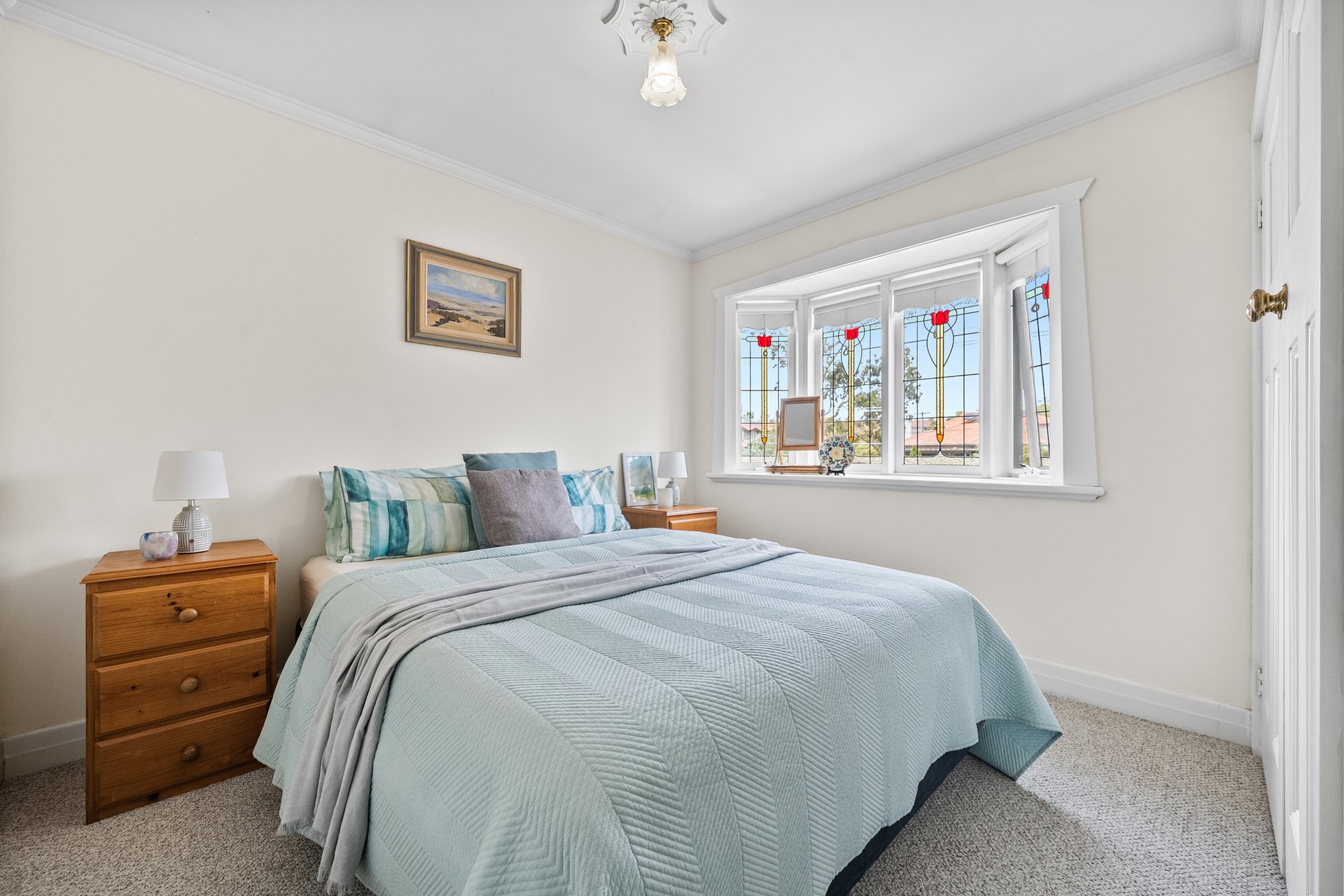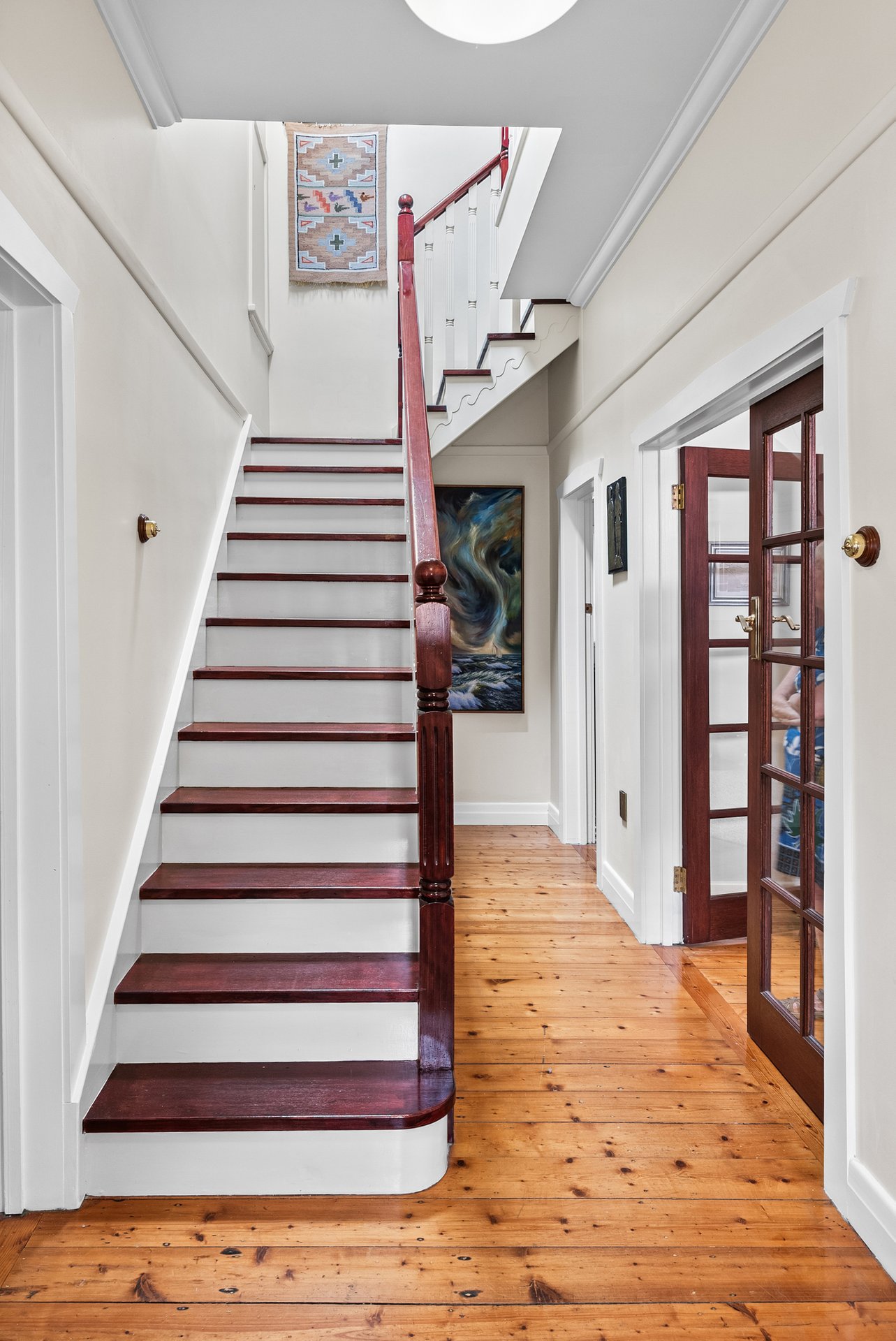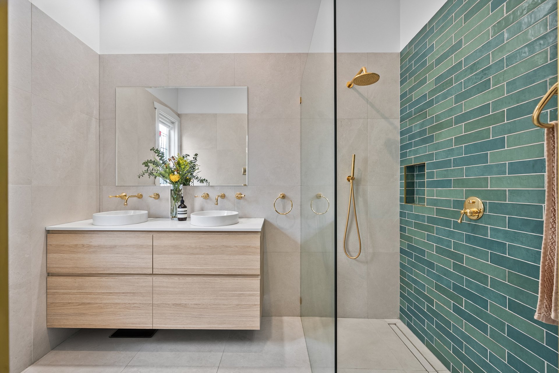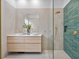 Accommodation is cleverly zoned across both levels, with a ground-floor master suite enjoying a sleek modern ensuite with dual vanity, while the upstairs bedrooms are serviced by a beautifully appointed, period-inspired bathroom.
