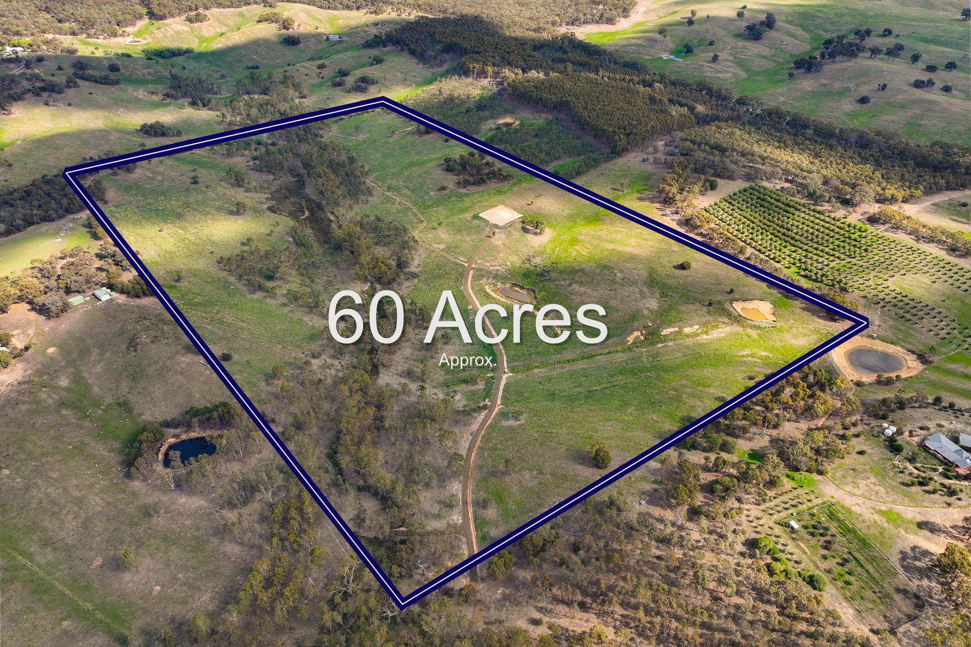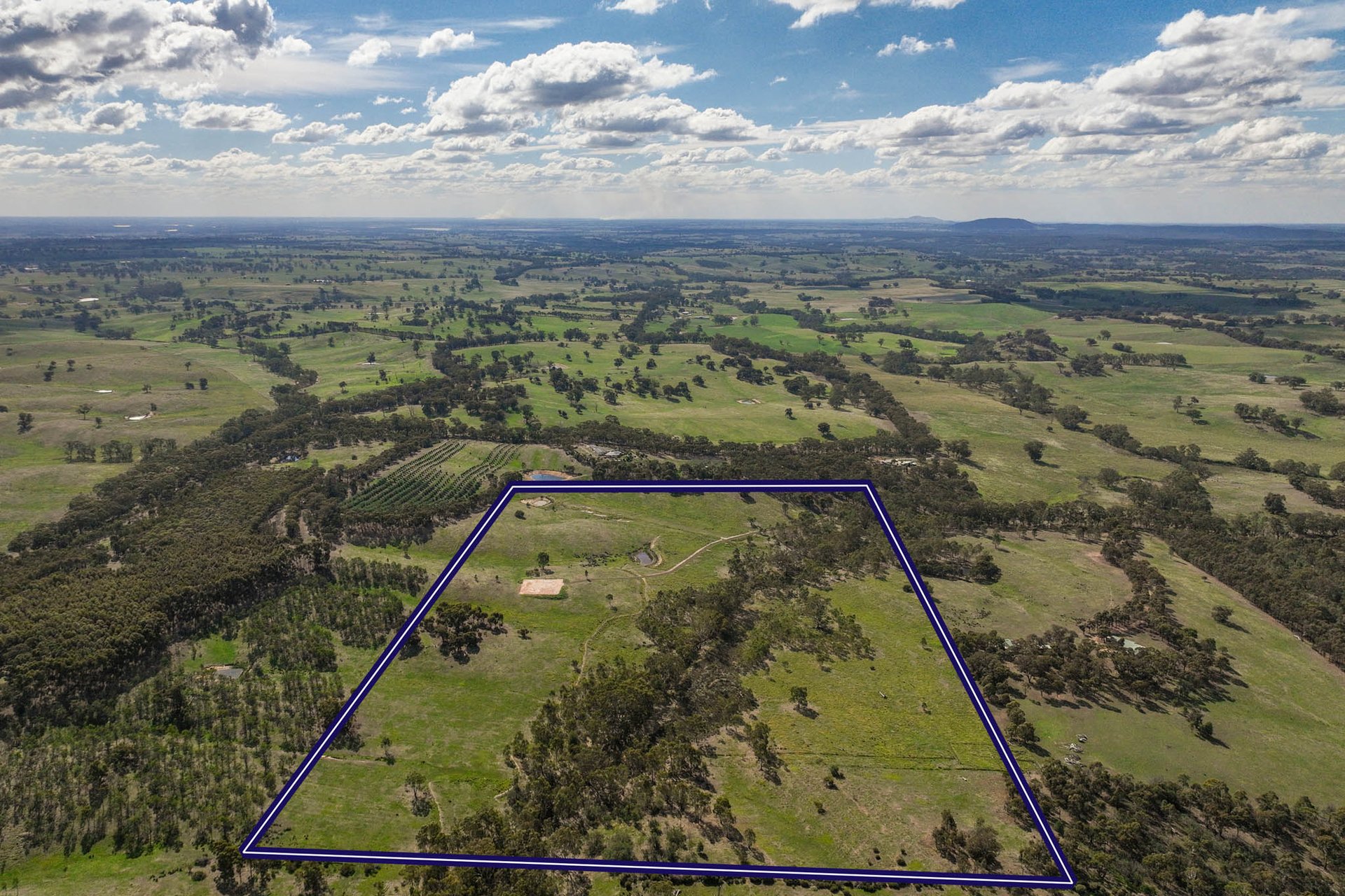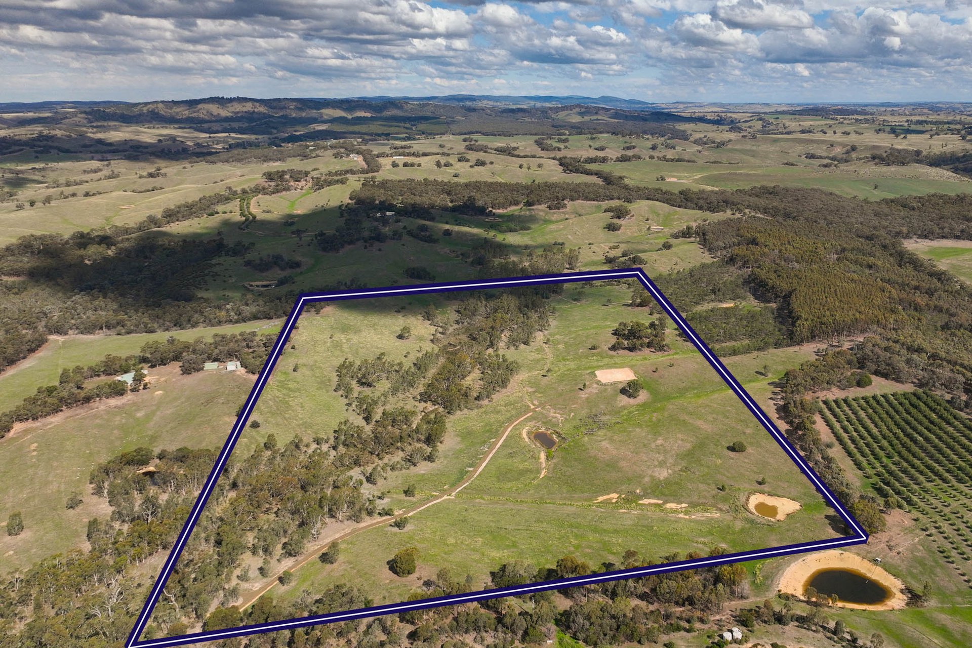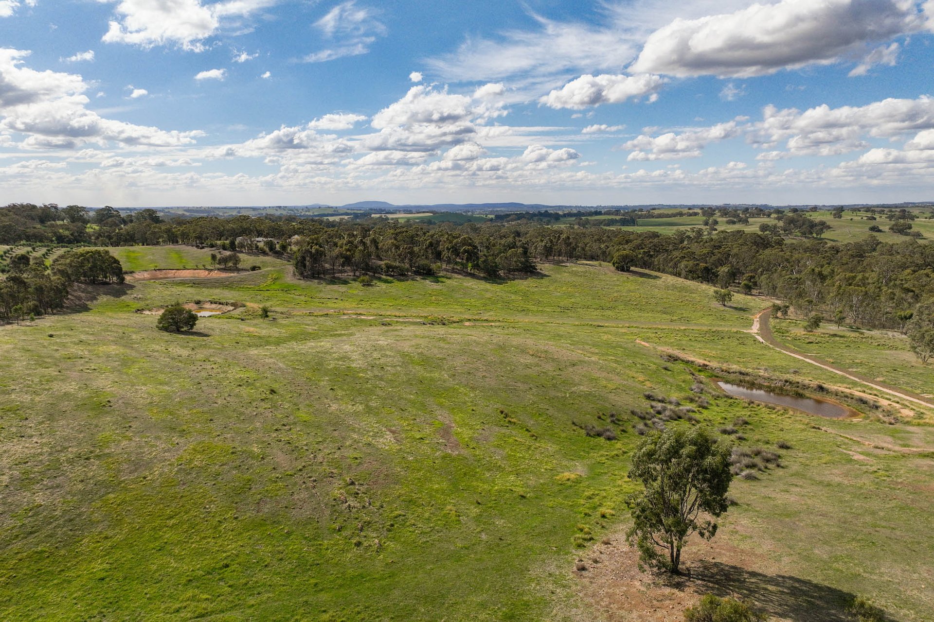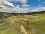 The landscape unfolds with gentle undulation, with a seasonal creek weaving through the property, complemented by two dams and a canopy of established trees. Wide-ranging views extend across the surrounding countryside, creating a setting defined by openness, tranquillity, and connection to nature.