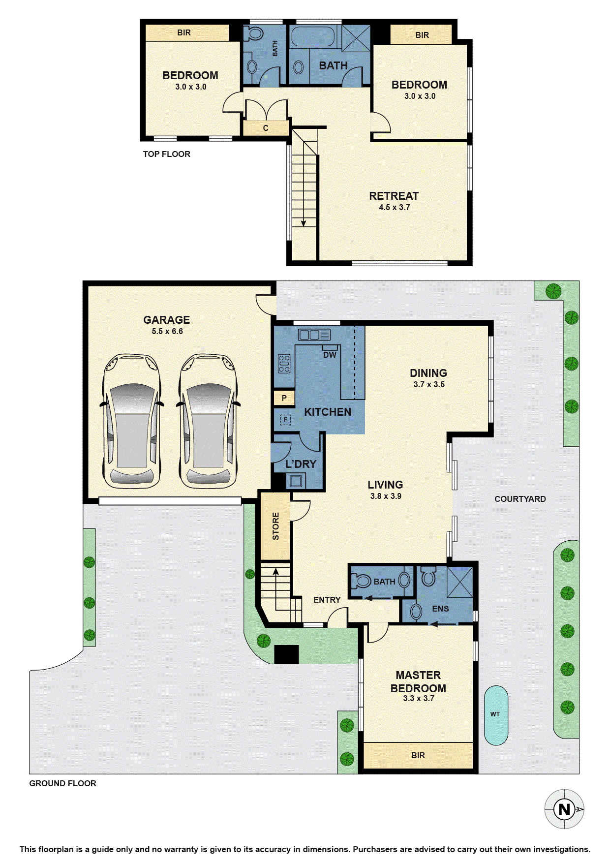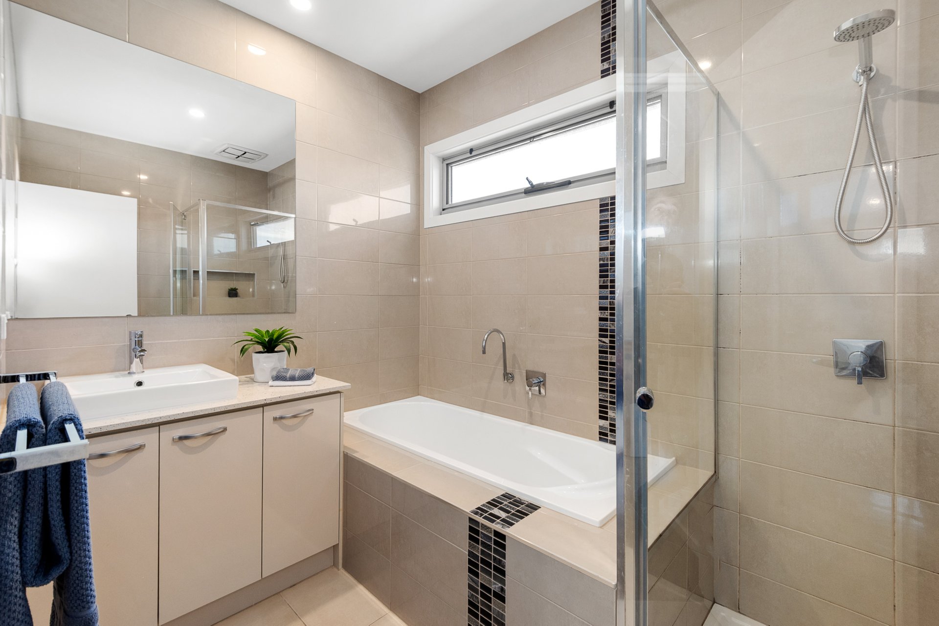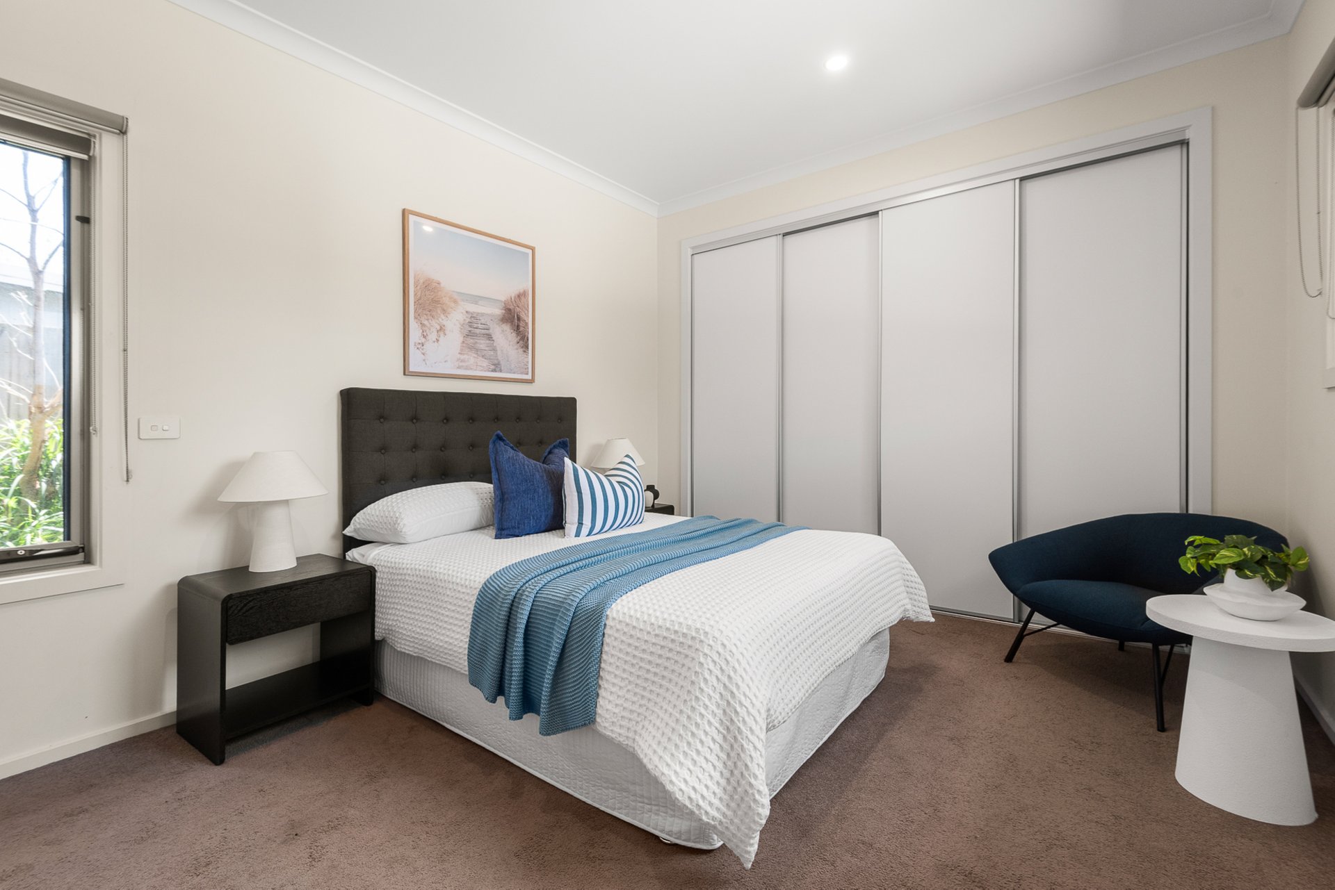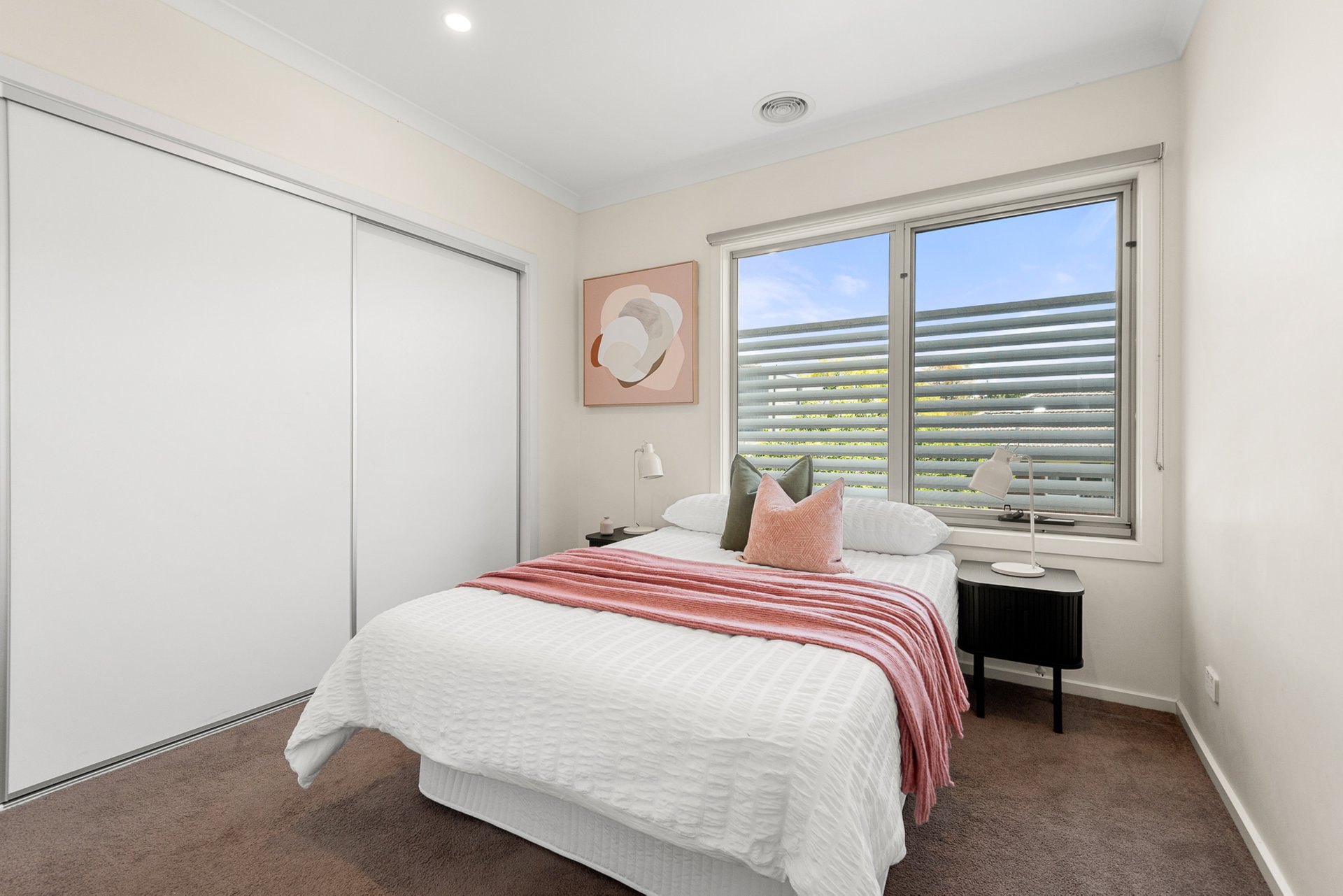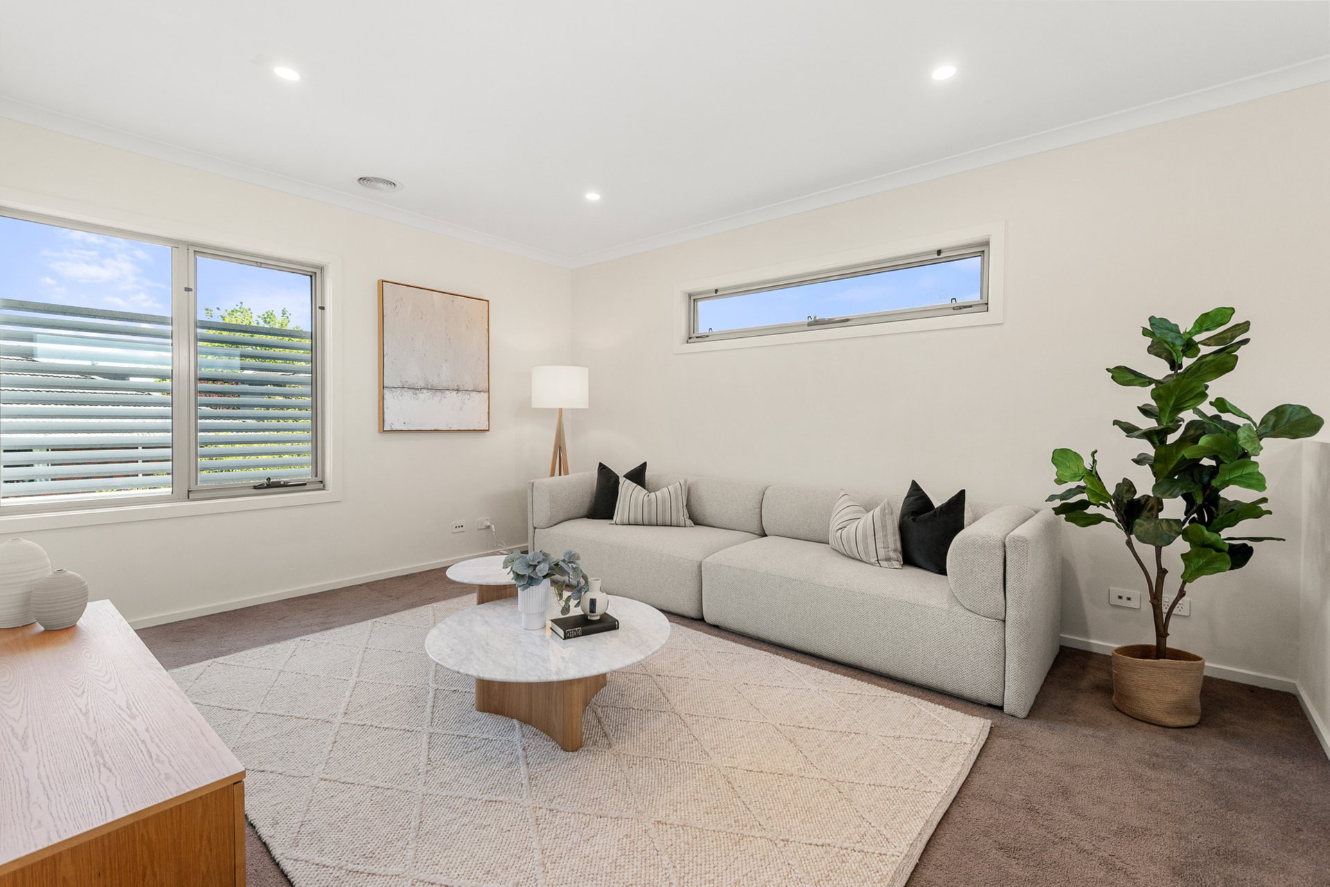 The serene downstairs master bedroom offers carpeted comfort, extensive built-in-wardrobes and a private en suite with walk-in shower and vanity. Upstairs two further generously sized bedrooms - both with built-in-wardrobes – are complemented by a family bathroom, with bath, separate shower and storage vanity. A large, versatile retreat provides the perfect space for a media room, additional relaxation area or study.