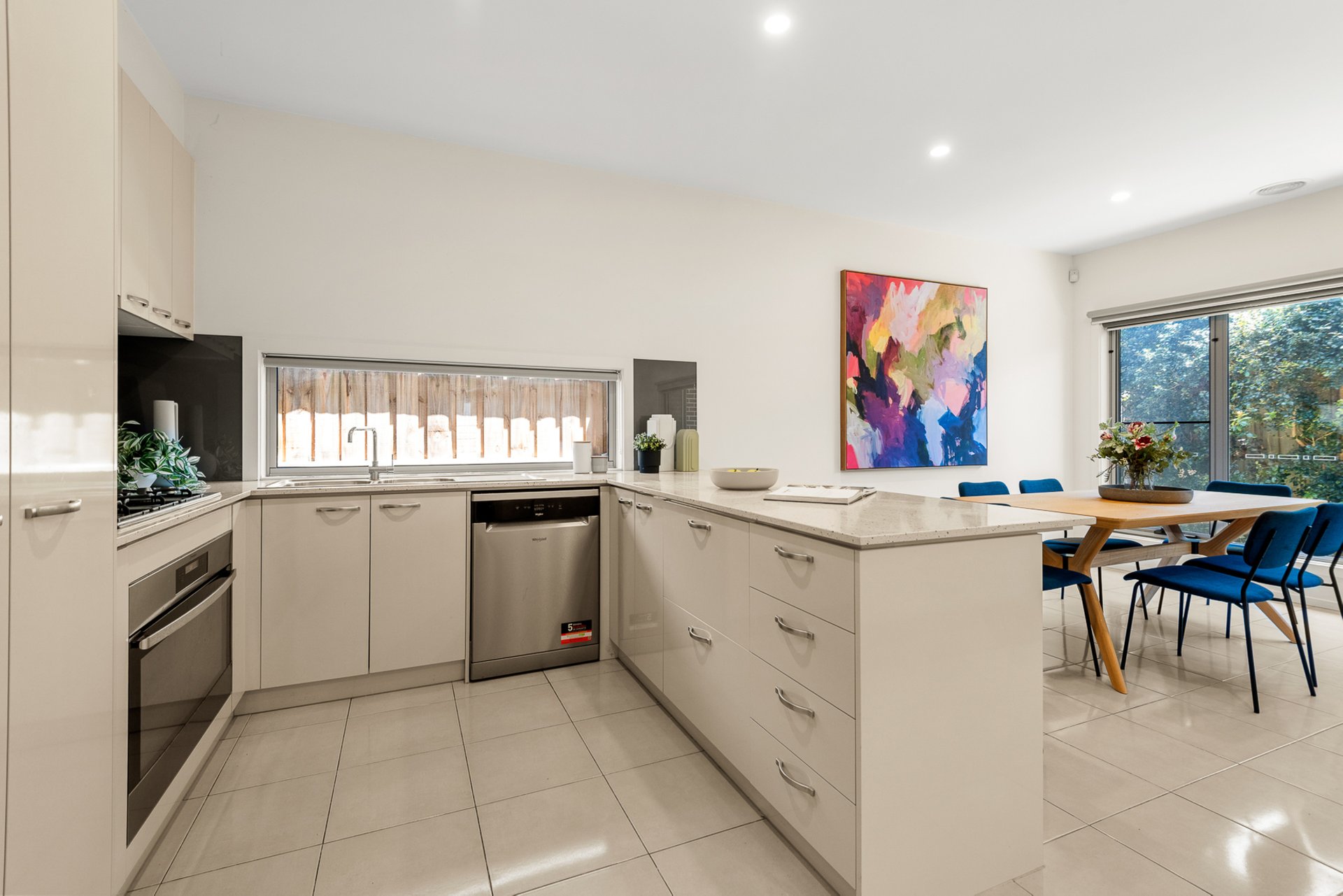The spacious downstairs living area features high ceilings and sliding glass doors that open to the north facing alfresco dining area. The well-appointed kitchen includes a Westinghouse gas cooktop, 90 cm electric oven and dishwasher, there is an abundance of drawers, cupboards and bench space, while the adjoining dining zone enjoys a garden outlook through expansive windows.