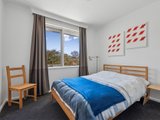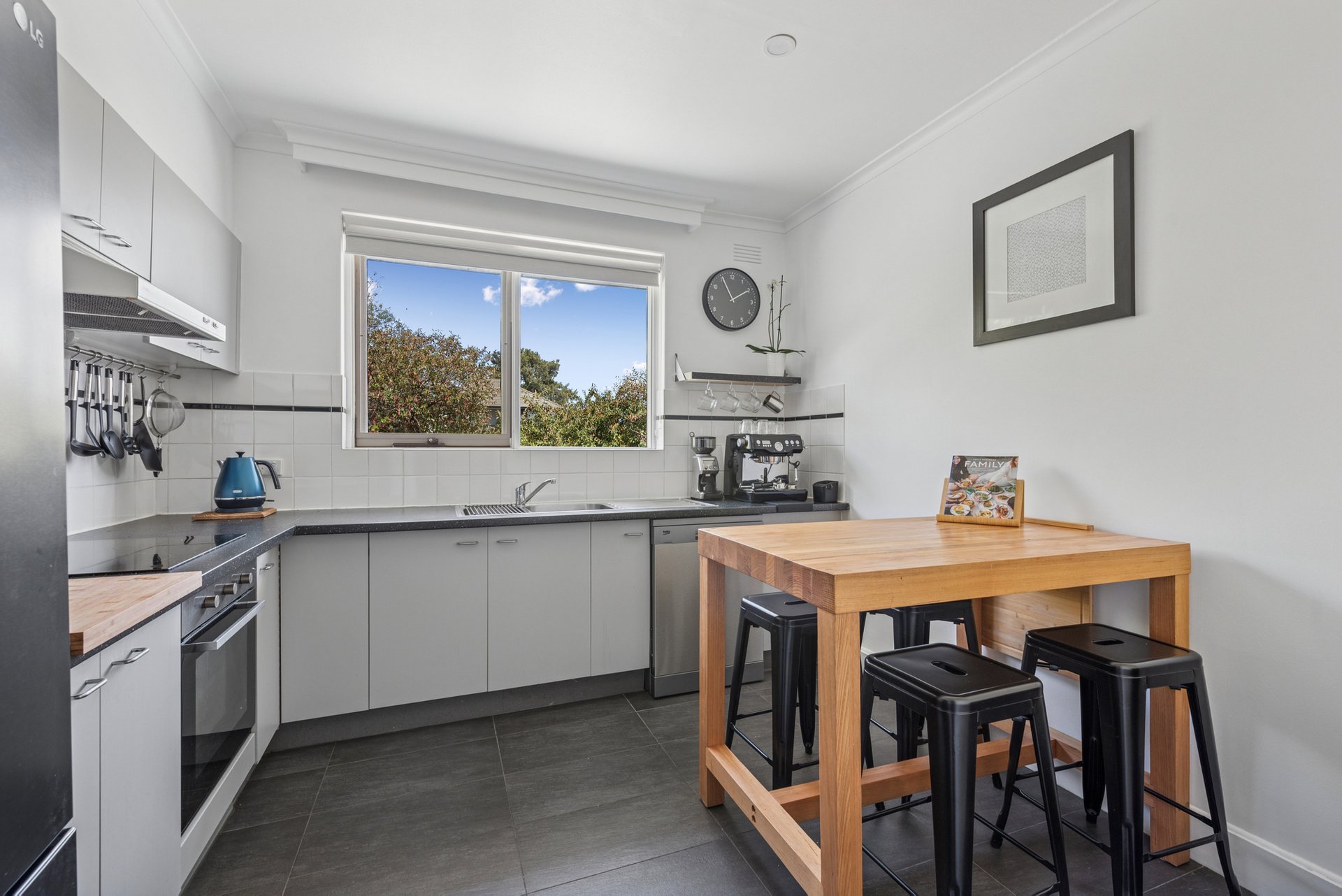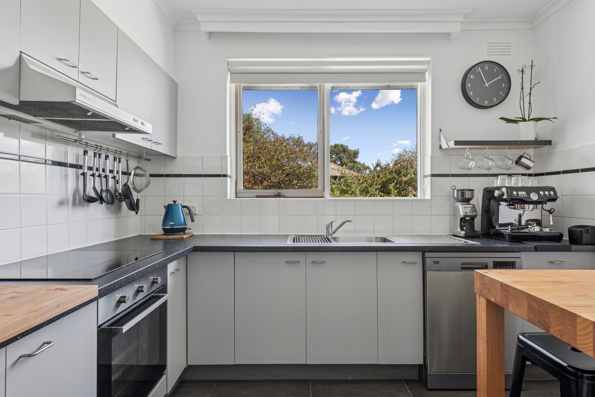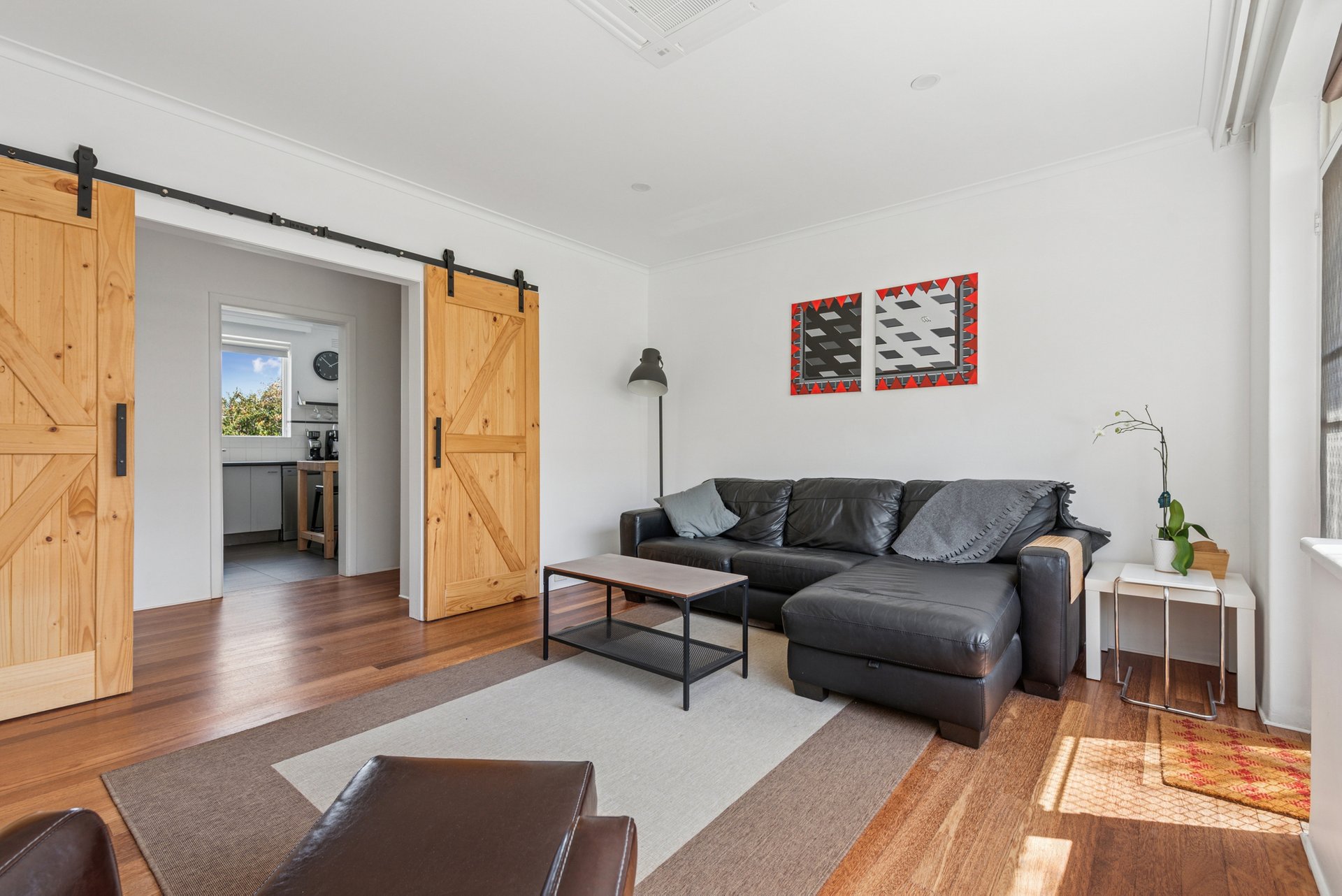 The generous living and dining room has a lovely ambience with timber floors underfoot and barn-style sliding doors adding a touch of individuality. The balcony opens from here, drawing in the northern light and giving you a quiet spot to unwind among the treetops.
