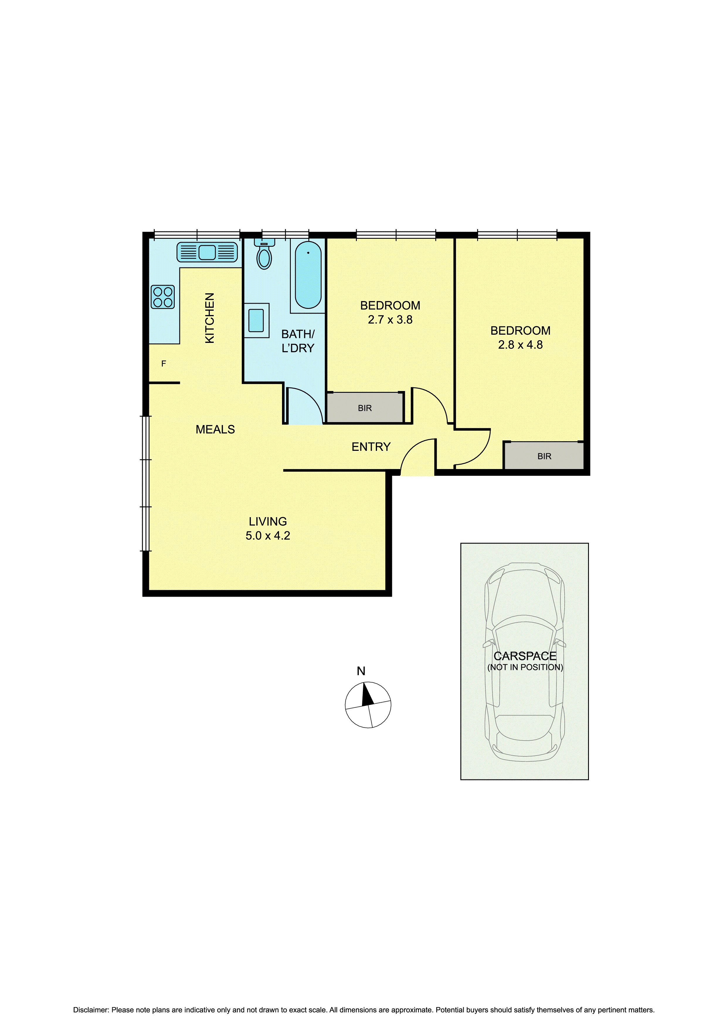 Both generously sized bedrooms include built-in roes and are serviced by a sleek central bathroom with laundry facilities. Additional features include off-street parking and a peaceful first-floor position that enhances privacy and security.