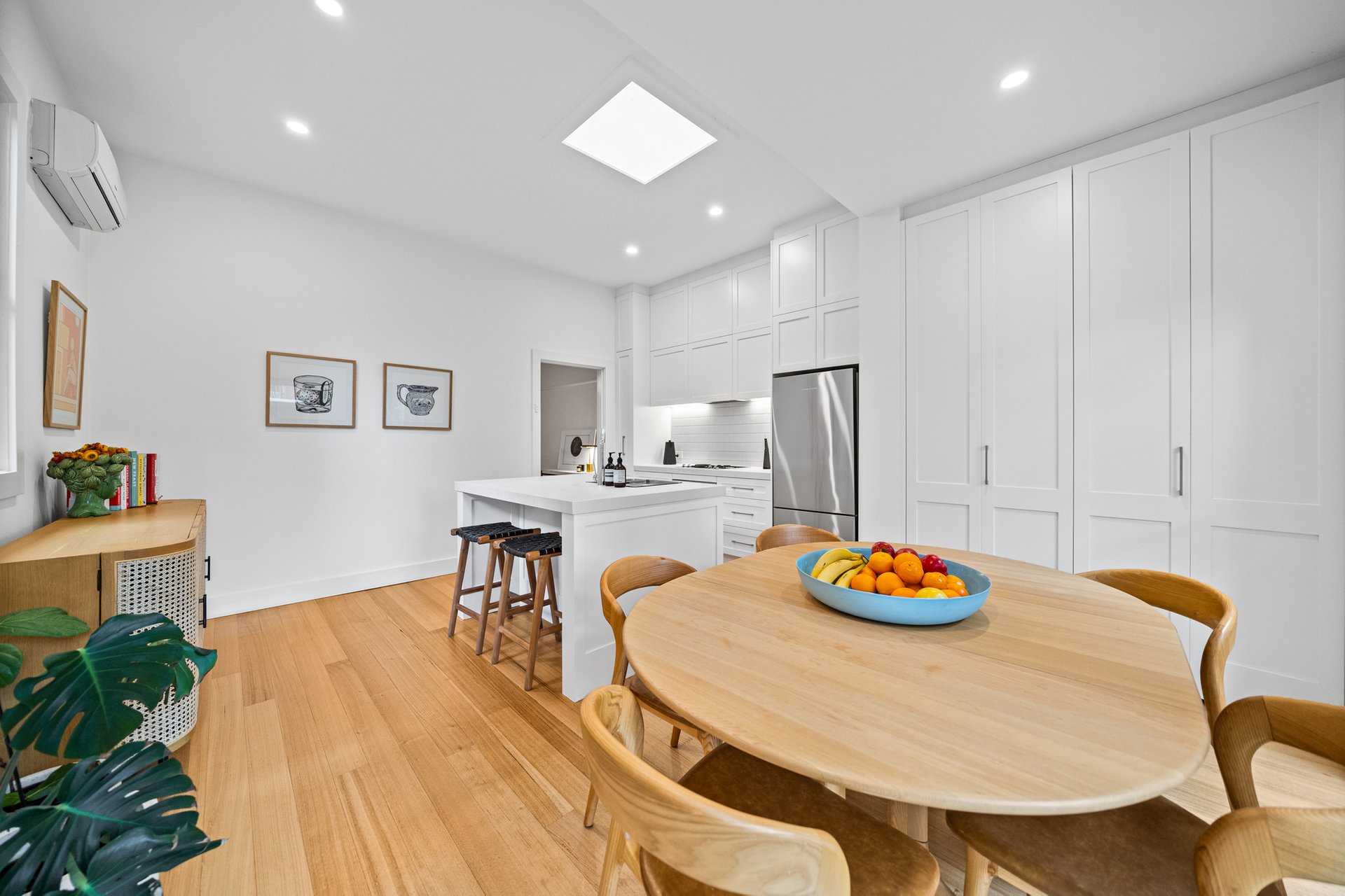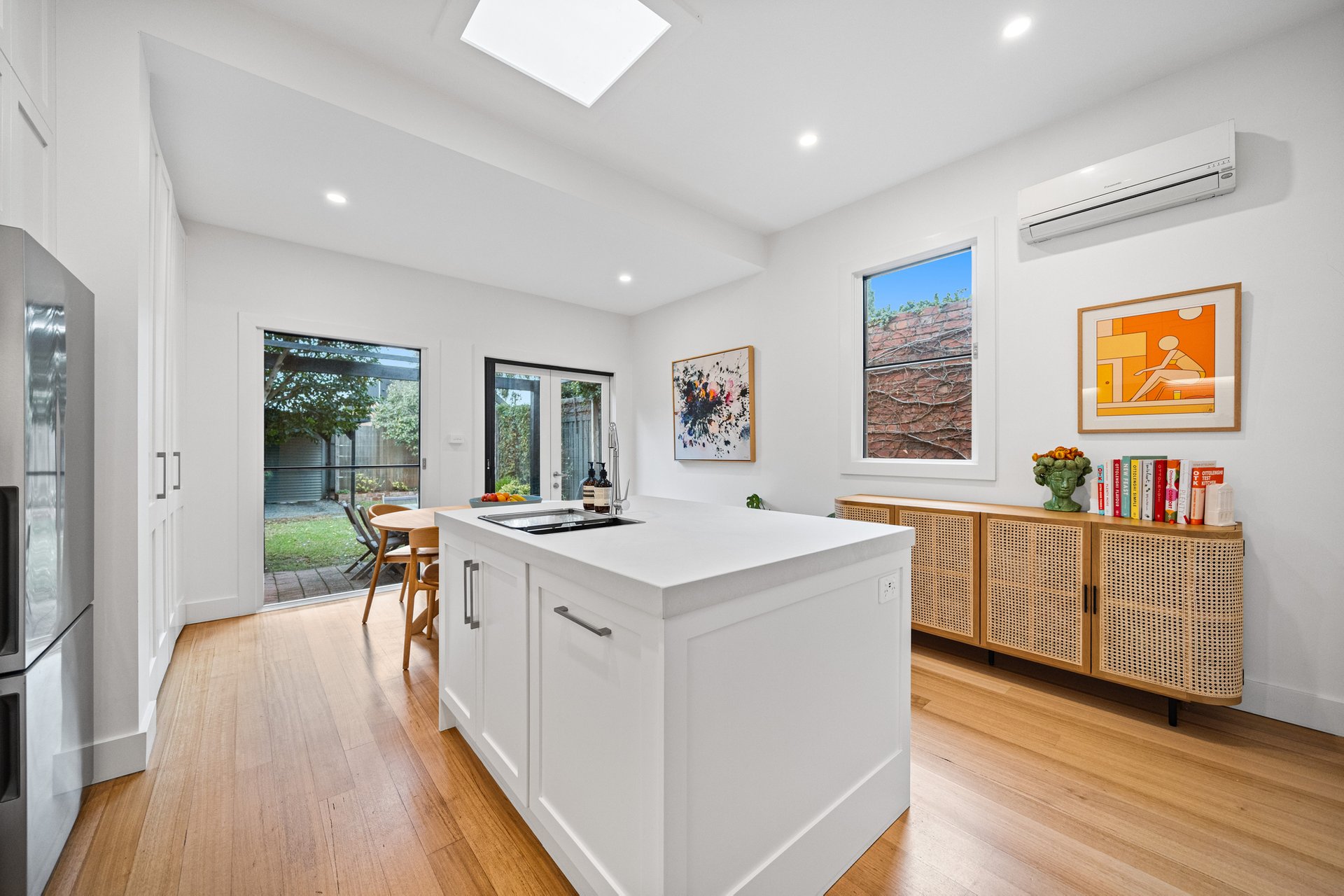Preceded by landscaped garden surrounds, on a generous allotment of 250m2, the covered front porch leads to a welcoming entrance hall and a bright and airy layout, enhanced by large windows and effective skylights that flood the home with natural light. Original timber floors flow throughout, while the recently renovated kitchen features stone benchtops, a Smeg oven and stove, and ample storage - perfect for everyday living and entertaining alike.