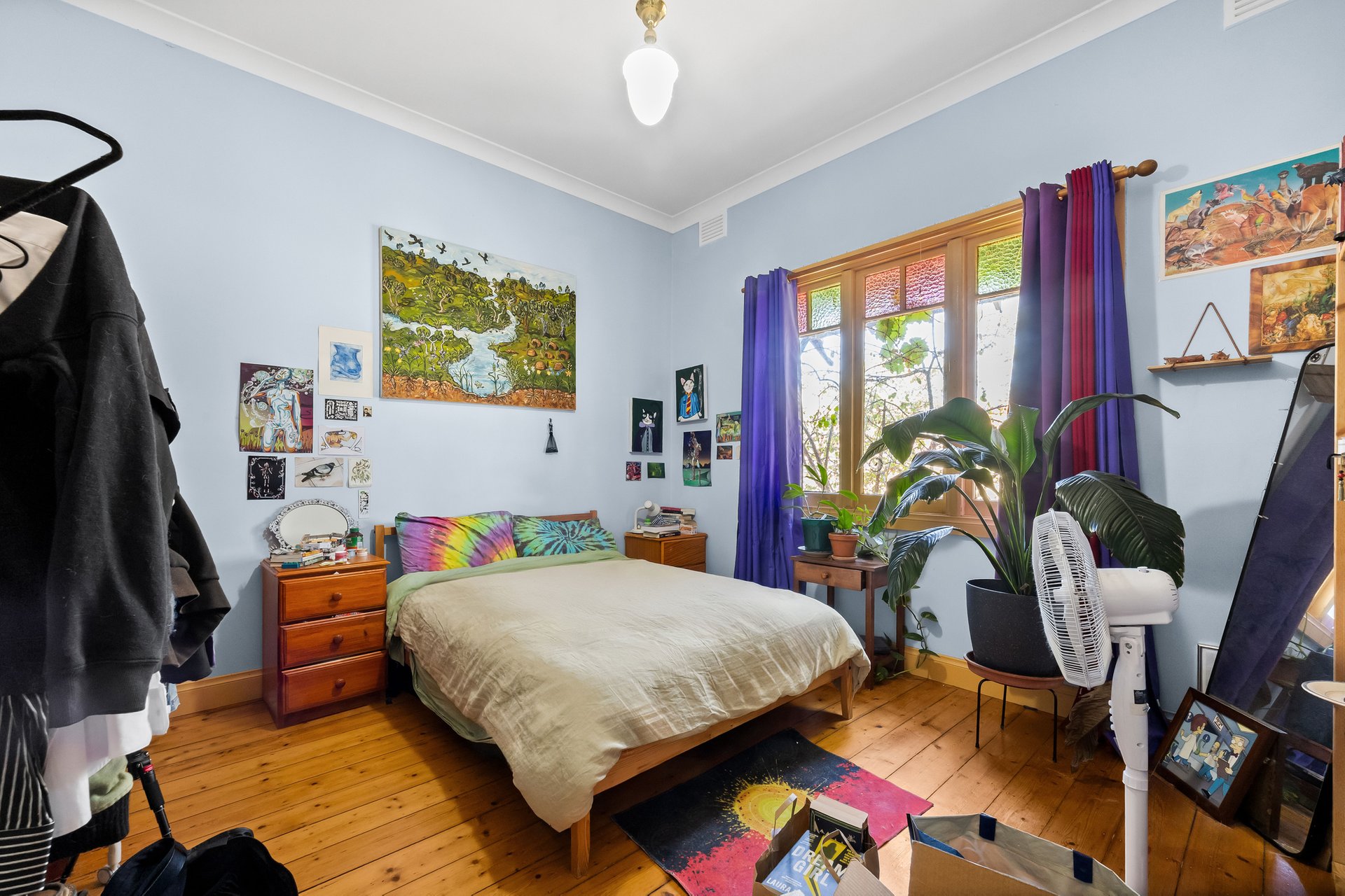 Accommodation includes three generously sized bedrooms, each with high ceilings and large windows. The two front bedrooms showcase beautiful hardwood flooring, stained glass window detailing, and ample storage, while the rear bedroom is carpeted for added comfort and also offers generous storage.