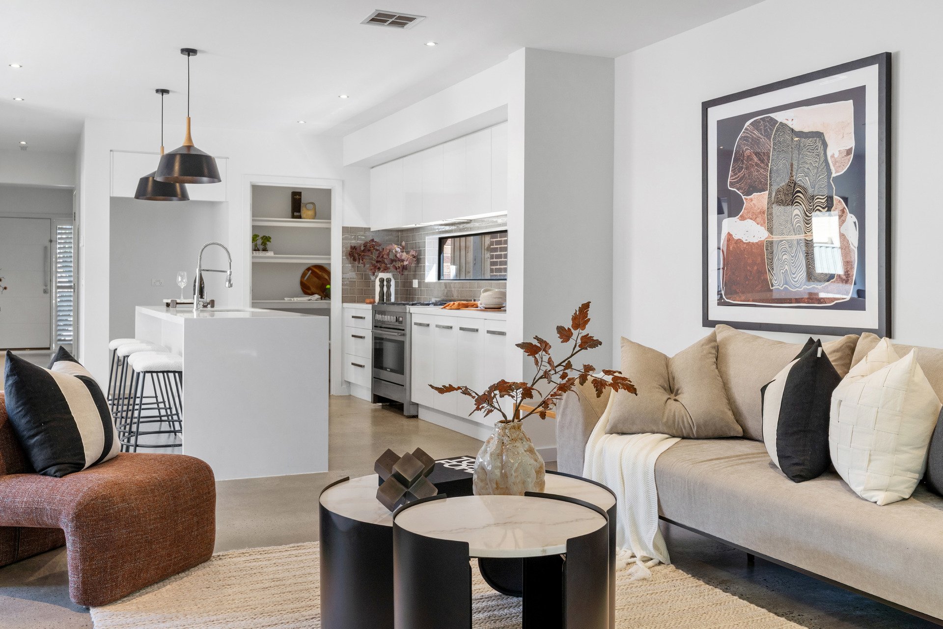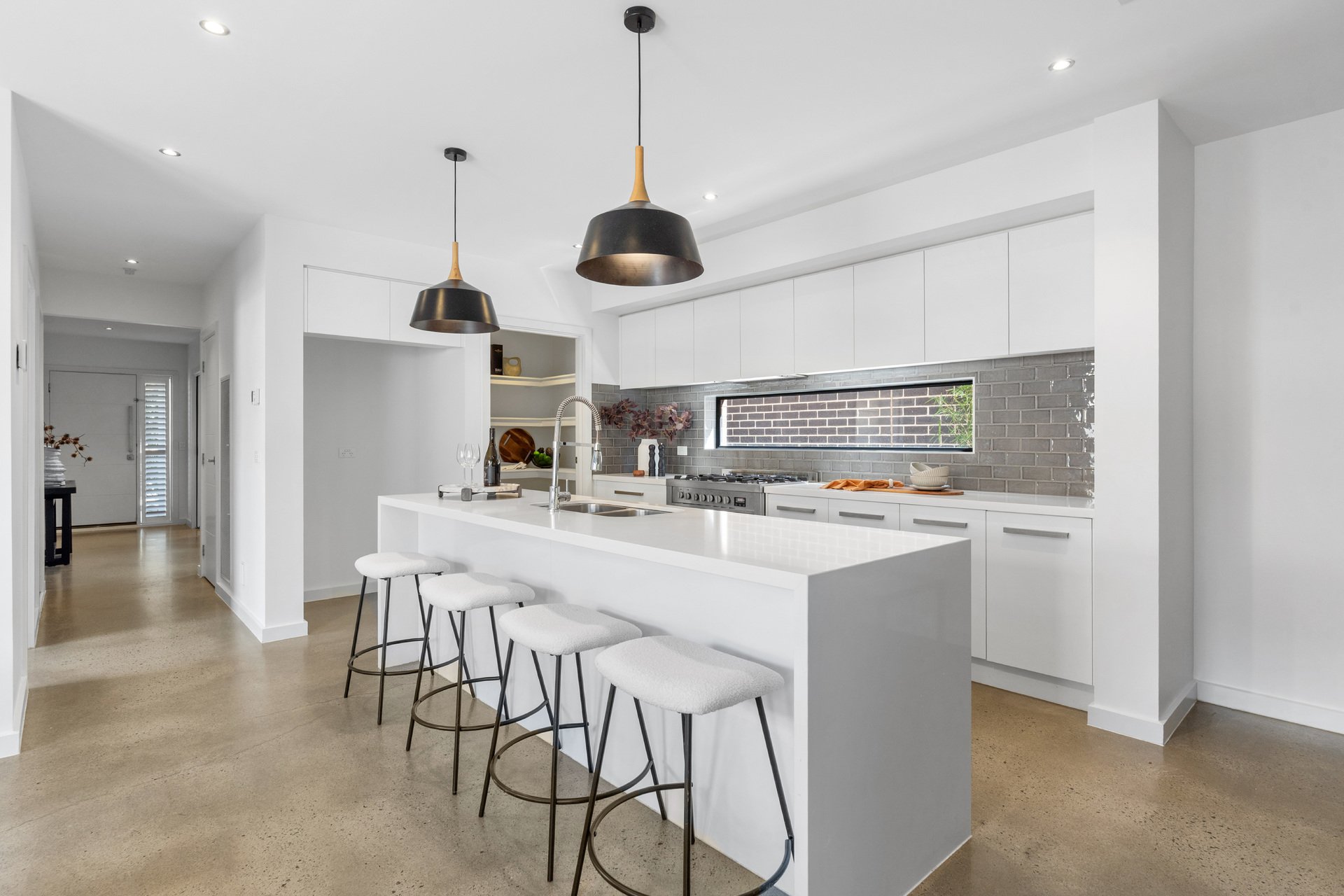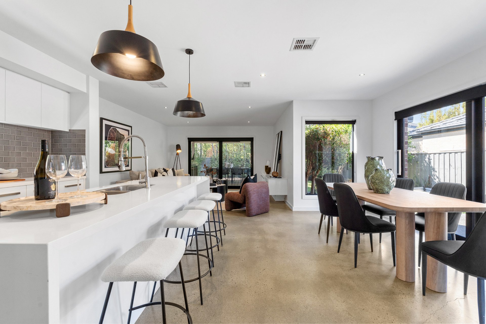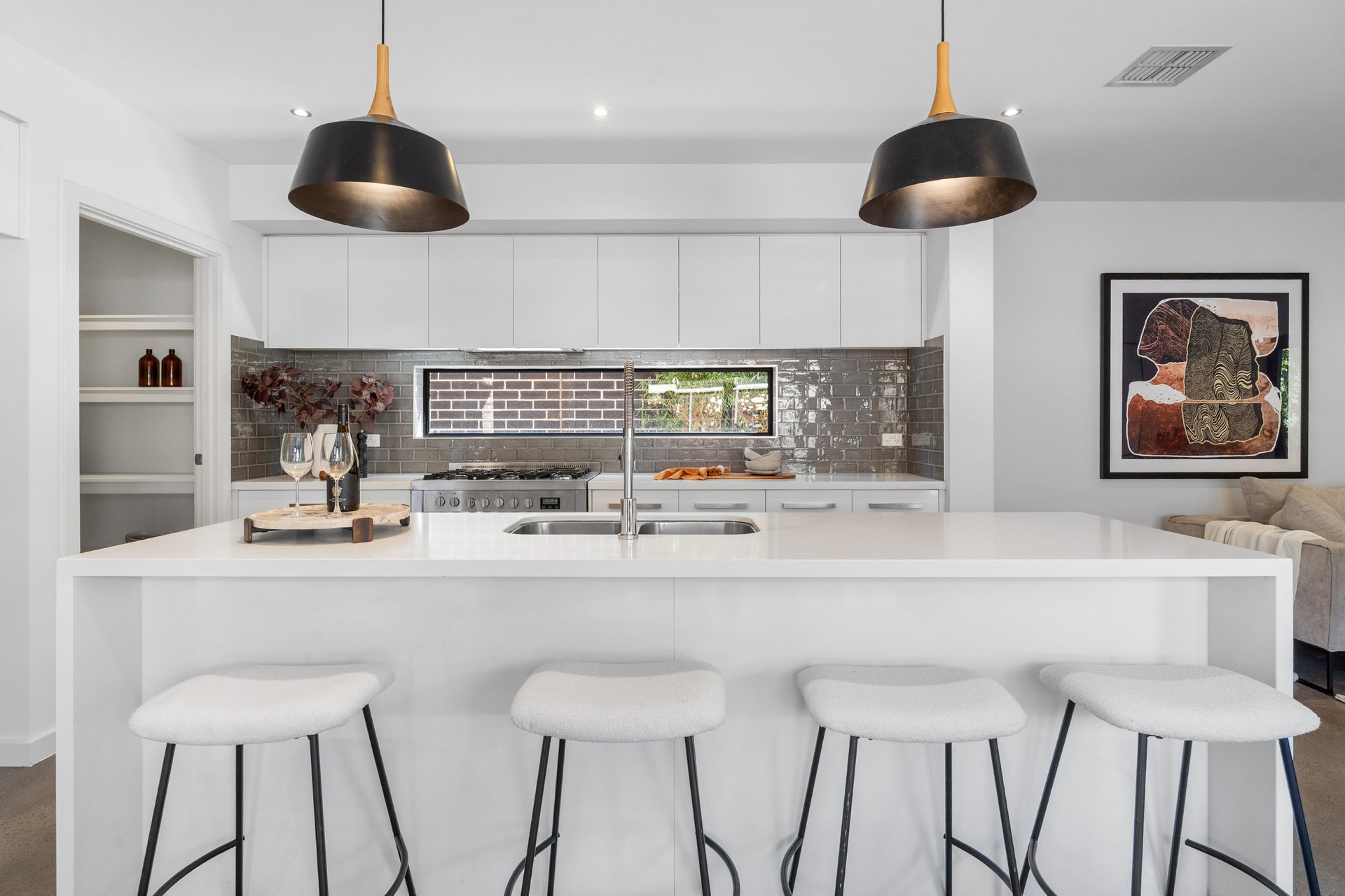Multiple living spaces ensure room for everyone, highlighted by a vast open-plan living and dining area with a tranquil garden aspect. The gourmet stone-benchtop kitchen is a central showpiece, complete with breakfast bar, walk-in pantry and quality appliances.