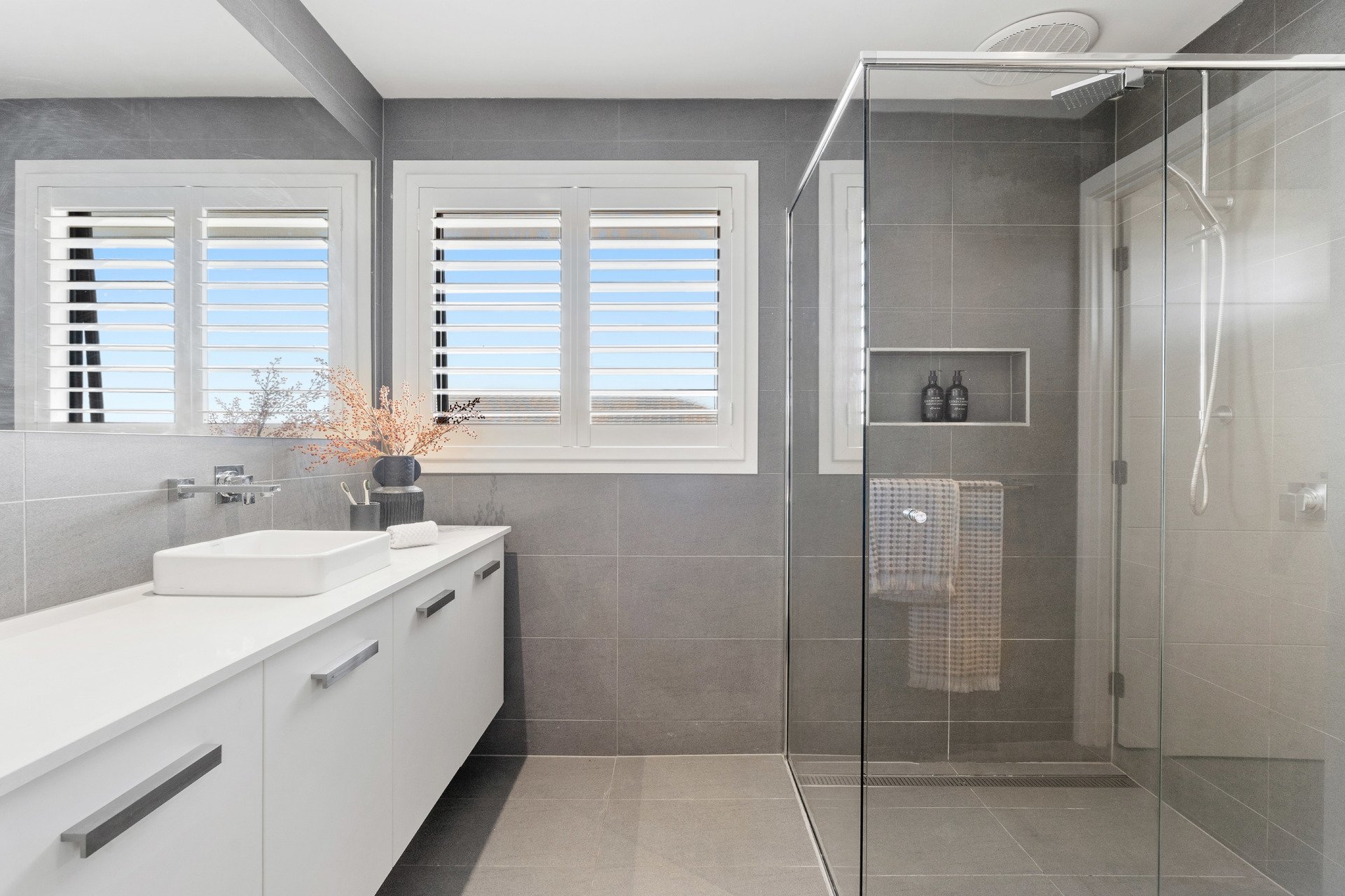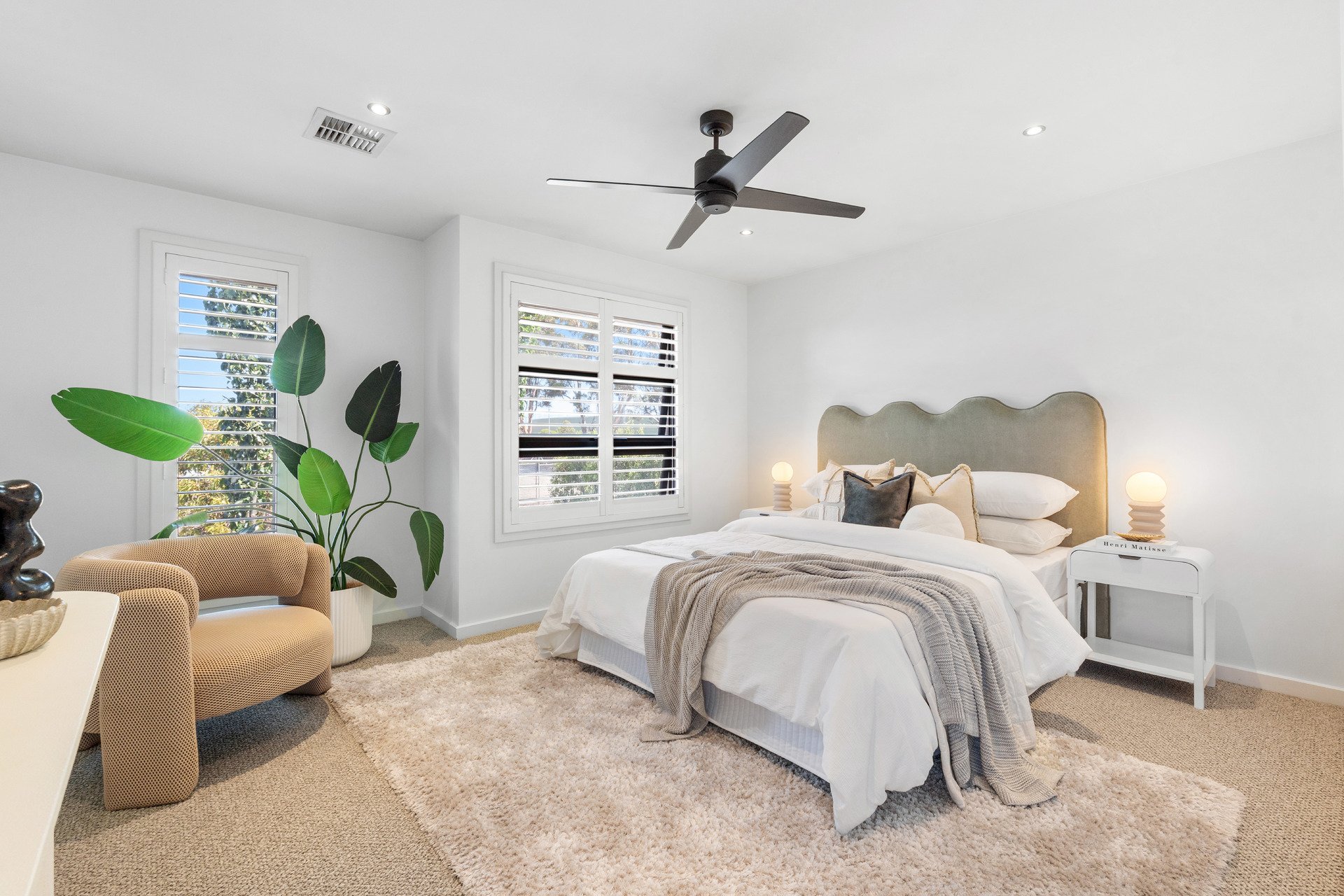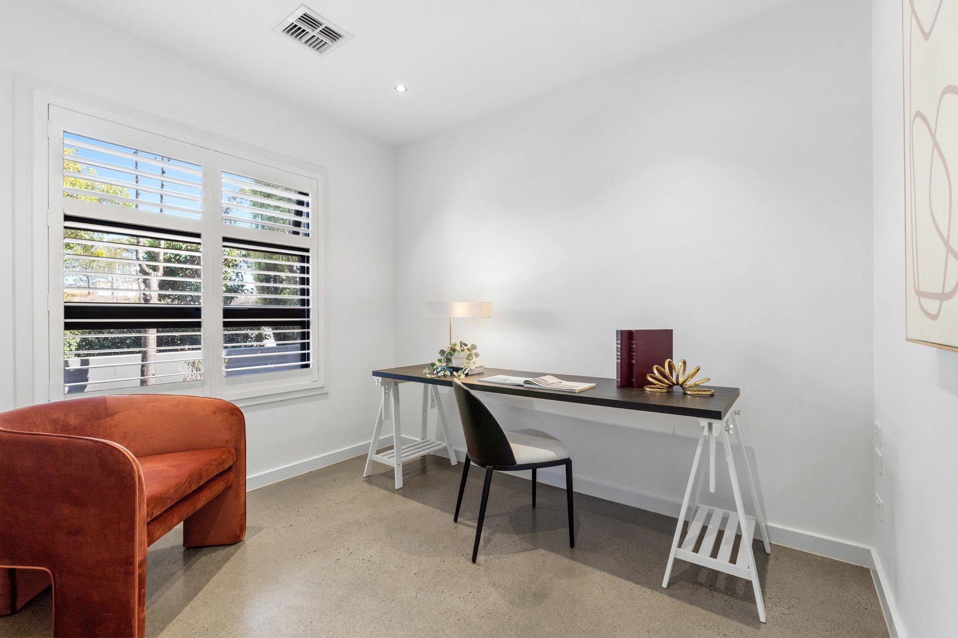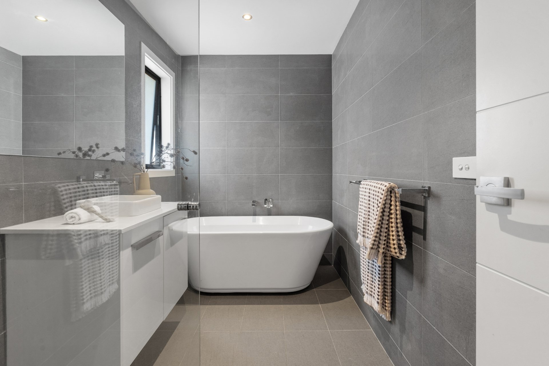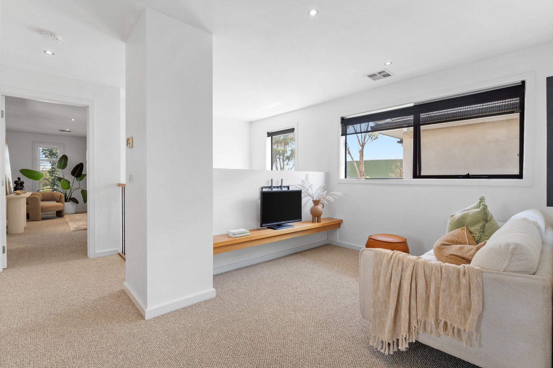 Accommodation is outstanding, with the option of up to four bedrooms. The expansive master suite includes a fully fitted walk-in robe and private ensuite, while two further bedrooms and a spacious upstairs retreat create an ideal family zone. A fourth bedroom or dedicated home office on the ground floor adds valuable flexibility. The main bathroom is elegantly appointed with full-height tiling, a free-standing bath, stone-top vanity and separate shower.