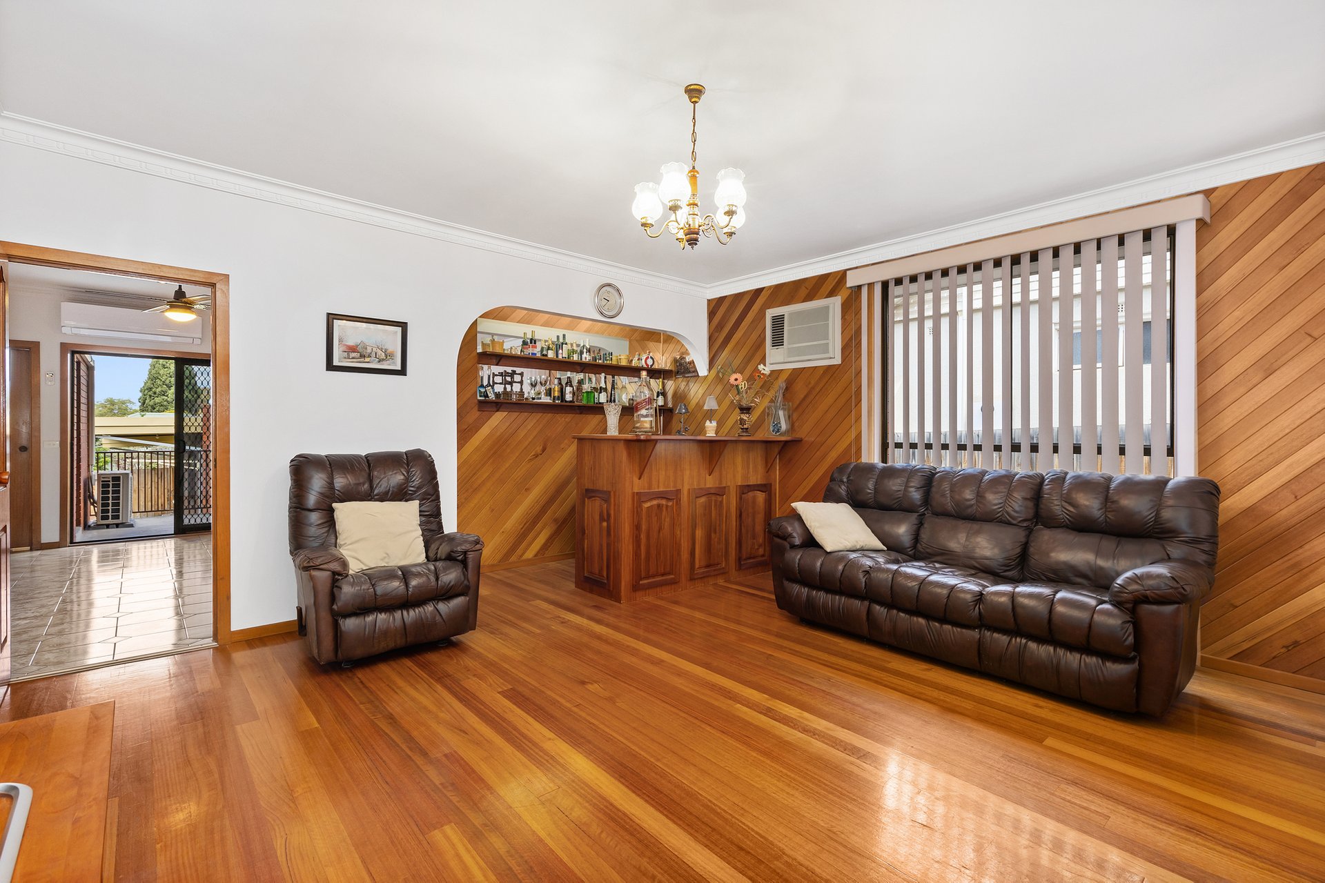 A separate lounge offers a serene retreat, enhanced by polished hardwood floors and a custom-built timber bar with sink, perfect for entertaining or relaxing in style. Additional highlights include ducted heating and a split system to ensure year-round comfort, while a generous laundry plus ample hallway storage complete practical family living.