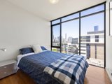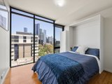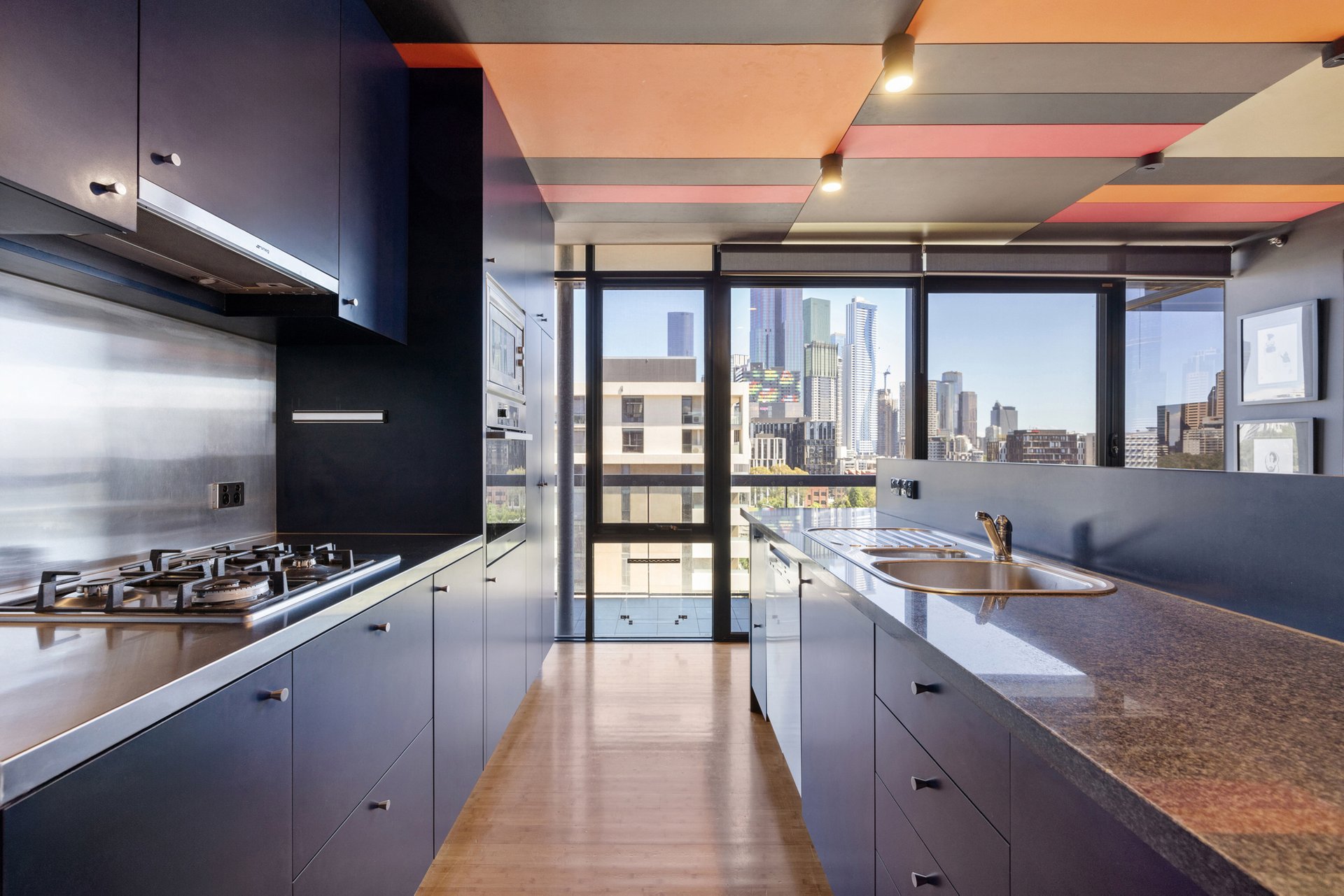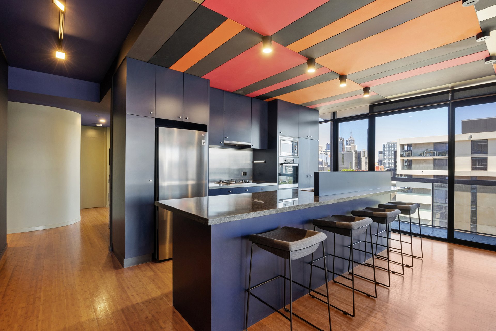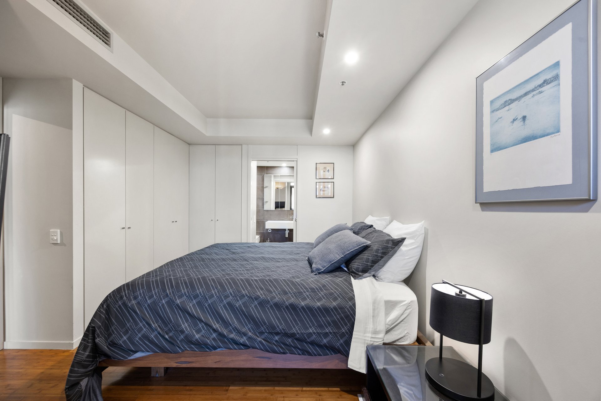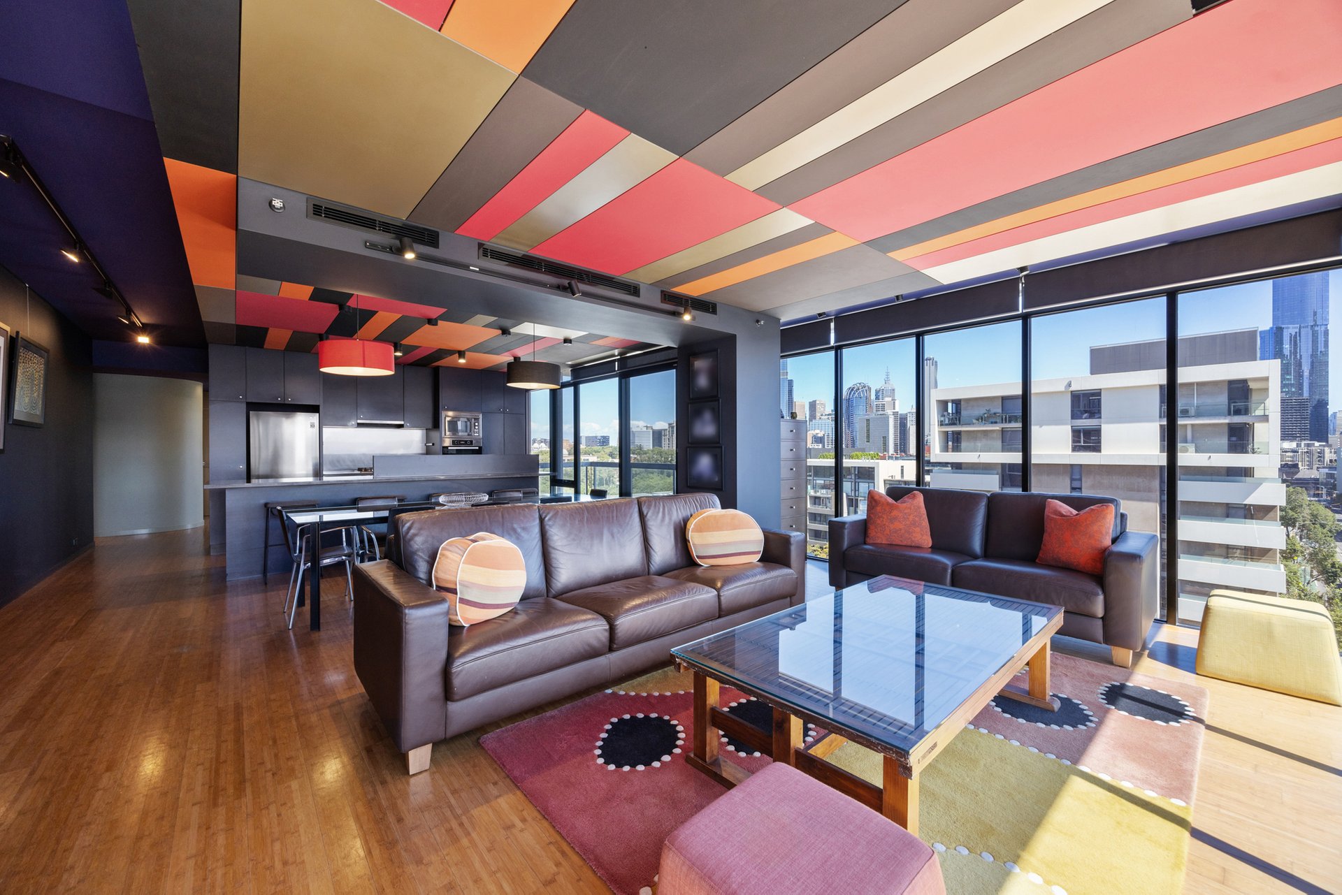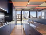 The open-plan living and dining area is generous in scale and framed by floor-to-ceiling glazing, drawing in abundant natural light and capturing Melbourne CBD views. Timber flooring flows throughout, while direct access to the balcony from the dining zone creates a seamless indoor–outdoor connection suited to both everyday living and entertaining.