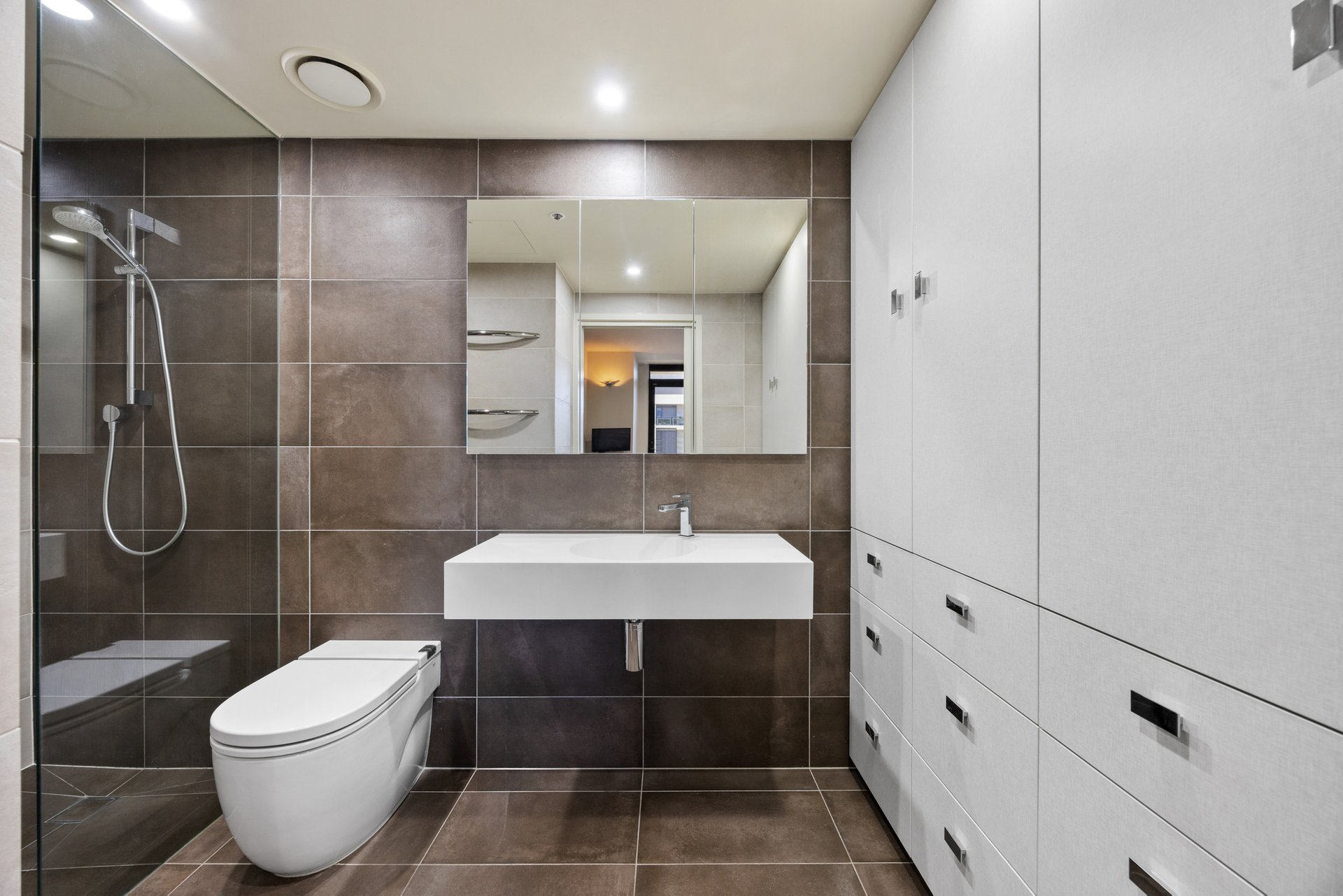 Bedrooms are well proportioned and includes built-in robes. The main bedroom features its own private balcony and ensuite, offering a quiet retreat with excellent natural light. Both bathrooms are finished with floor-to-ceiling tiles, frameless shower screens and floating vanities. Further features include ducted heating and cooling, a fully fitted laundry, an abundance of storage throughout, ceilings that add a unique architectural detail, and two secure car spaces.