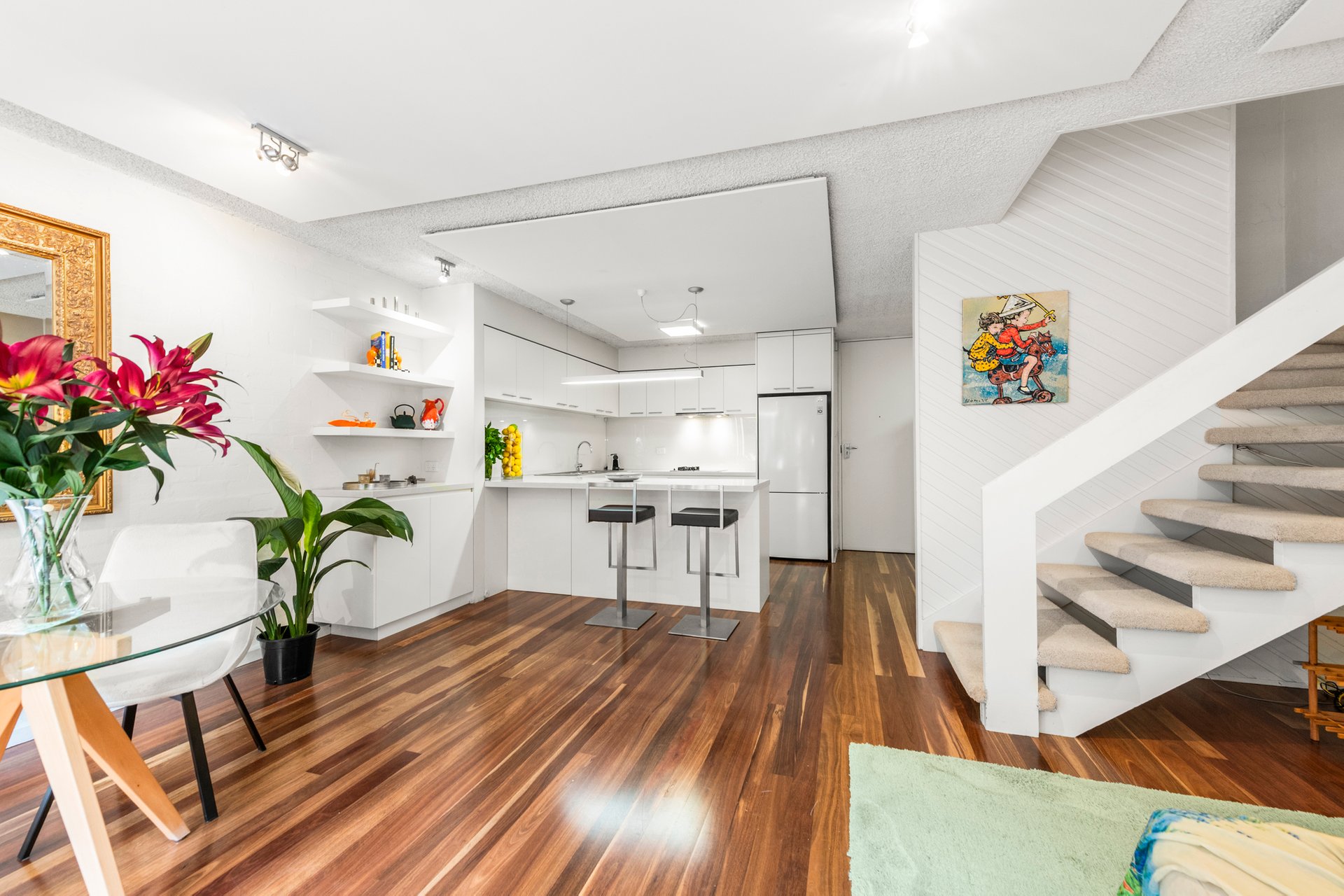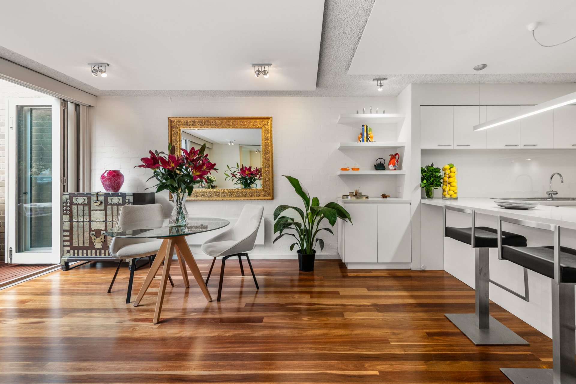 The flexible, spacious open plan living and dining space features spotted gum timber flooring and bi-fold doors to the sun filled deck and leafy tree-lined courtyard.