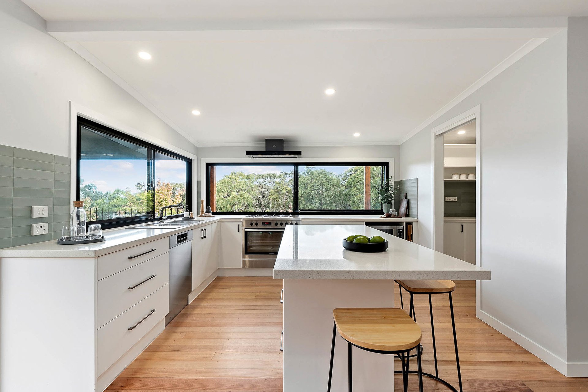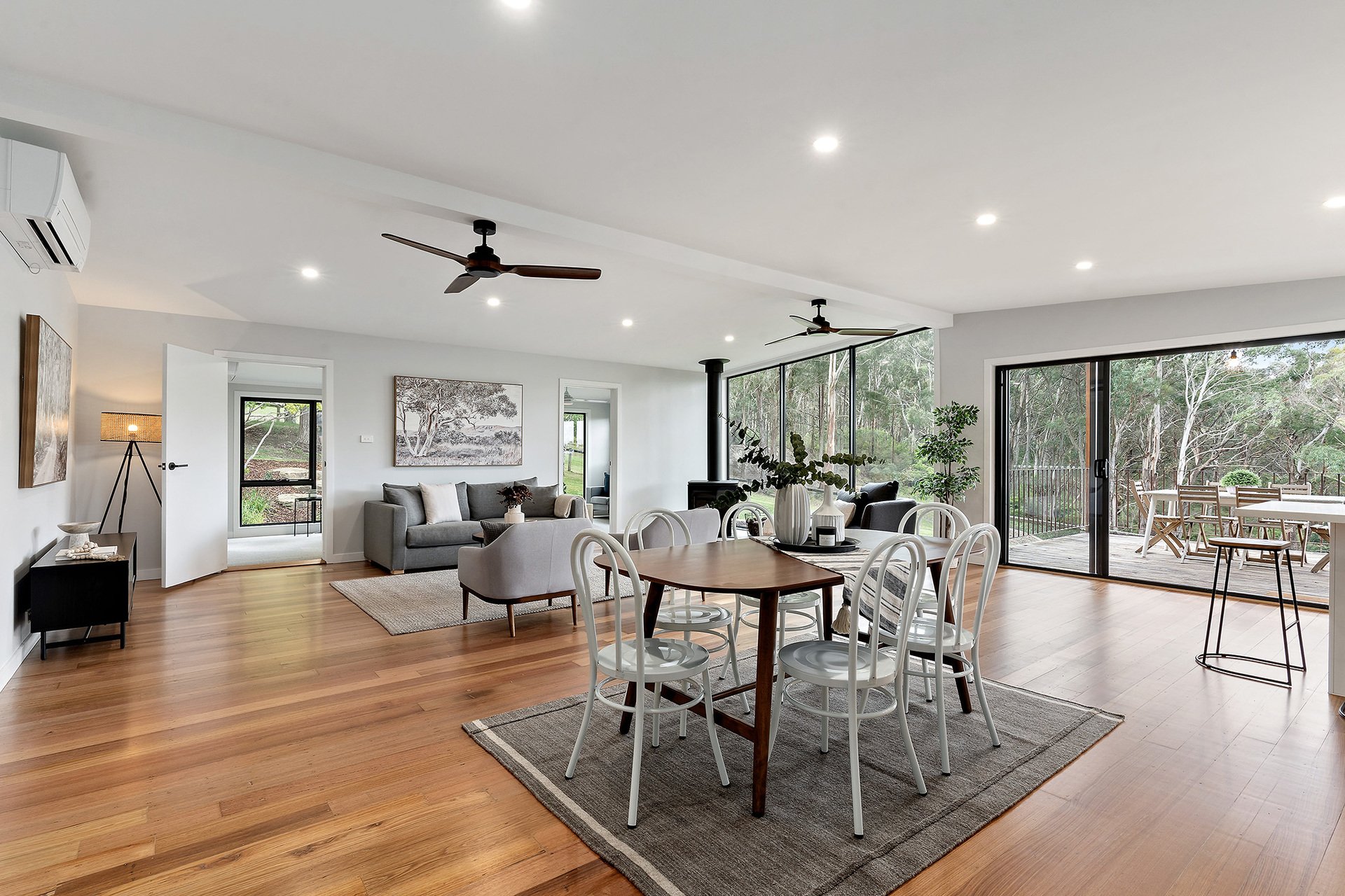 Rich reclaimed timber flooring sets a tone of understated luxury, grounding expansive open-concept living and dining zones adjoining a striking kitchen appointed with stone surfaces including a generous island servery, quality stainless steel appliances, and a substantial walk-in pantry-primed for hosting with style and ease.