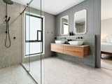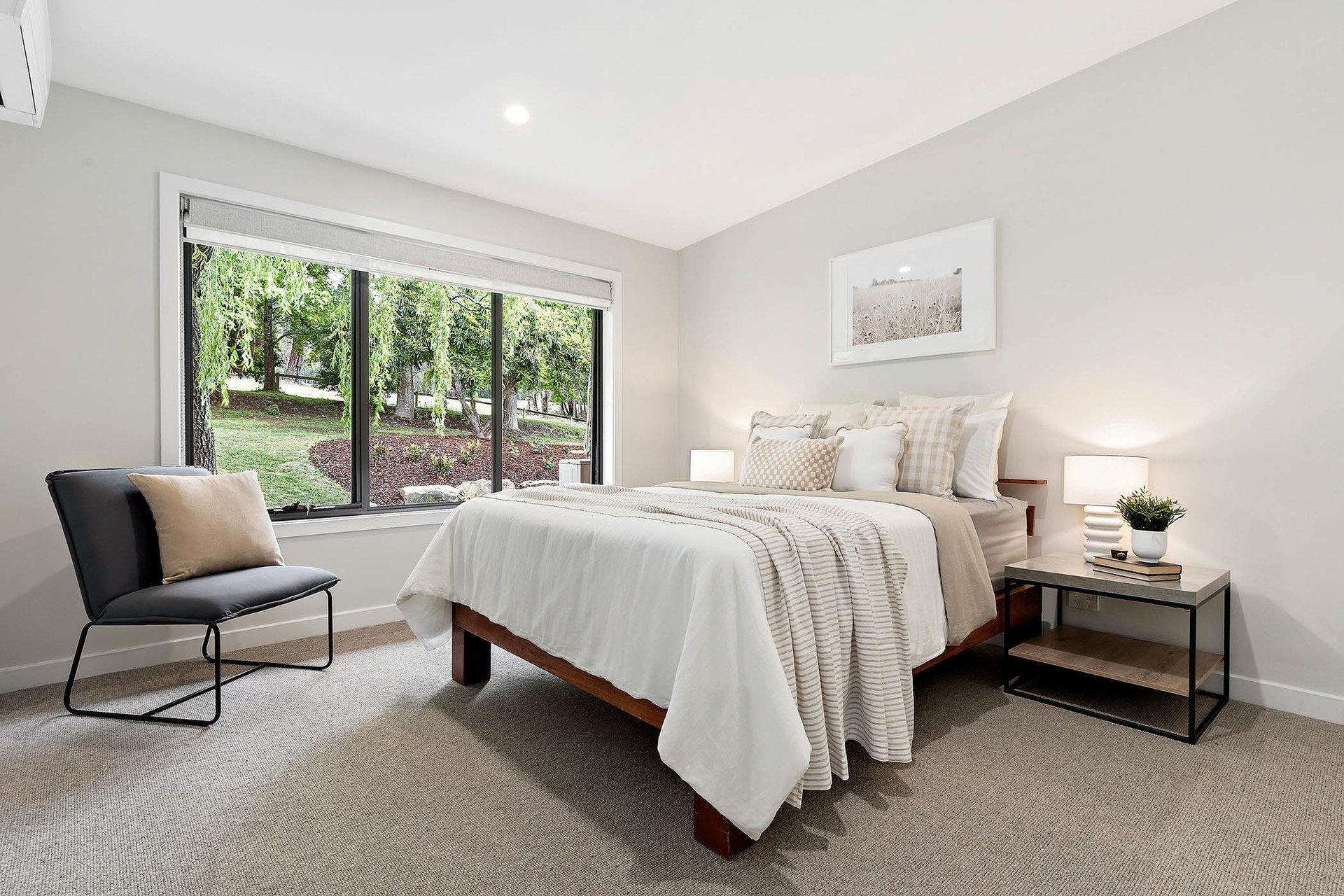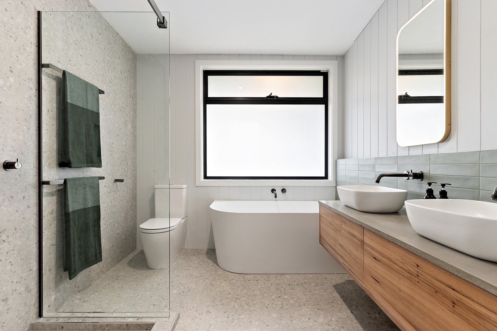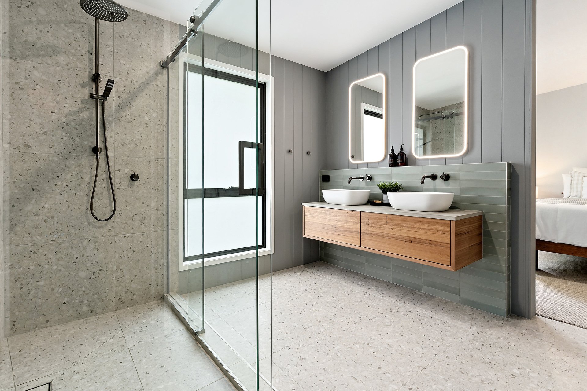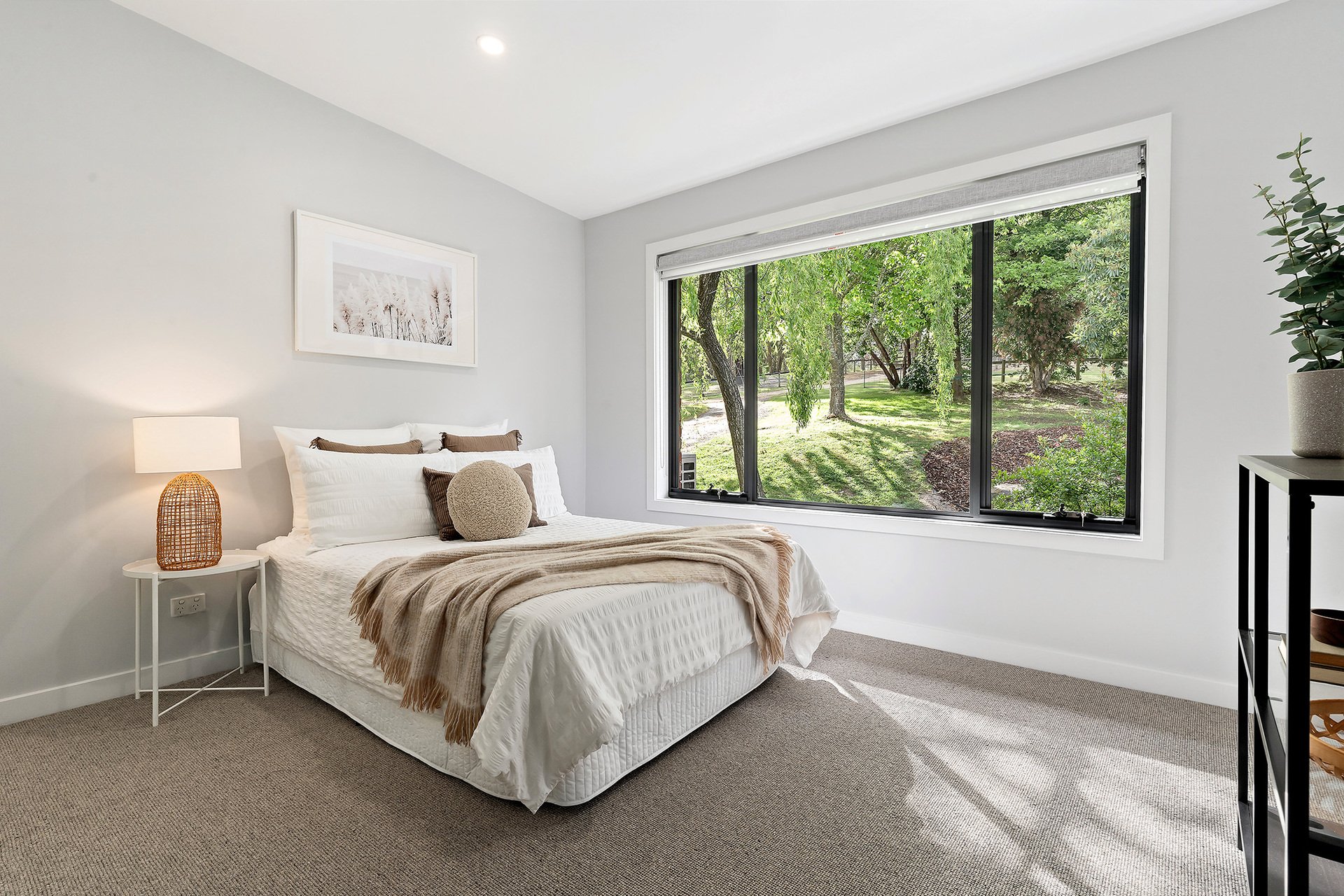 Accommodation comprises four well-proportioned bedrooms and two luxuriously appointed bathrooms, both enhanced with underfloor heating. The main suite is a private haven with a walk-in robe and elegant ensuite featuring a frameless-glass shower, twin-vanity, and matte black accents. A centrally placed main bathroom with a bath and shower continues the home's cohesive palette, while a powder room provides further convenience.