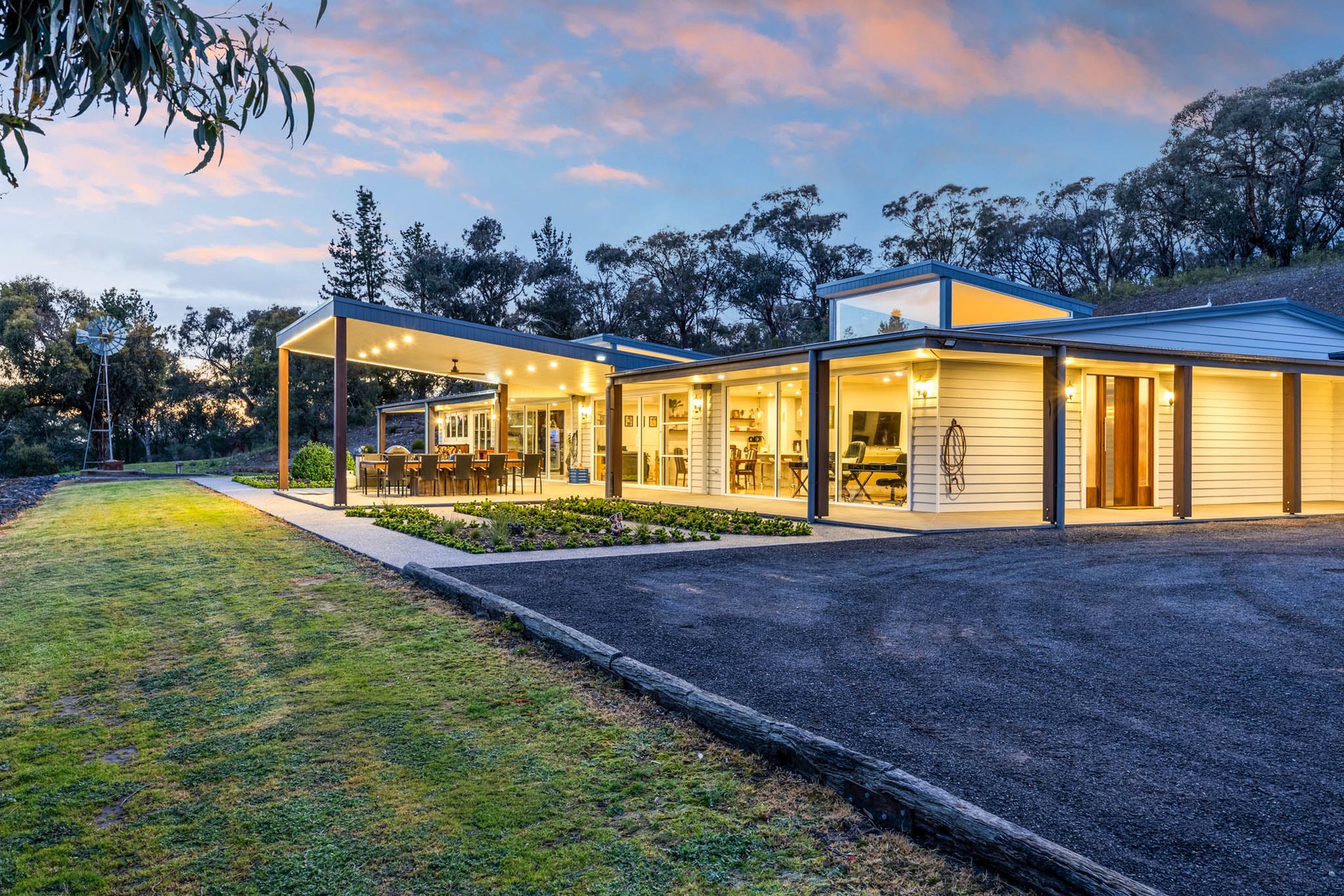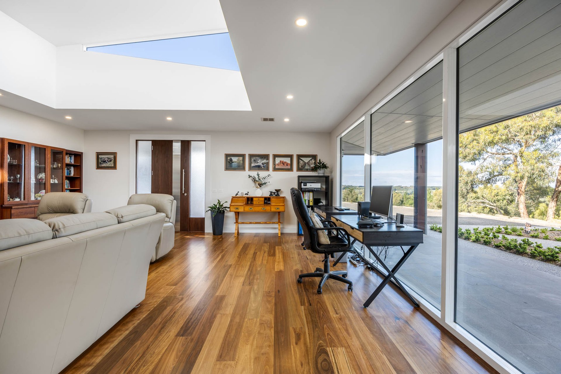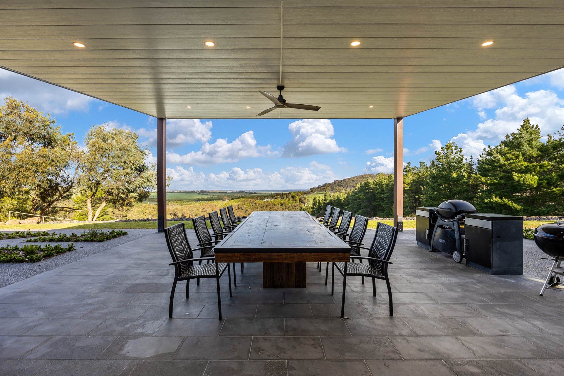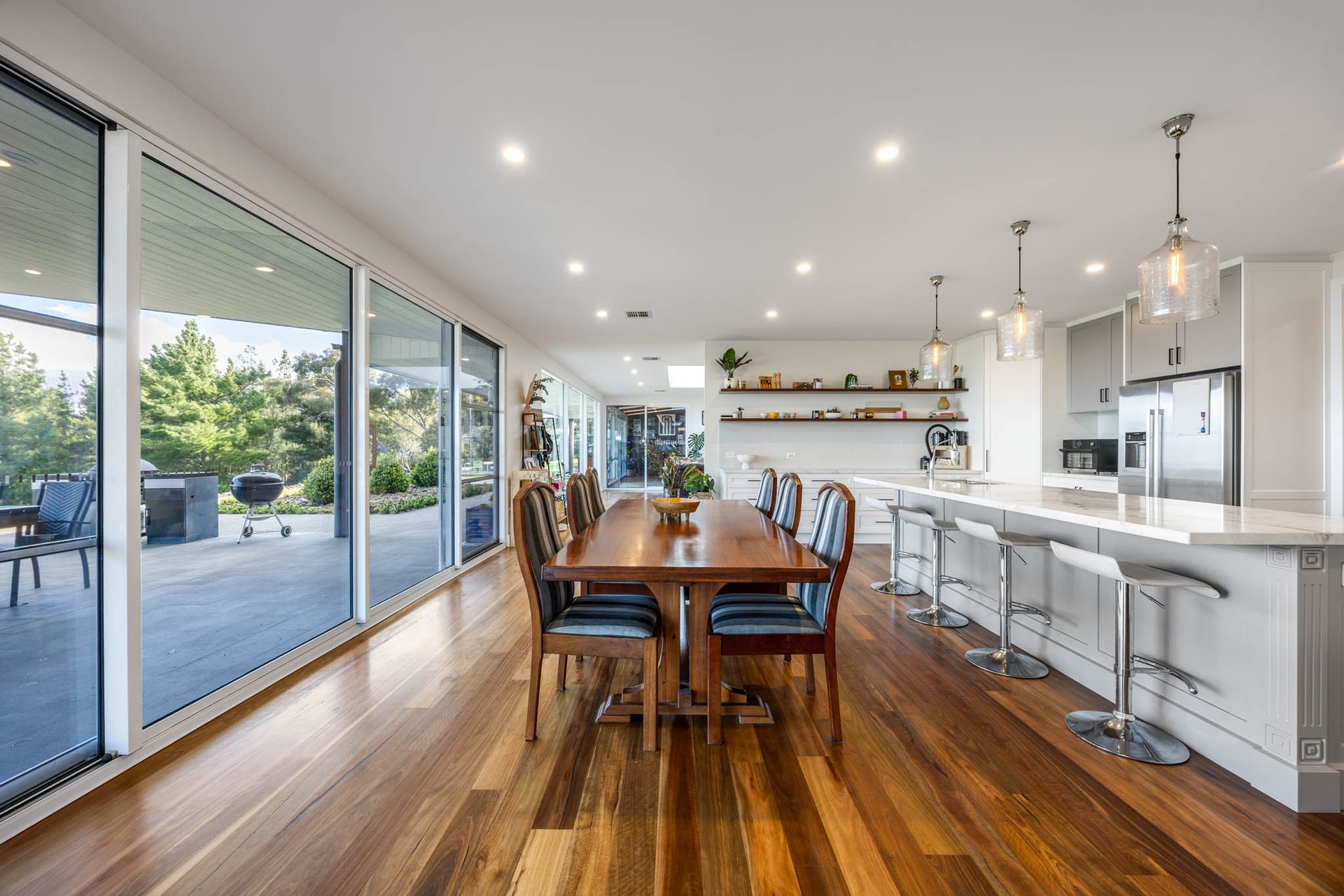 Expansive floor-to-ceiling glass invites the outdoors in, with living spaces flowing effortlessly to an alfresco deck of Australian bluestone and ironbark posts – ideal for large-scale entertaining or quiet evenings overlooking the gorgeous landscape.