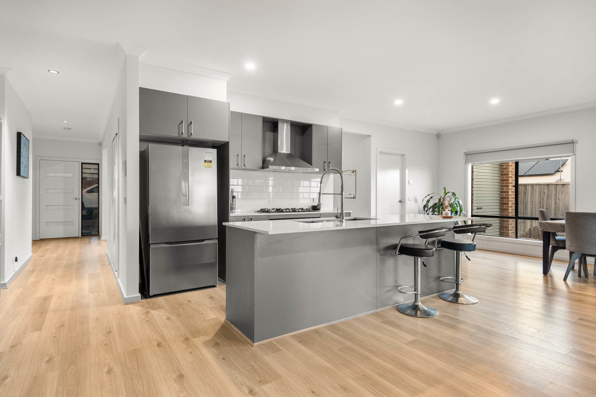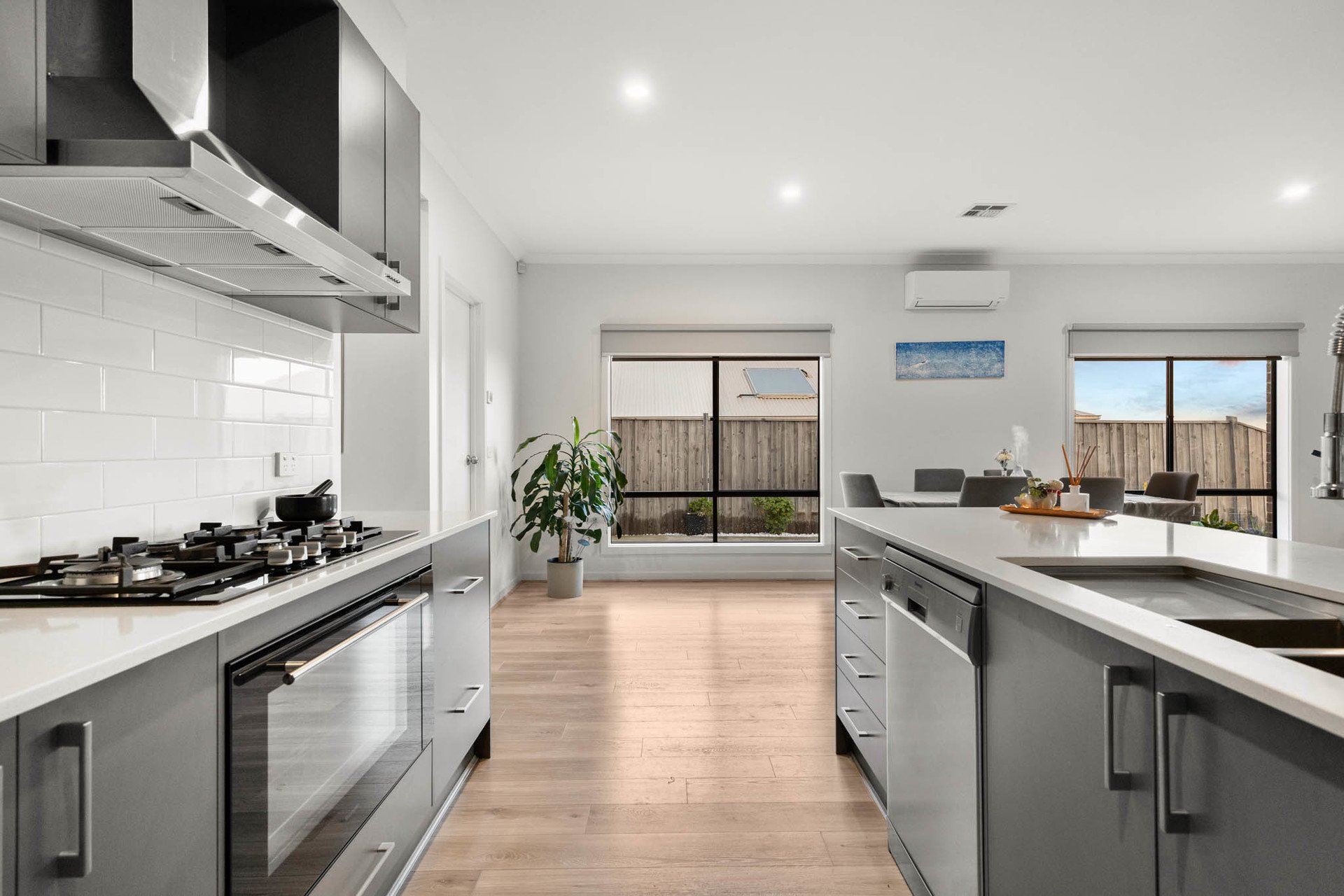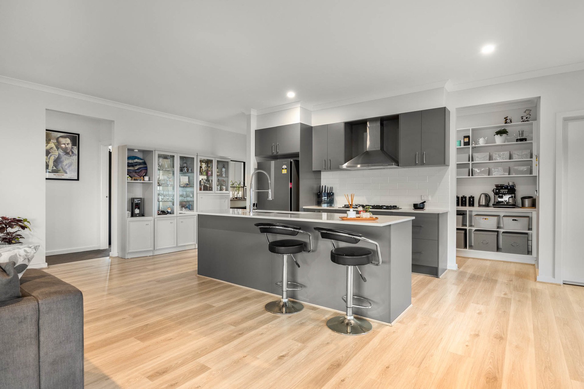 A carpeted frontage lounge precedes the open meals and living domain which form the central hub of the home. At its heart, a striking and highly functional designer kitchen is appointed with stone benchtops, undermount sinks, a subway-tiled splashback, soft-close drawers, fridge plumbing, and a full suite of Baumatic appliances including 900mm-wide cooking and a dishwasher, supported by a huge walk-in pantry.