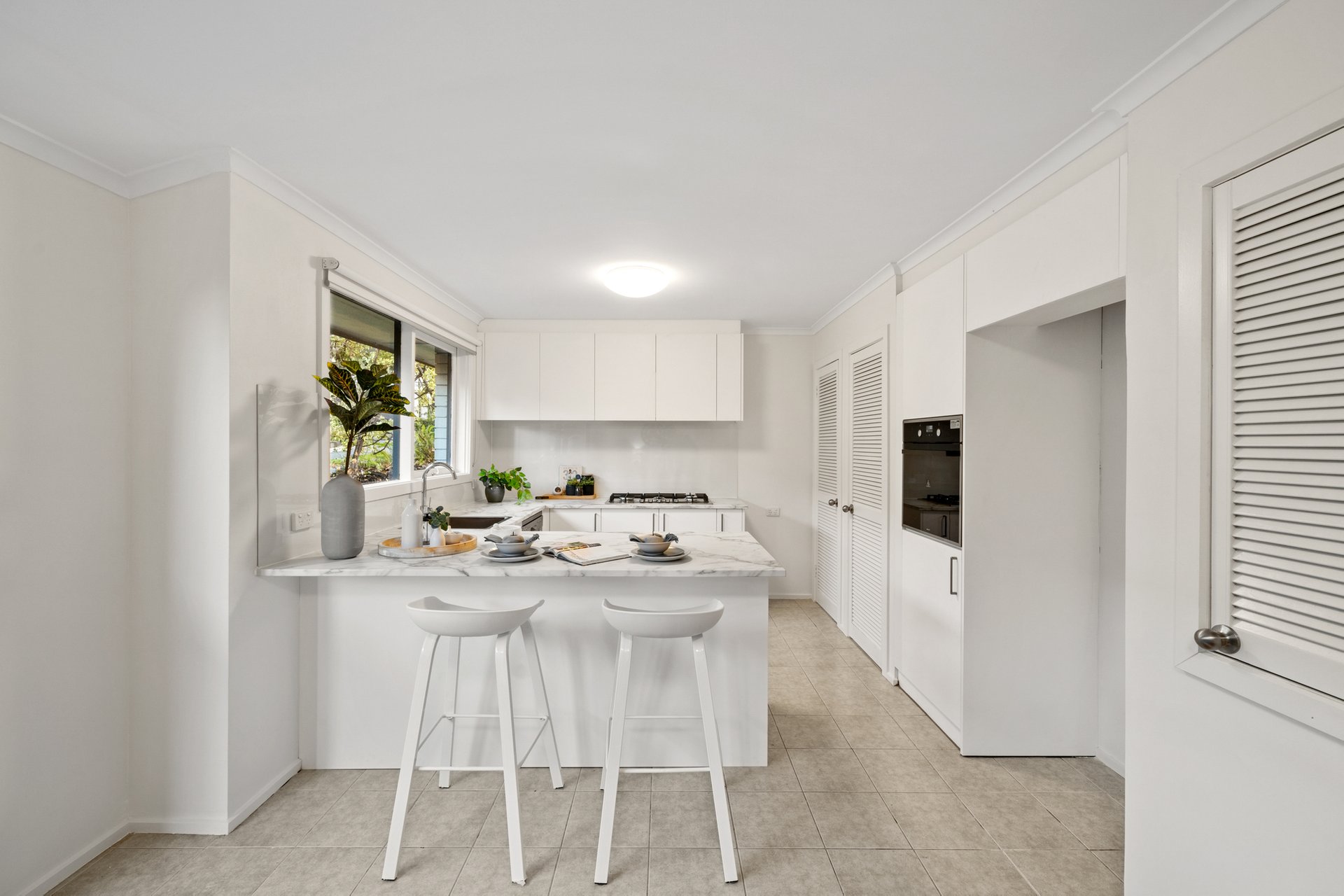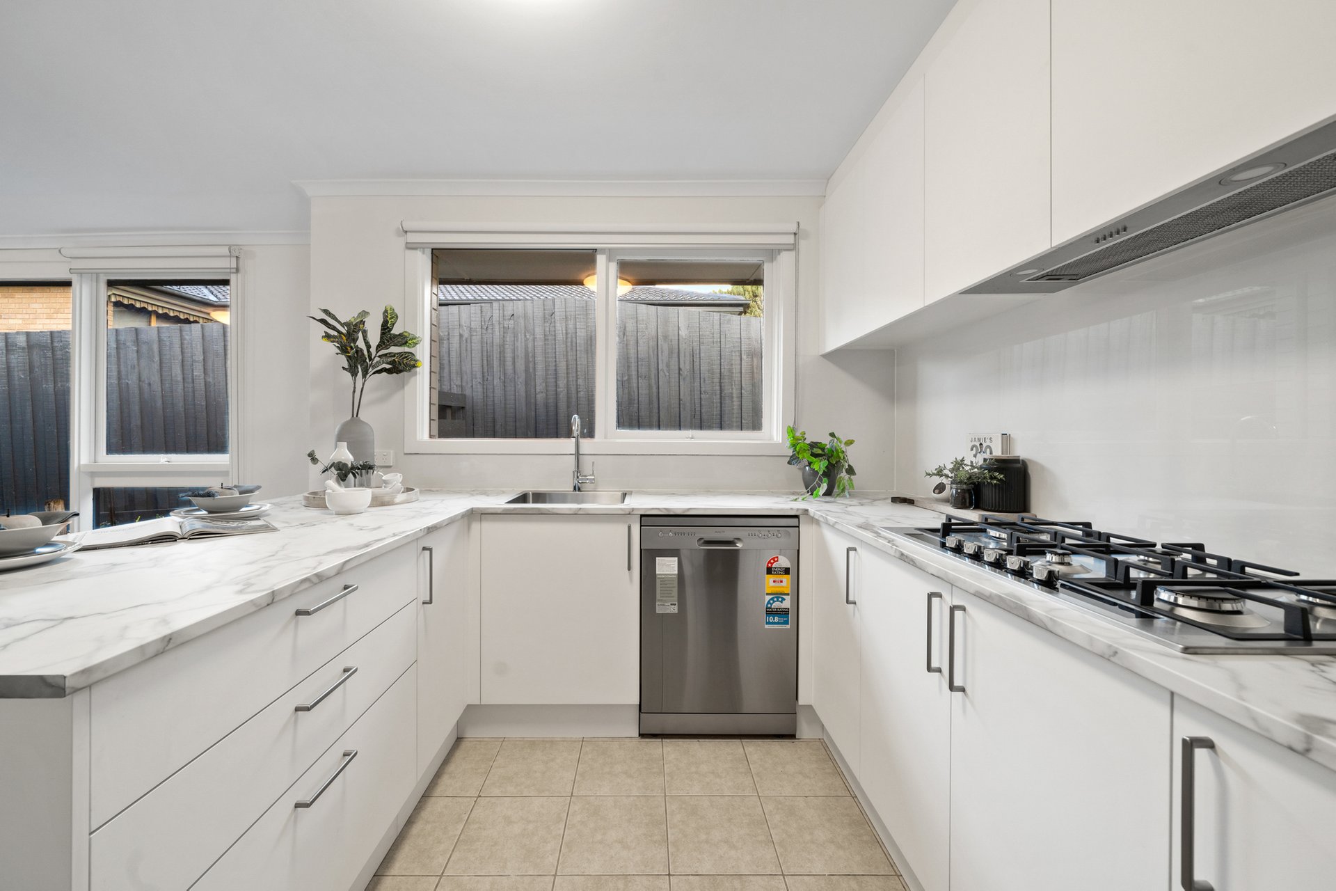 At the heart of the home, the contemporary kitchen is both stylish and functional, featuring marble-effect benchtops, quality stainless steel appliances including a 900mm gas cooktop, and a breakfast bar perfect for everyday living and entertaining.