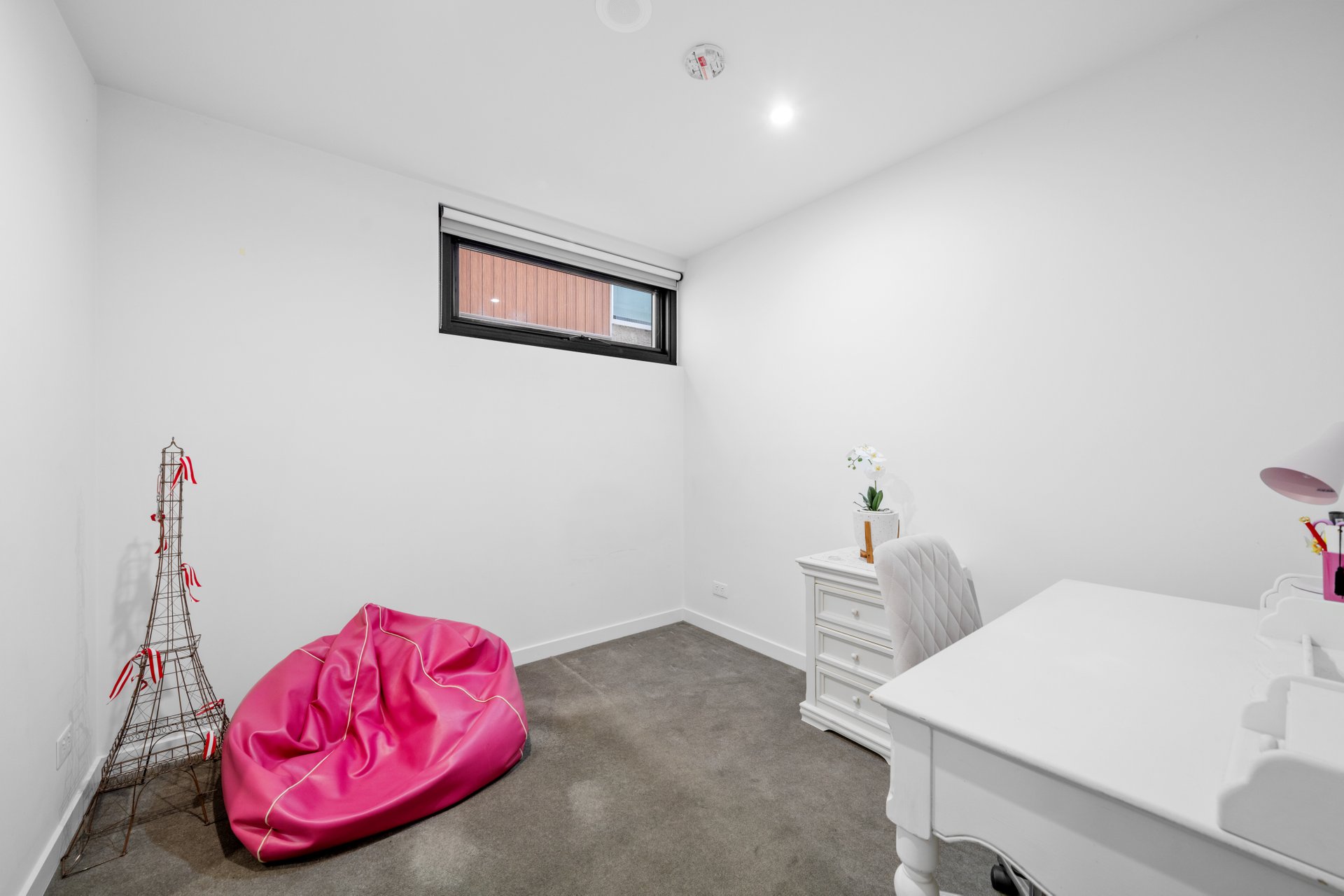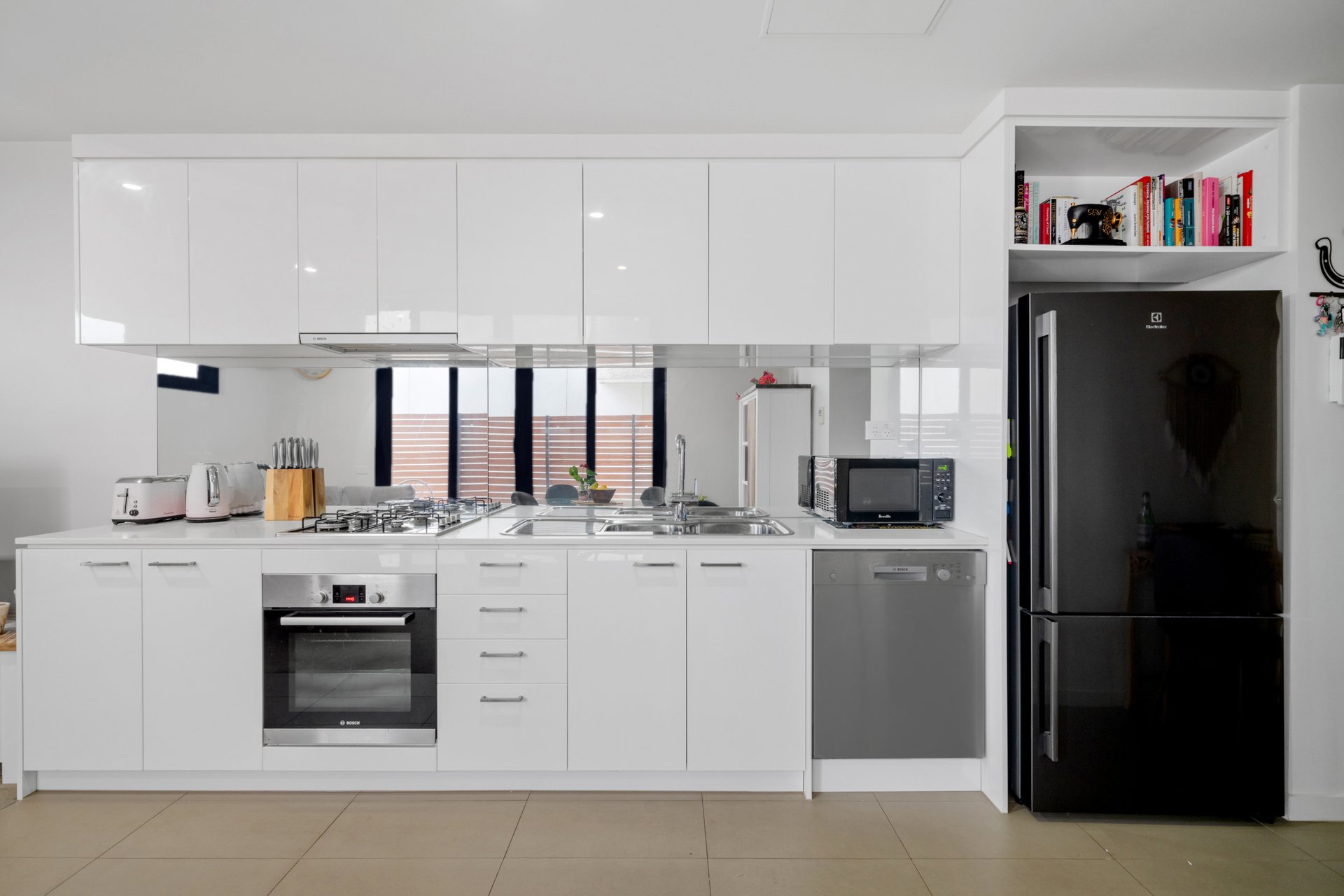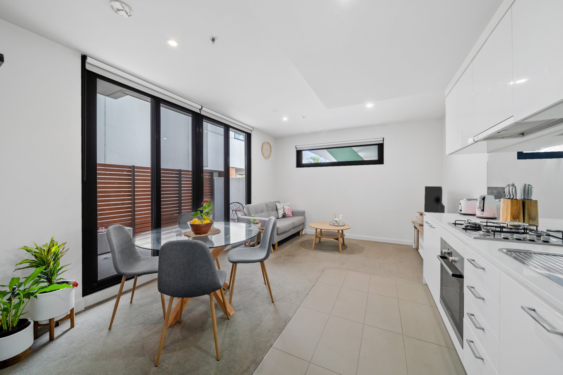 The open-plan living and dining area is designed to provide a welcoming and versatile space, complemented by an abundance of natural light and enhanced by ducted heating and cooling for year-round comfort. The sleek, contemporary kitchen boasts premium stainless steel appliances, including a dishwasher, elegant stone benchtops, and ample storage, making it ideal for both everyday cooking and entertaining.