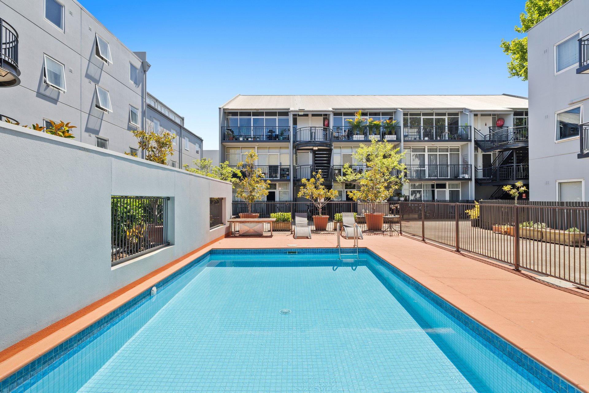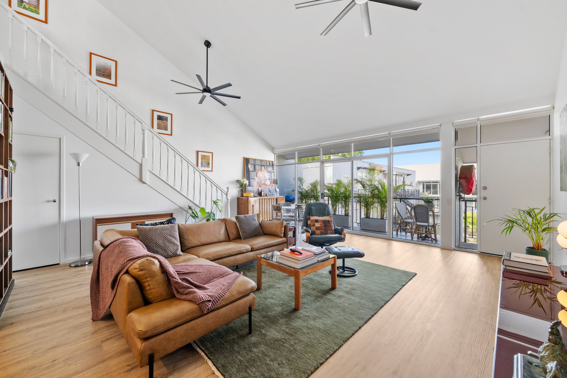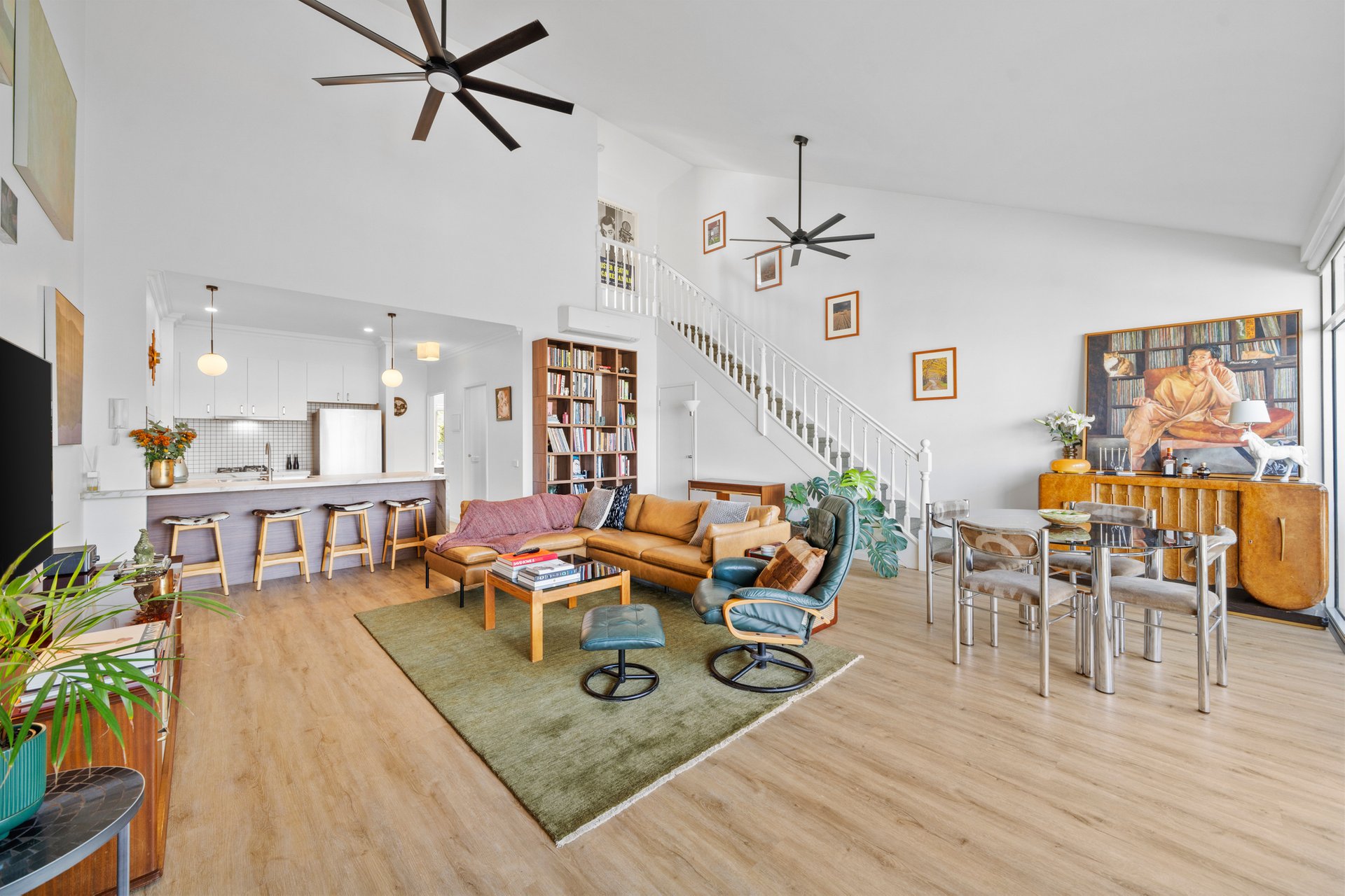 The open plan living and dining zone is the centrepiece of the home, enhanced by striking double height ceilings and full height glazing that floods the space with natural light. Sliding doors open to a private balcony, creating a seamless indoor outdoor connection with elevated views across the communal courtyard and swimming pool. Timber look flooring adds warmth and durability, while split system heating and cooling ensures year round comfort.