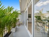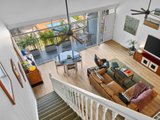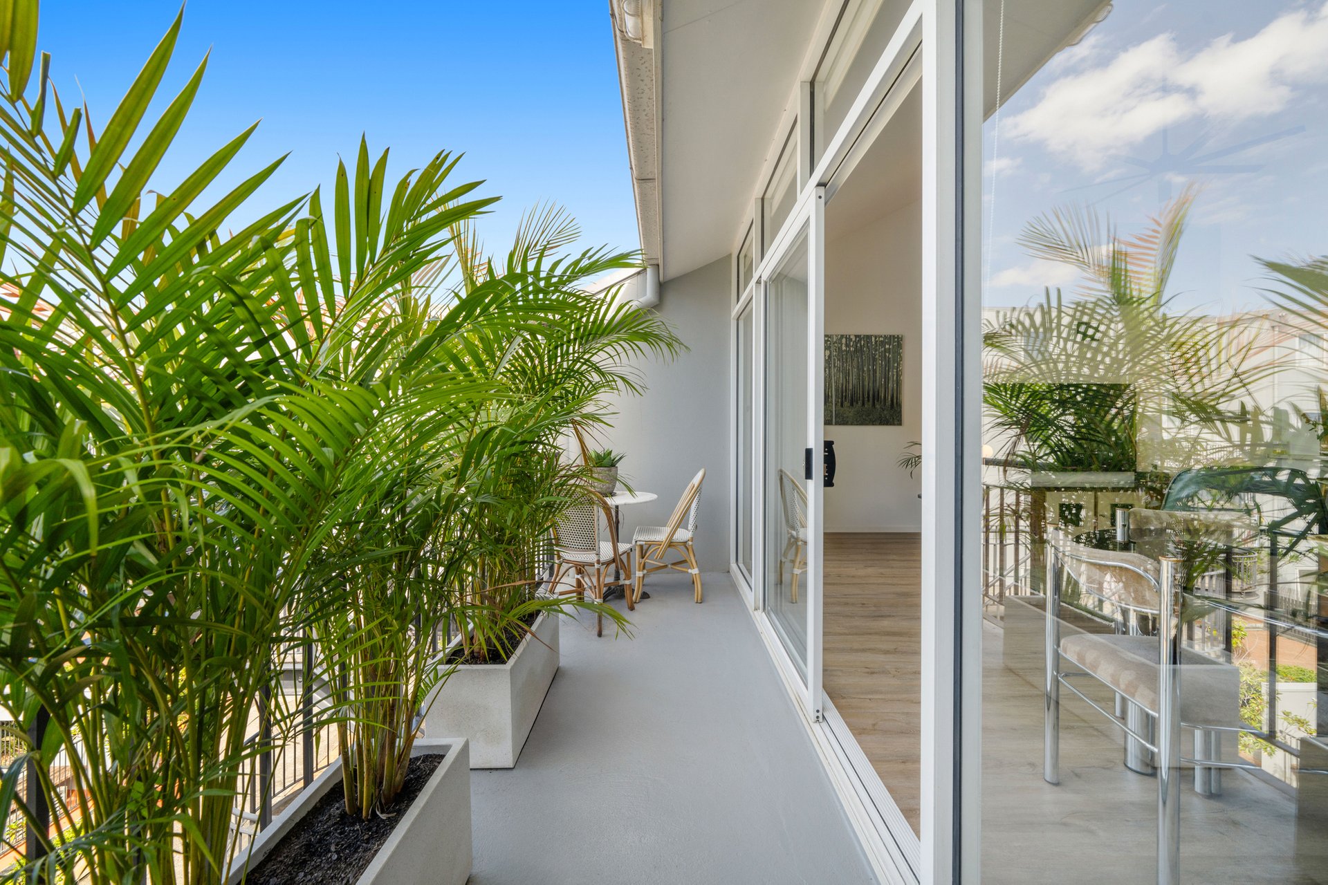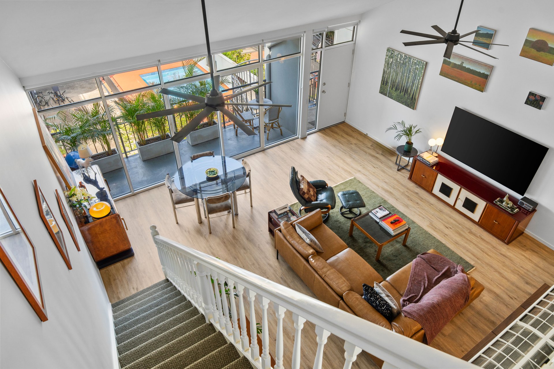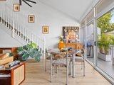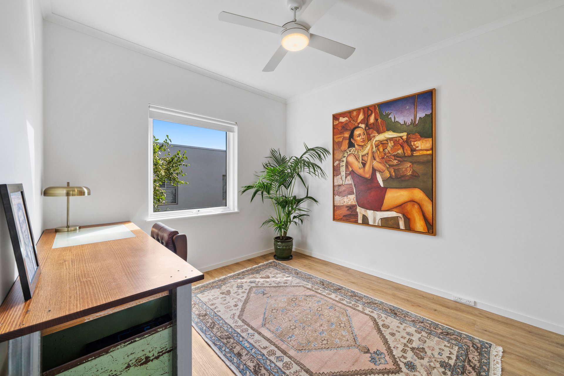 The open plan living and dining zone is the centrepiece of the home, enhanced by striking double height ceilings and full height glazing that floods the space with natural light. Sliding doors open to a private balcony, creating a seamless indoor outdoor connection with elevated views across the communal courtyard and swimming pool. Timber look flooring adds warmth and durability, while split system heating and cooling ensures year round comfort.