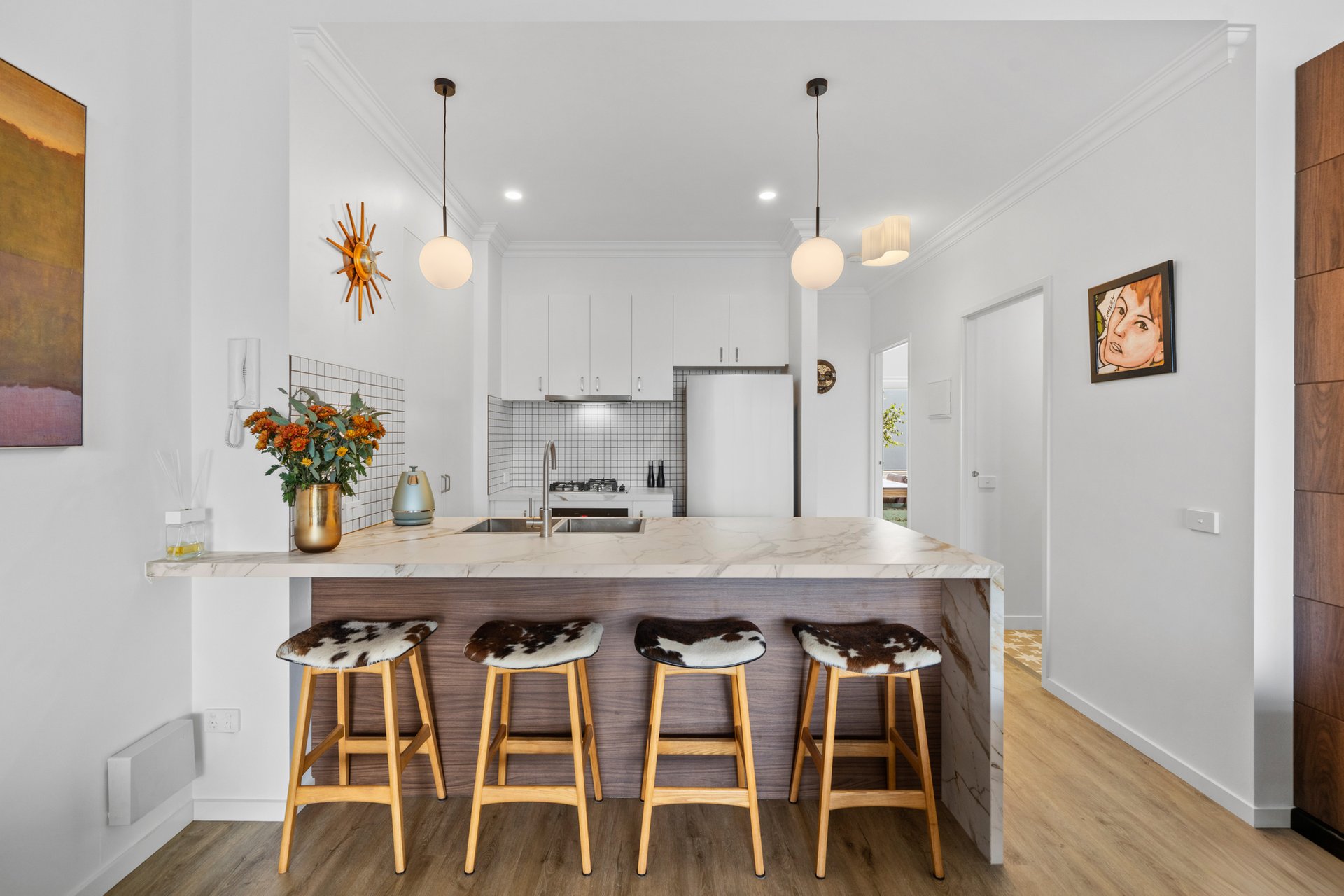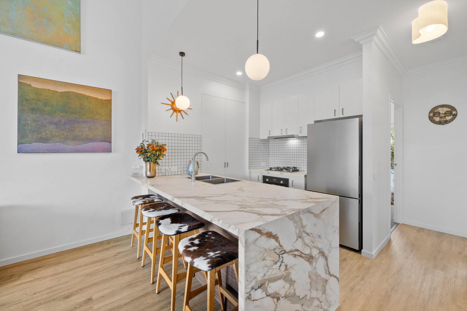 The modern kitchen is both functional and stylish, featuring a stone island bench with breakfast bar seating, Bosch appliances including a 4 burner gas cooktop, oven and dishwasher, plus generous full height cabinetry and overhead storage. Its open layout overlooks the living and dining area, making entertaining effortless.