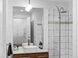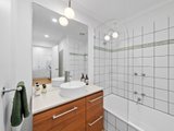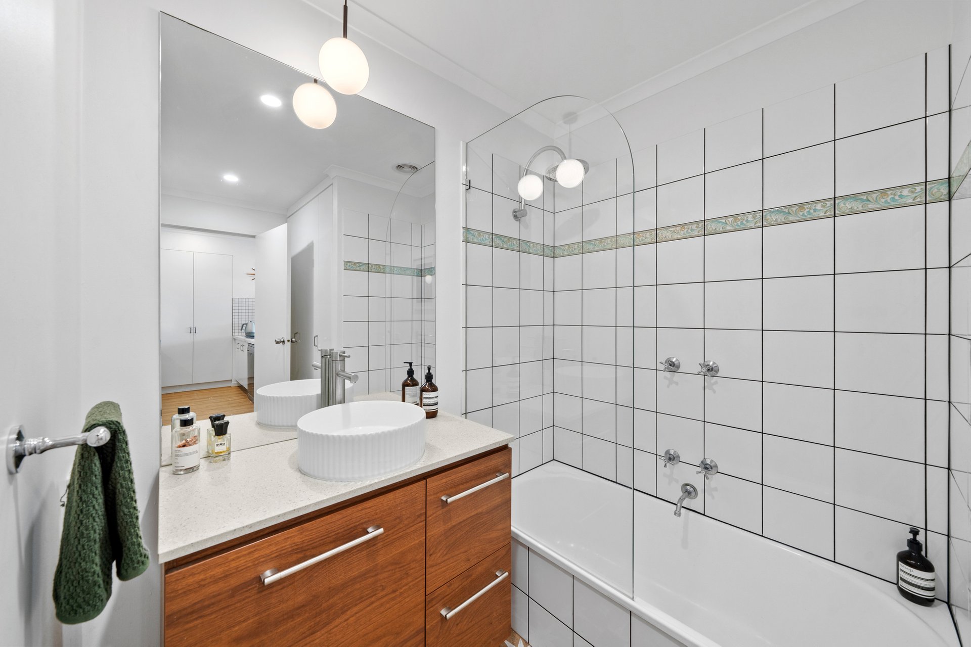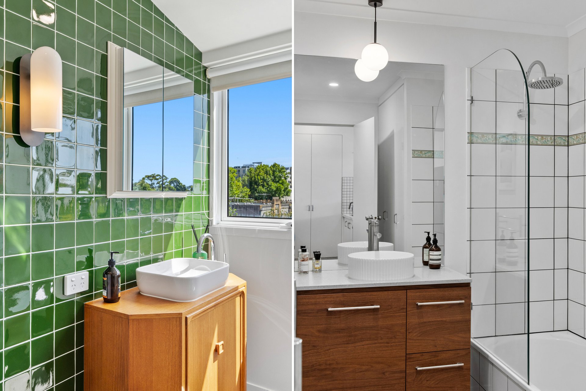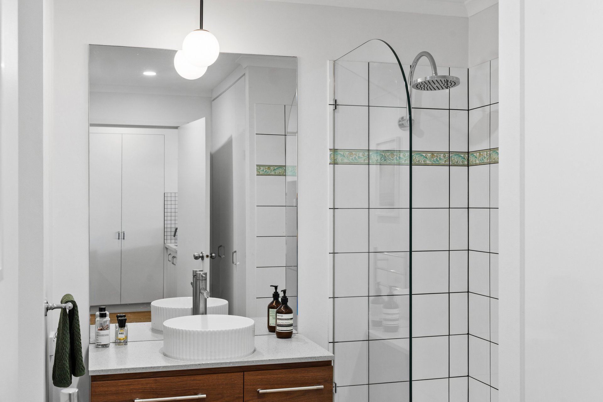 Two bathrooms are well separated across levels. The central downstairs bathroom includes a shower over bath, vanity, toilet and integrated laundry facilities, while the upstairs ensuite is bright and well ventilated.
