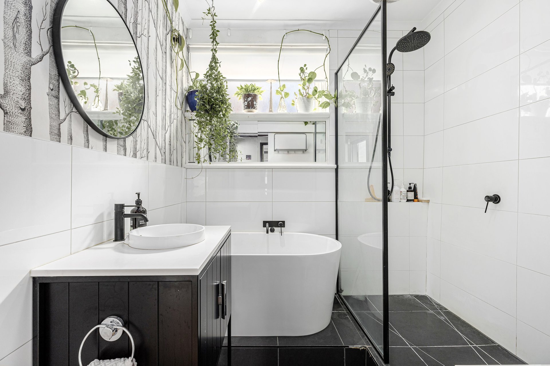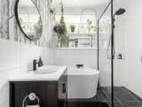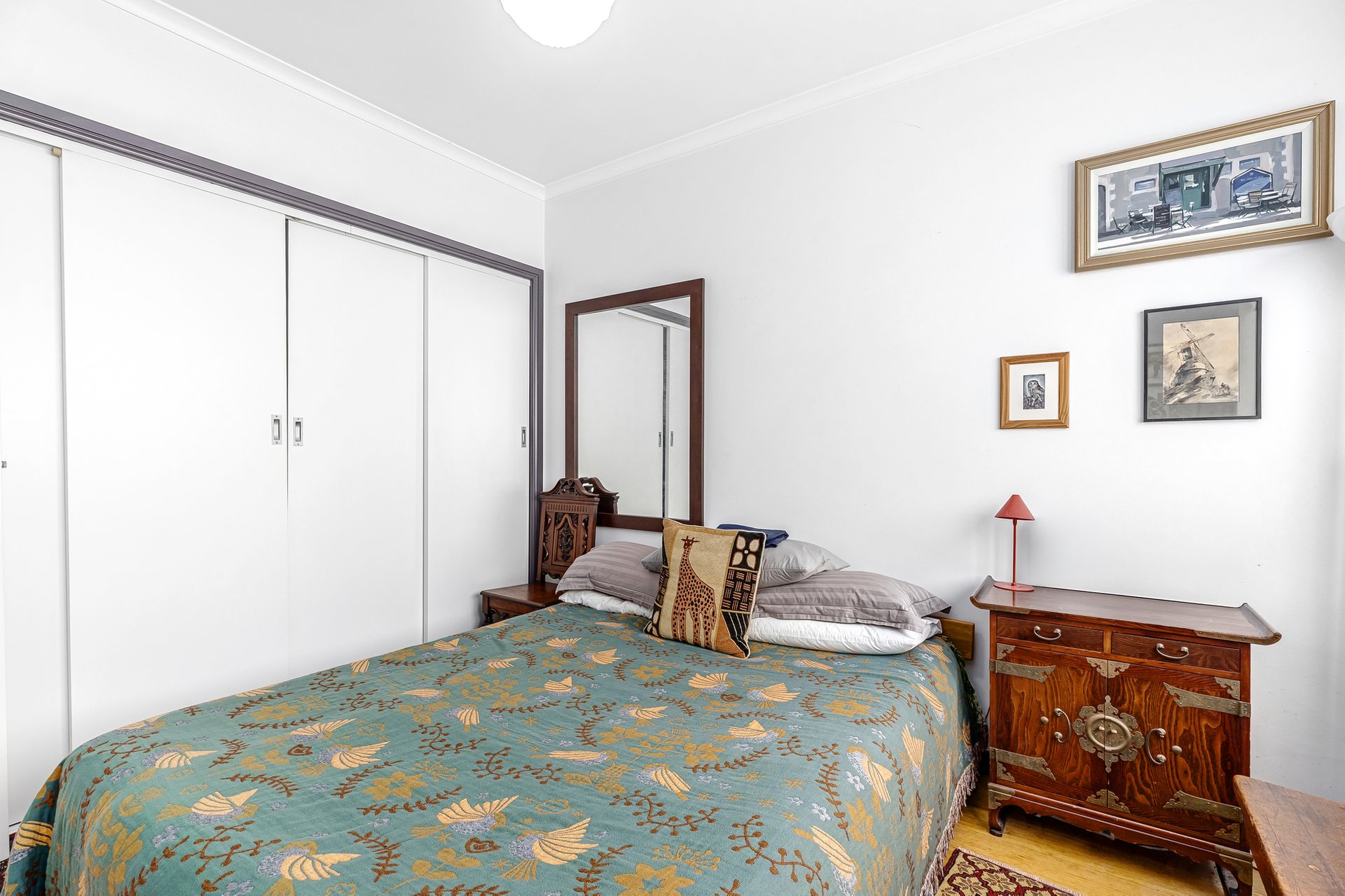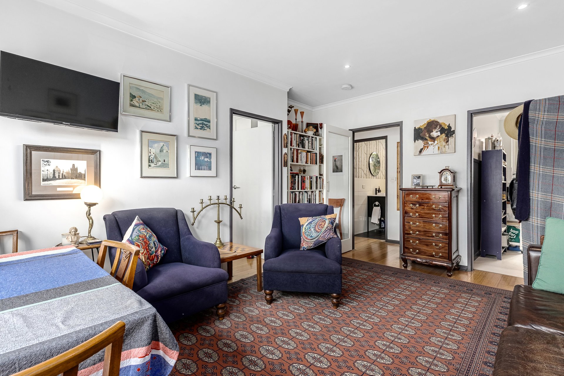 Two well-sized bedrooms are positioned for privacy and comfort, each complete with built-in robes and warm timber flooring. The central bathroom brings a fresh, contemporary feel with a full bathtub and clean modern finishes, while a cleverly integrated European laundry adds everyday practicality without compromising space.